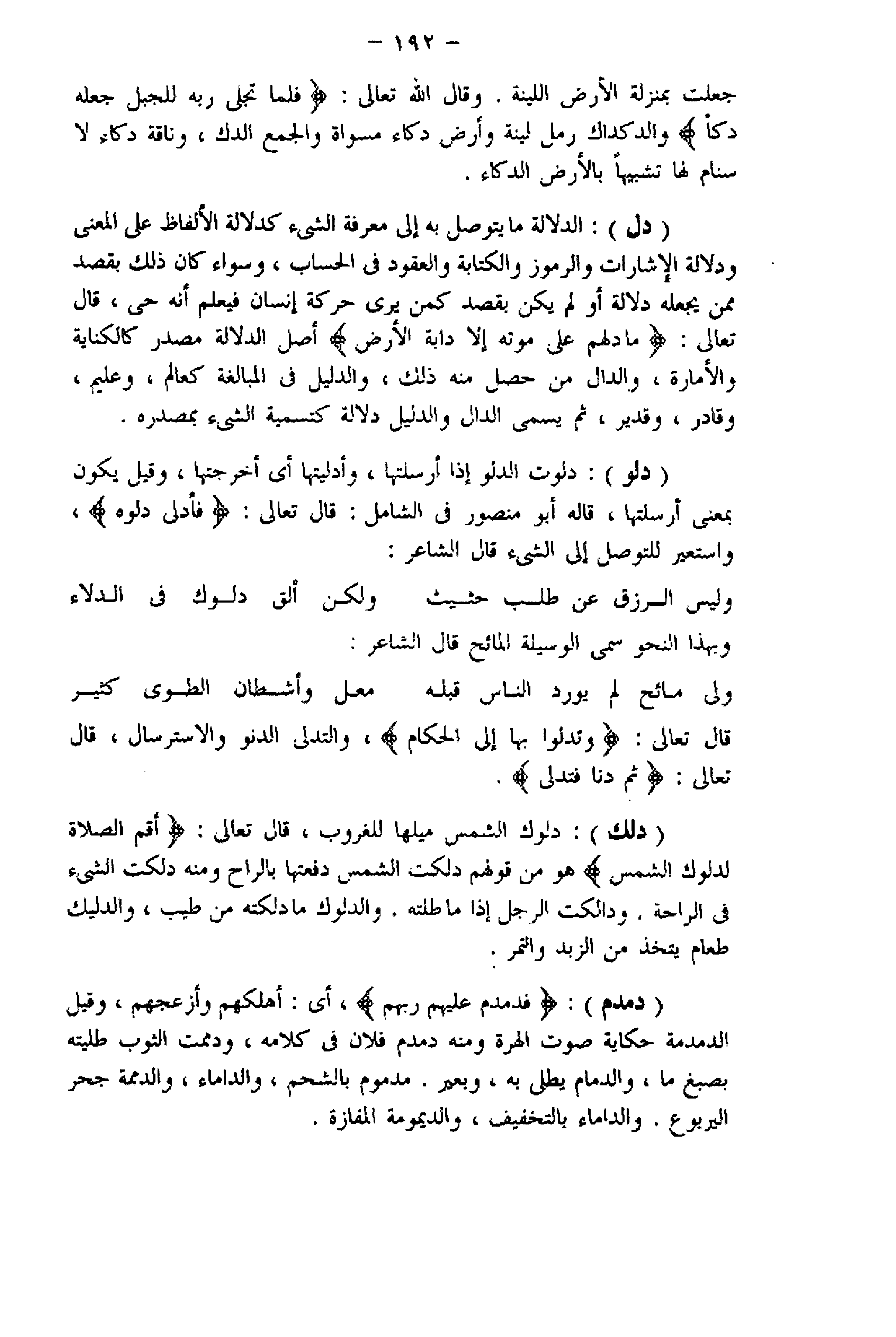 (دل) : الدلالة ما يتوصل به إلى معرفة الشيء كدلالة الألفاظ على المعنى ودلالة الإشارات والرموز والكتابة والعقود فى الحساب، وسواء كان ذلك بقصد ممن يجعله دلالة أو لم يكن بقصد كمن يرى حركة إنسان فيعلم أنه حى، قال تعالى: ما دَلَّهُمْ عَلى مَوْتِهِ إِلَّا دَابَّةُ الْأَرْضِ أصل الدلالة مصدر كالكناية والأمارة، والدال من حصل منه ذلك، والدليل فى المبالغة كعالم، وعليم، وقادر، وقدير، ثم يسمى الدال والدليل دلالة كتسمية الشيء بمصدره.