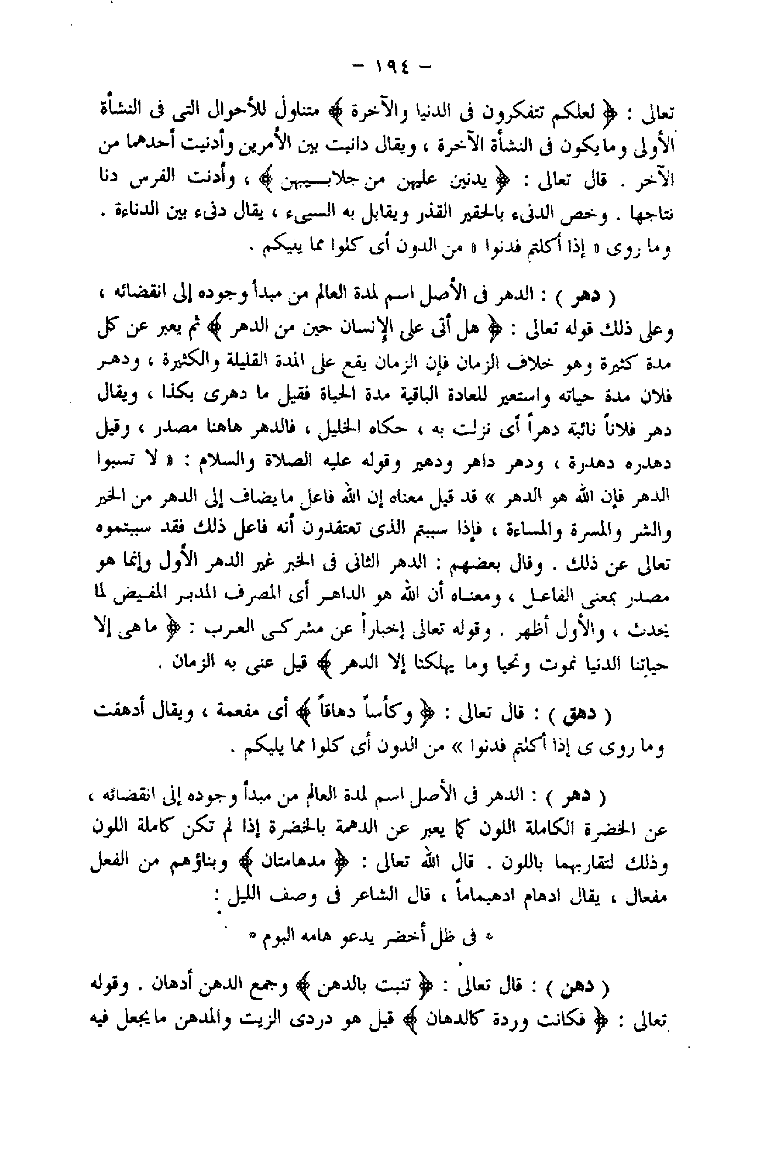 (دهر) : الدهر فى الأصل اسم لمدة العالم من مبدأ وجوده إلى انقضائه، عن الخضرة الكاملة اللون كما يعبر عن الدهمة بالخضرة إذا لم تكن كاملة اللون وذلك لتقاربهما باللون. قال اللَّه تعالى: مُدْهامَّتانِ وبناؤهم من الفعل مفعال، يقال ادهام ادهيماما، قال الشاعر فى وصف الليل:
