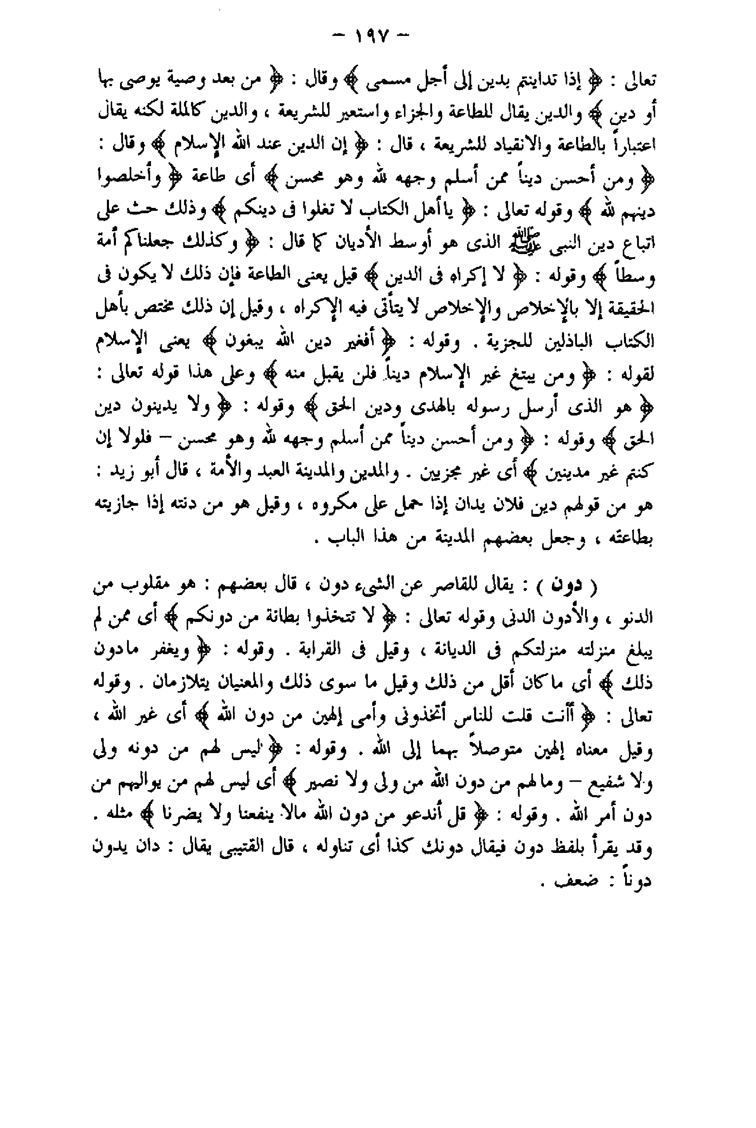 وَمَنْ أَحْسَنُ دِيناً مِمَّنْ أَسْلَمَ وَجْهَهُ لِلَّهِ وَهُوَ مُحْسِنٌ أي طاعة وَأَخْلَصُوا دِينَهُمْ لِلَّهِ وقوله تعالى: يا أَهْلَ الْكِتابِ لا تَغْلُوا فِي دِينِكُمْ وذلك حث على اتباع دين النبي صلّى اللَّه عليه وسلّم الذي هو أوسط الأديان كما قال: وَكَذلِكَ جَعَلْناكُمْ أُمَّةً وَسَطاً وقوله: لا إِكْراهَ فِي الدِّينِ قيل يعنى الطاعة فإن ذلك لا يكون فى الحقيقة إلا بالإخلاص والإخلاص لا يتأتى فيه الإكراه، وقيل إن ذلك مختص بأهل الكتاب الباذلين للجزية. وقوله: أَفَغَيْرَ دِينِ اللَّهِ يَبْغُونَ يعنى الإسلام لقوله: وَمَنْ يَبْتَغِ غَيْرَ الْإِسْلامِ دِيناً فَلَنْ يُقْبَلَ مِنْهُ وعلى هذا قوله تعالى: