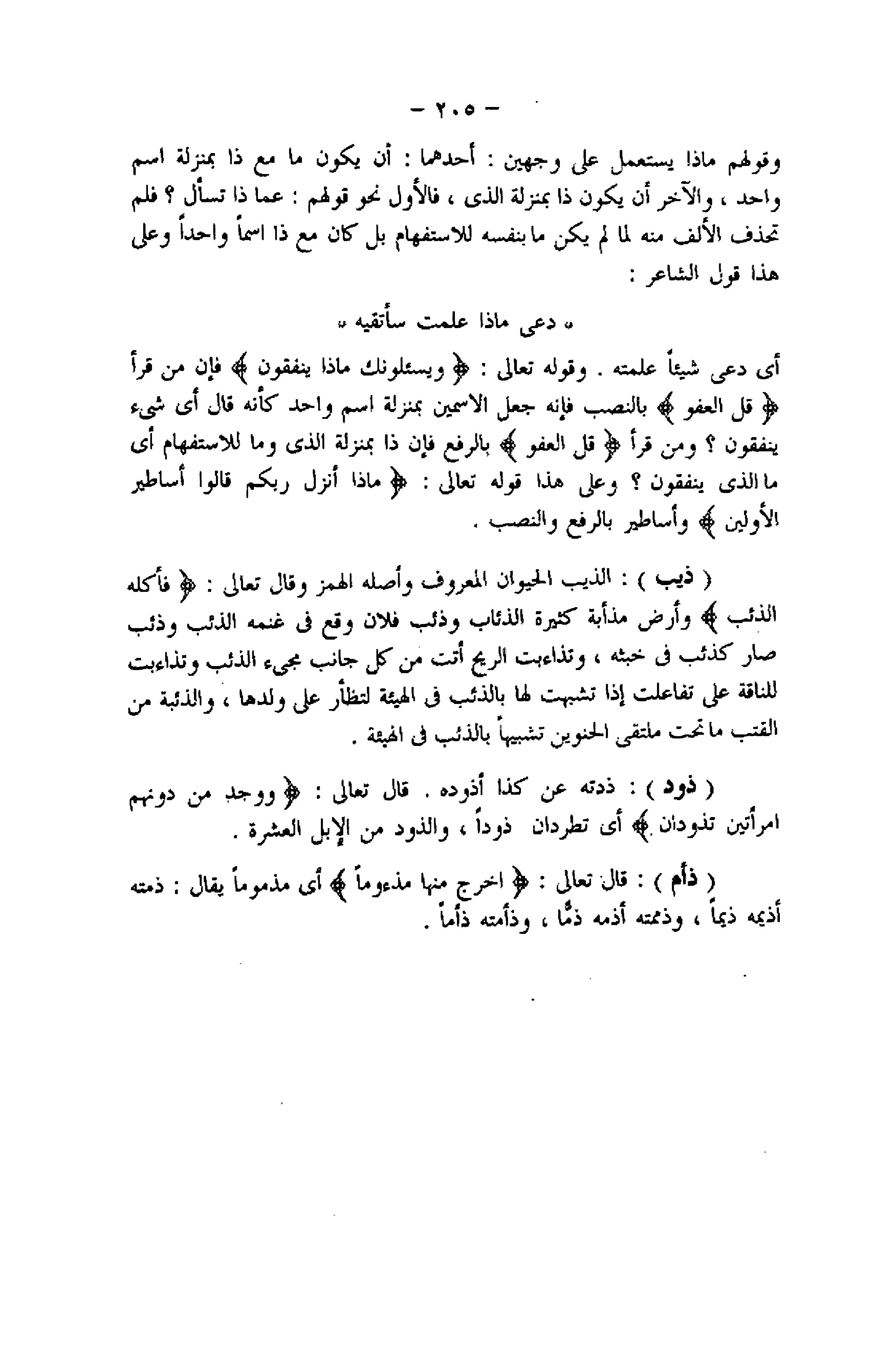 أي دعى شيئا علمته. وقوله تعالى: وَيَسْئَلُونَكَ ماذا يُنْفِقُونَ فإن من قرأ قُلِ الْعَفْوَ بالنصب فإنه جعل الاسمين بمنزلة اسم واحد كأنه قال أي شىء ينفقون؟ ومن قرأ قُلِ الْعَفْوَ بالرفع فإن ذا بمنزلة الذي وما للاستفهام أي ما الذي ينفقون؟ وعلى هذا قوله تعالى: ماذا أَنْزَلَ رَبُّكُمْ قالُوا أَساطِيرُ الْأَوَّلِينَ وأساطير بالرفع والنصب.