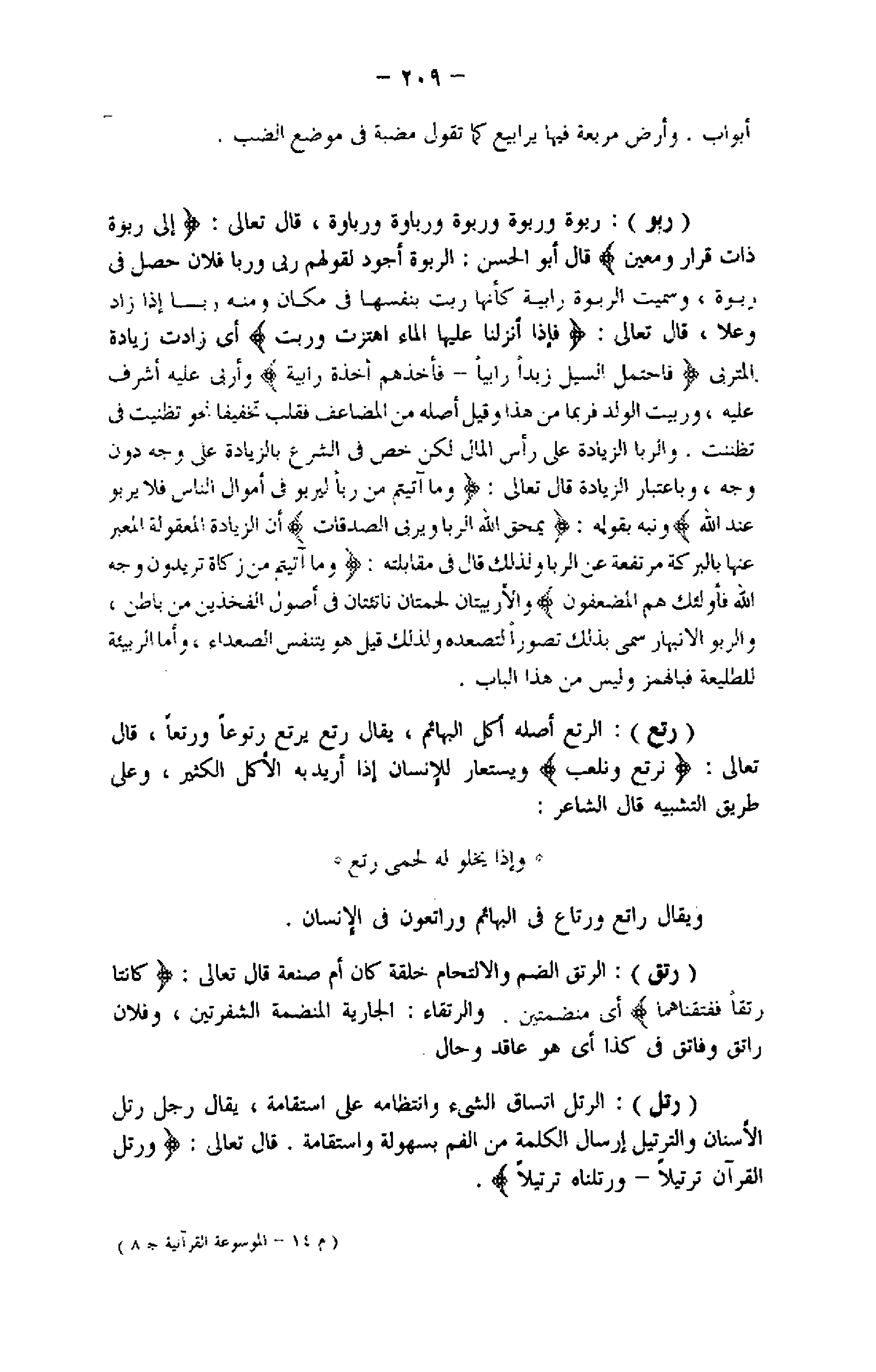 (ربو) : ربوة وربوة وربوة ورباوة ورباوة، قال تعالى: إِلى رَبْوَةٍ ذاتِ قَرارٍ وَمَعِينٍ قال أبو الحسن: الربوة أجود لقولهم ربى وربا فلان حصل فى ربوة، وسميت الربوة رابية كأنها ربت بنفسها فى مكان ومنه ربا إذا زاد وعلا، قال تعالى: فَإِذا أَنْزَلْنا عَلَيْهَا الْماءَ اهْتَزَّتْ وَرَبَتْ أي زادت زيادة المتربى فَاحْتَمَلَ السَّيْلُ زَبَداً رابِياً- فَأَخَذَهُمْ أَخْذَةً رابِيَةً وأربى عليه أشرف عليه، وربيت الولد فربما من هذا وقيل أصله من المضاعف فقلب تخفيفا نحو تظنيت فى تظننت. والربا الزيادة على رأس المال لكن خص فى الشرع بالزيادة على وجه دون وجه، وباعتبار الزيادة قال تعالى: وَما آتَيْتُمْ مِنْ رِباً لِيَرْبُوَا فِي أَمْوالِ النَّاسِ فَلا يَرْبُوا عِنْدَ اللَّهِ ونبه بقوله: يَمْحَقُ اللَّهُ الرِّبا وَيُرْبِي الصَّدَقاتِ أن الزيادة المعقولة المعبر عنها بالبركة مرتفعة عن الربا ولذلك قال فى مقابلته: وَما آتَيْتُمْ مِنْ زَكاةٍ تُرِيدُونَ وَجْهَ اللَّهِ فَأُولئِكَ هُمُ الْمُضْعِفُونَ والأربيتان لحمتان ناتئتان فى أصول الفخذين من باطن، والربو الانبهار سمى بذلك تصورا لتصعده ولذلك قيل هو يتنفس الصعداء، وأما الربيئة للطيعة فبالهمز وليس من هذا الباب.