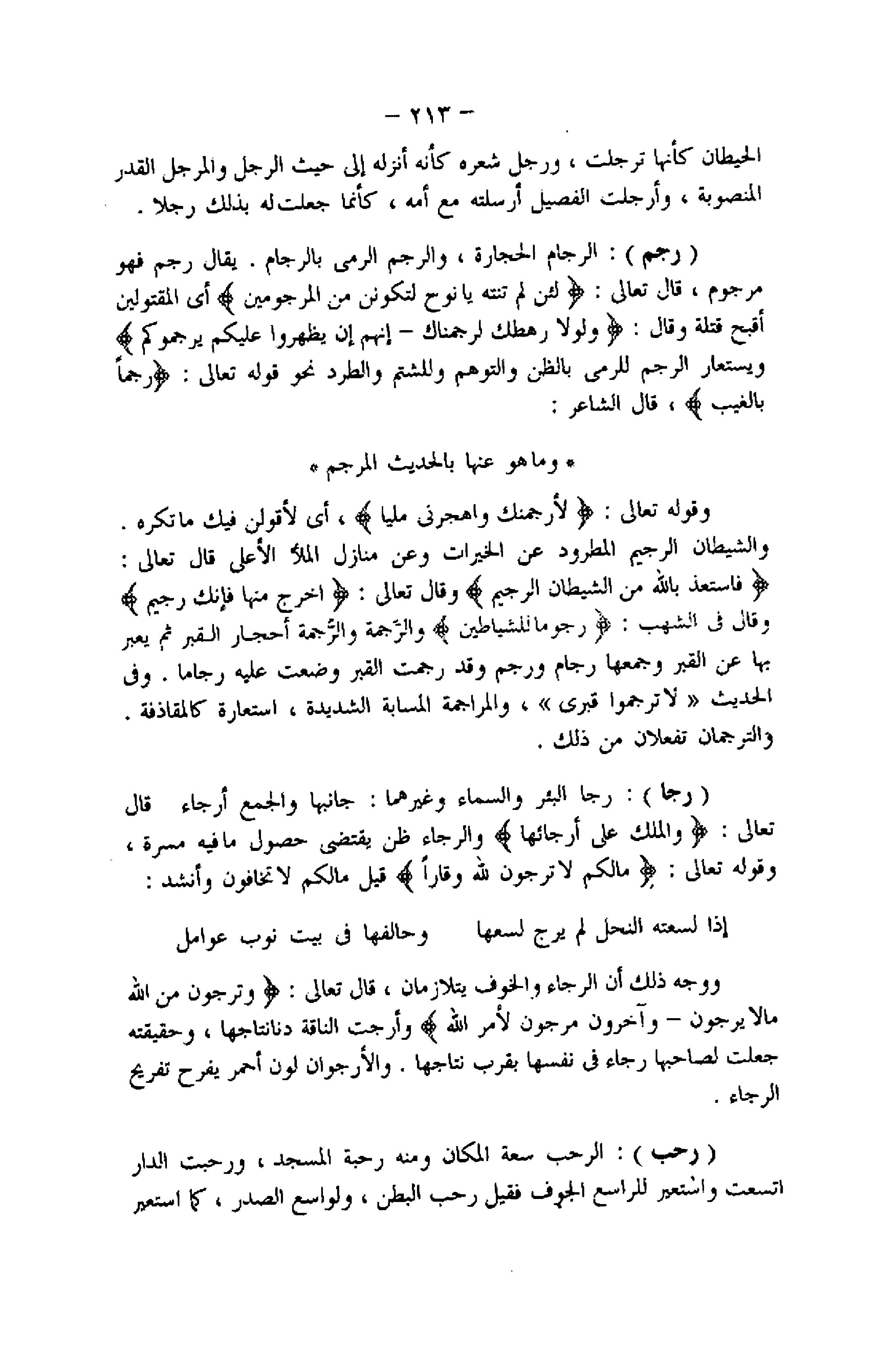 فَاسْتَعِذْ بِاللَّهِ مِنَ الشَّيْطانِ الرَّجِيمِ وقال تعالى: فَاخْرُجْ مِنْها فَإِنَّكَ رَجِيمٌ وقال فى الشهب: رُجُوماً لِلشَّياطِينِ والرّجمة والرّجمة أحجار القبر ثم يعبر بها عن القبر وجمعها رجام ورجم وقد رجمت القبر وضعت عليه رجاما.