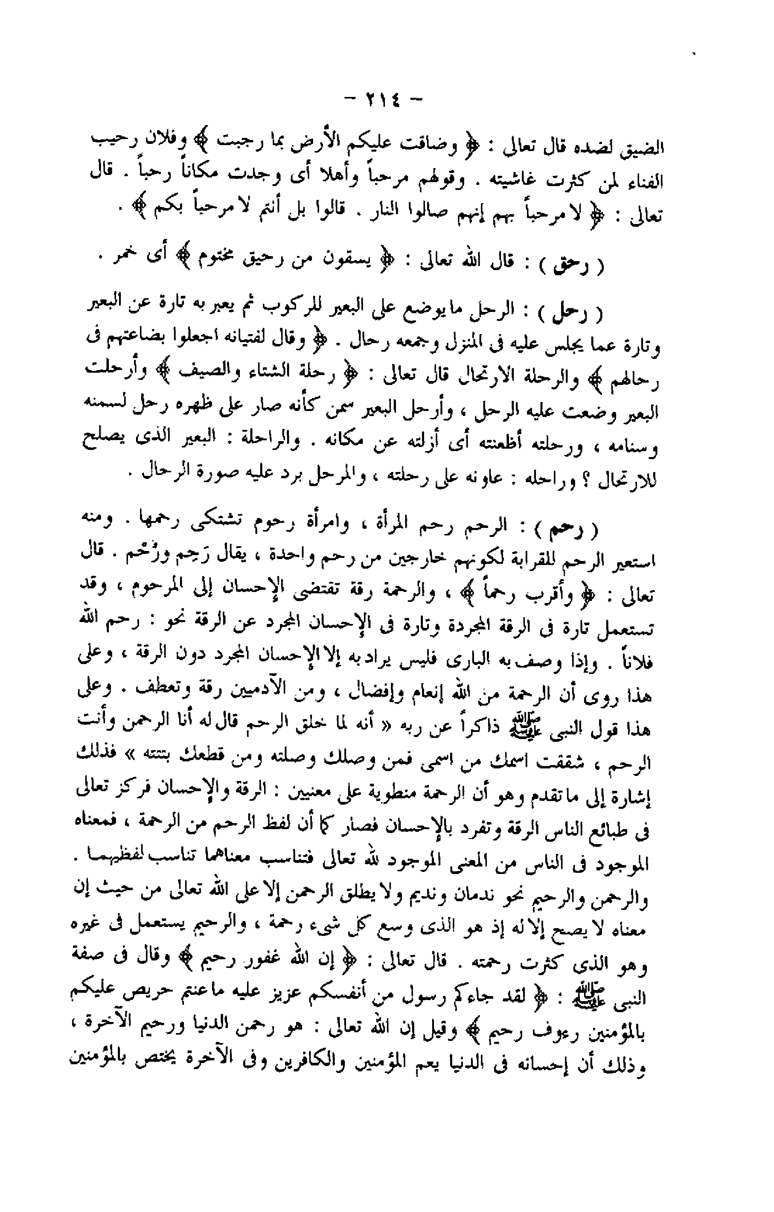 (رحم) : الرحم رحم المرأة، وامرأة رحوم تشتكى رحمها. ومنه استعير الرحم للقرابة لكونهم خارجين من رحم واحدة، يقال رحم ورحم. قال تعالى: وَأَقْرَبَ رُحْماً، والرحمة رقة تقتضى الإحسان إلى المرحوم، وقد تستعمل تارة فى الرقة المجردة وتارة فى الإحسان المجرد عن الرقة نحو: رحم اللَّه فلانا. وإذا وصف به الباري فليس يراد به إلا الإحسان المجرد دون الرقة، وعلى هذا