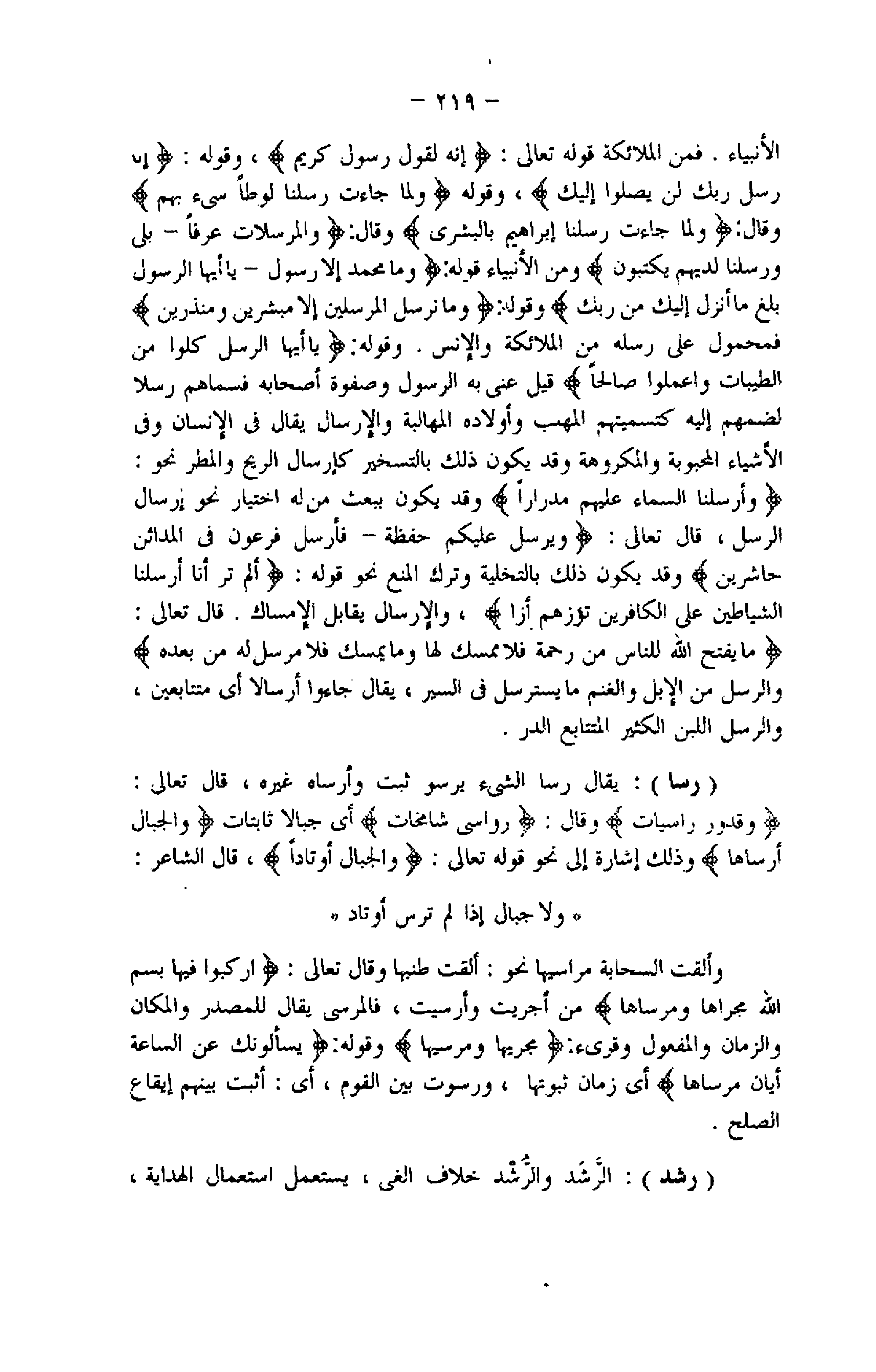 وَأَرْسَلْنَا السَّماءَ عَلَيْهِمْ مِدْراراً وقد يكون ببعث من له اختيار نحو إرسال الرسل، قال تعالى: وَيُرْسِلُ عَلَيْكُمْ حَفَظَةً- فَأَرْسَلَ فِرْعَوْنُ فِي الْمَدائِنِ حاشِرِينَ وقد يكون ذلك بالتخلية وترك المنع نحو قوله: أَلَمْ تَرَ أَنَّا أَرْسَلْنَا الشَّياطِينَ عَلَى الْكافِرِينَ تَؤُزُّهُمْ أَزًّا، والإرسال يقابل الإمساك. قال تعالى:
