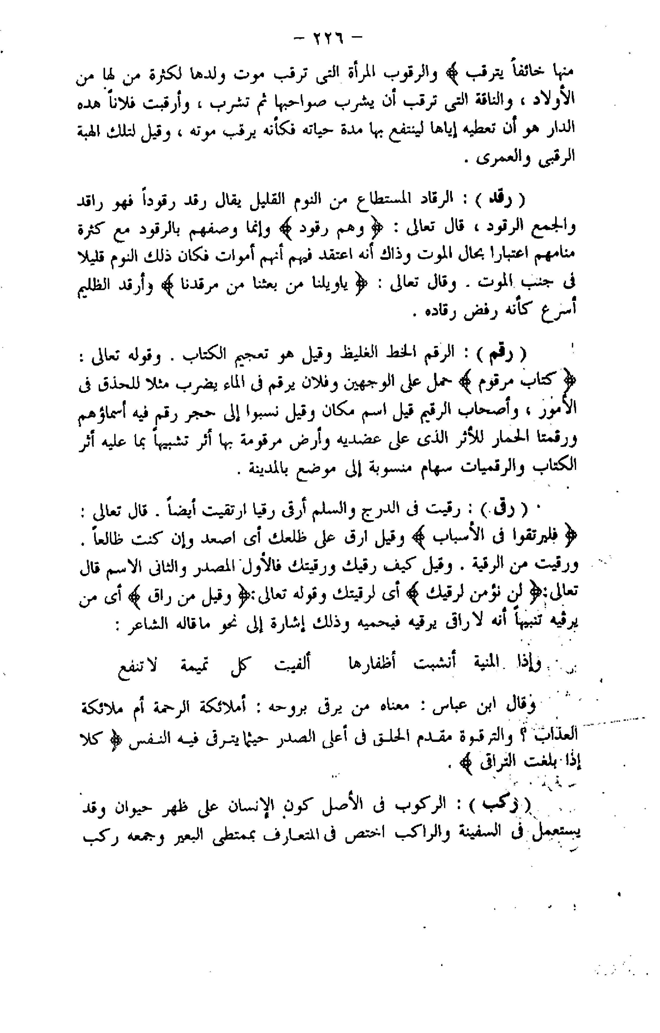 كِتابٌ مَرْقُومٌ حمل على الوجهين وفلان يرقم فى الماء يضرب مثلا للحذق فى الأمور، وأصحاب الرقيم قيل اسم مكان وقيل نسبوا إلى حجر رقم فيه أسماؤهم ورقمتا الحمار للأثر الذي على عضديه وأرض مرقومة بها أثر تشبيها بما عليه أثر الكتاب والرقميات سهام منسوبة إلى موضع بالمدينة.