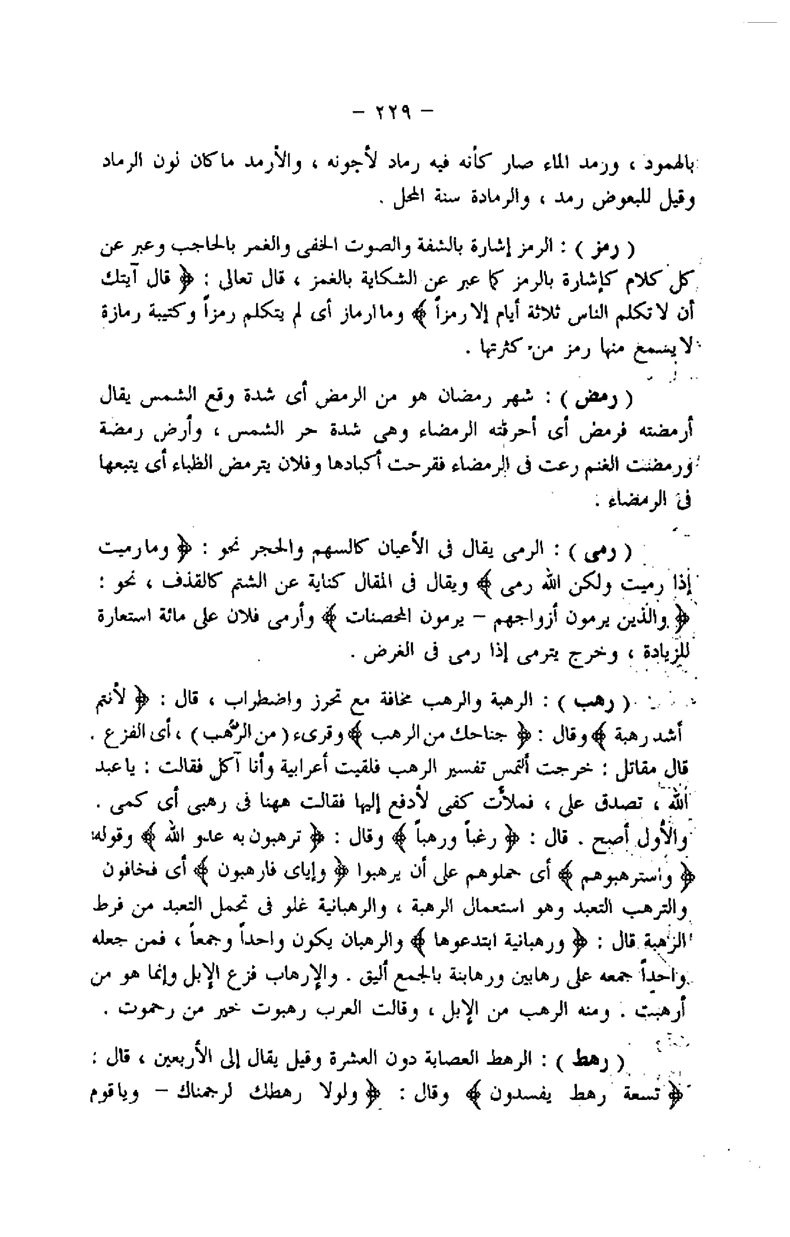 (رمض) : شهر رمضان هو من الرمض أي شدة وقع الشمس يقال أرمضته فرمض أي أحرقته الرمضاء وهى شدة حر الشمس، وأرض رمضة ورمضت الغنم رعت فى الرمضاء فقرحت أكبادها وفلان يترمض الظباء أي يتبعها فى الرمضاء.