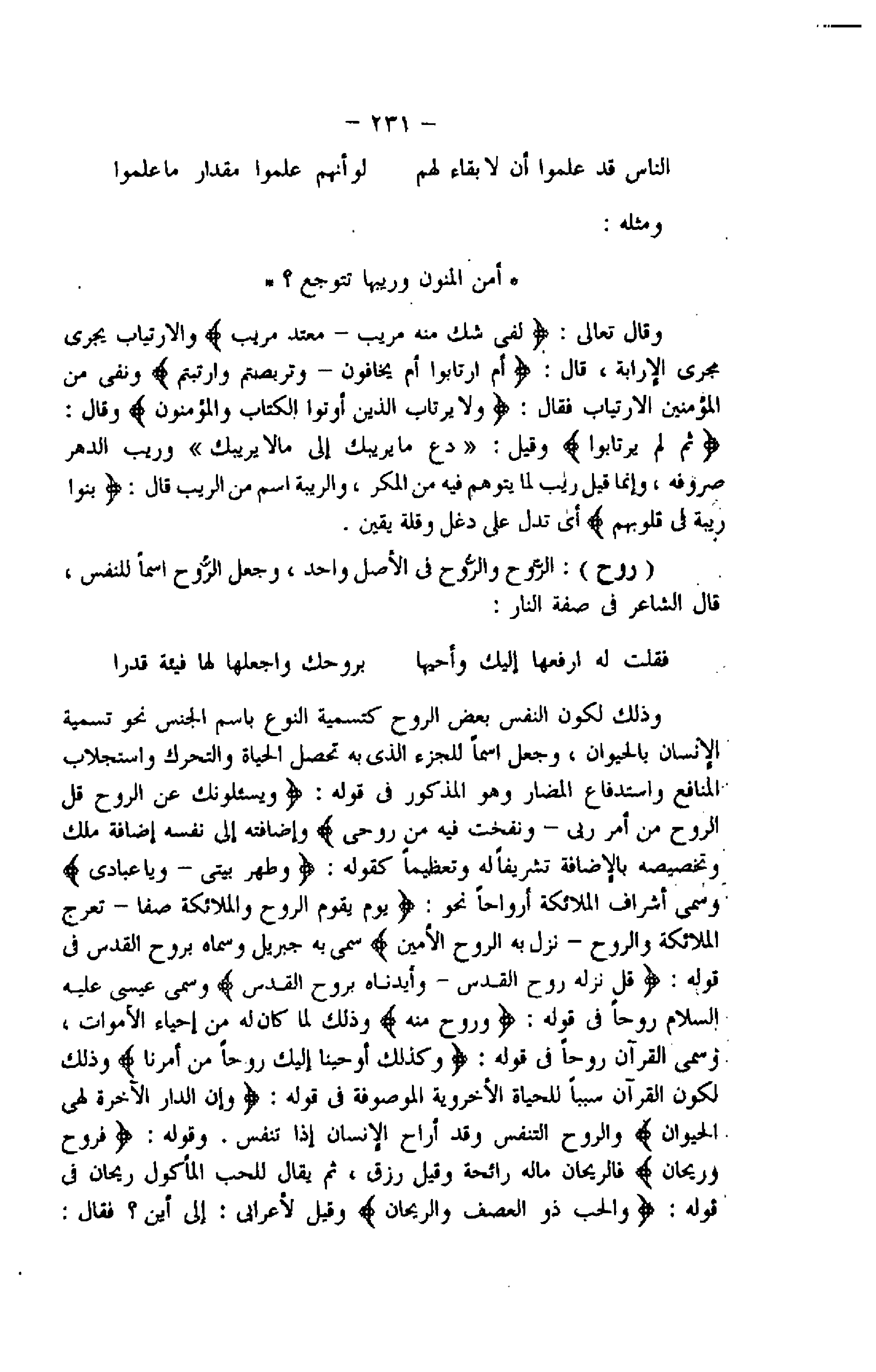 وسمى أشراف الملائكة أرواحا نحو: يَوْمَ يَقُومُ الرُّوحُ وَالْمَلائِكَةُ صَفًّا- تَعْرُجُ الْمَلائِكَةُ وَالرُّوحُ- نَزَلَ بِهِ الرُّوحُ الْأَمِينُ سمى به جبريل وسماه بروح القدس فى قوله: قُلْ نَزَّلَهُ رُوحُ الْقُدُسِ- وَأَيَّدْناهُ بِرُوحِ الْقُدُسِ وسمى عيسى عليه السلام روحا فى قوله: وَرُوحٌ مِنْهُ وذلك لما كان له من إحياء الأموات، وسمى القرآن روحا فى قوله: وَكَذلِكَ أَوْحَيْنا إِلَيْكَ رُوحاً مِنْ أَمْرِنا وذلك لكون القرآن سببا للحياة الأخروية الموصوفة فى قوله: وَإِنَّ الدَّارَ الْآخِرَةَ لَهِيَ الْحَيَوانُ والروح التنفس وقد أراح الإنسان إذا تنفس. وقوله: فَرَوْحٌ وَرَيْحانٌ فالريحان ماله رائحة وقيل رزق، ثم يقال للحب المأكول ريحان فى قوله: وَالْحَبُّ ذُو الْعَصْفِ وَالرَّيْحانُ وقيل لأعرابى: إلى أين؟ فقال: