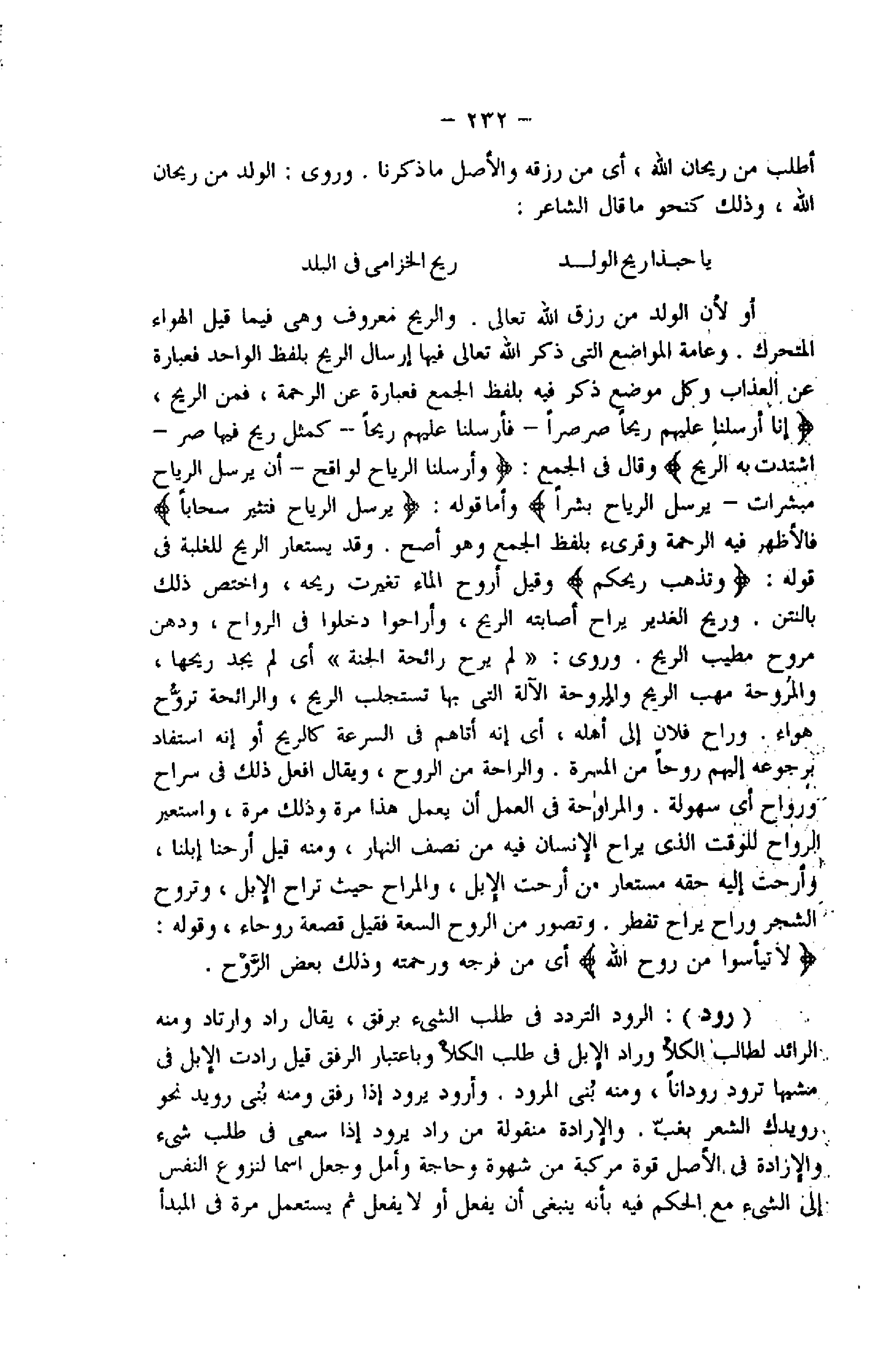 - اشْتَدَّتْ بِهِ الرِّيحُ وقال فى الجمع: وَأَرْسَلْنَا الرِّياحَ لَواقِحَ- أَنْ يُرْسِلَ الرِّياحَ مُبَشِّراتٍ- يُرْسِلُ الرِّياحَ بُشْراً وأما قوله: يُرْسِلُ الرِّياحَ فَتُثِيرُ سَحاباً فالأظهر فيه الرحمة وقرىء بلفظ الجمع وهو أصح. وقد يستعار الريح للغلبة فى قوله: وَتَذْهَبَ رِيحُكُمْ وقيل أروح الماء تغيرت ريحه، واختص ذلك بالنتن. وريح الغدير يراح أصابته الريح، وأراحوا دخلوا فى الرواح، ودهن مروح مطيب الريح.