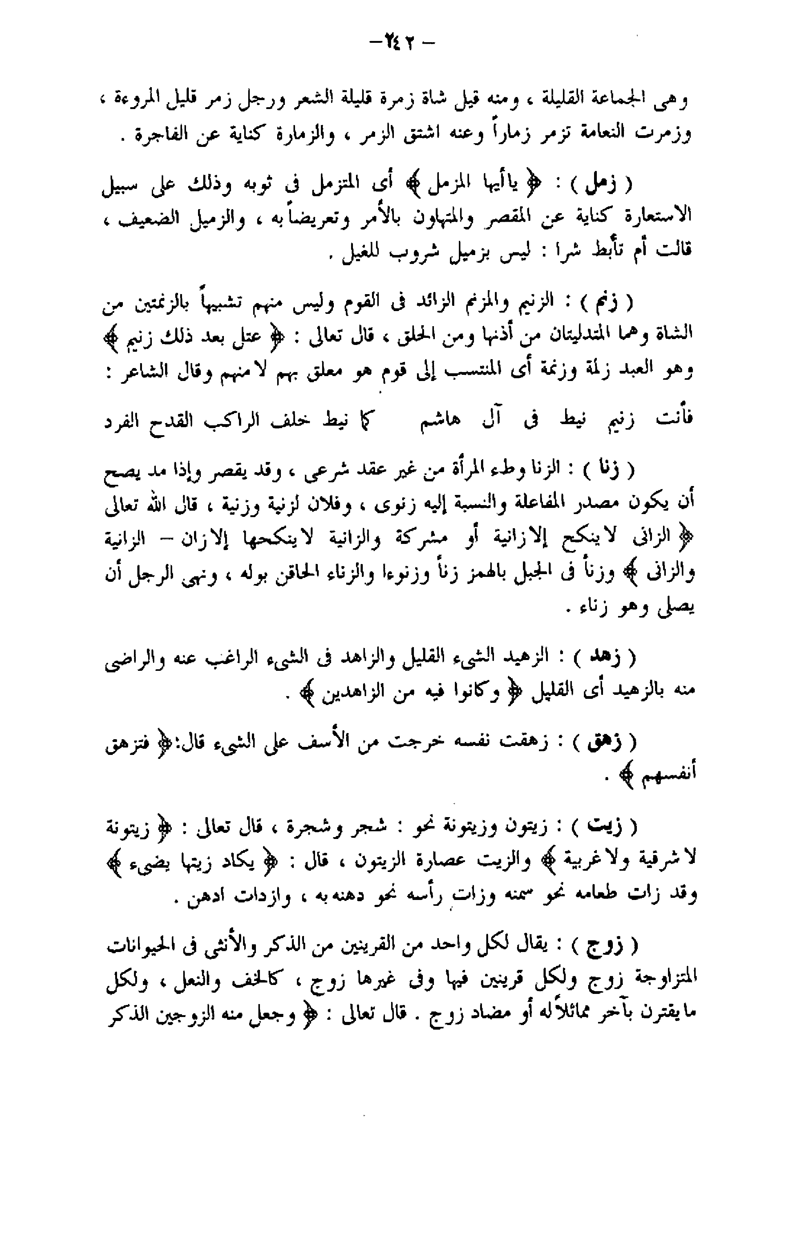 الزَّانِي لا يَنْكِحُ إِلَّا زانِيَةً أَوْ مُشْرِكَةً وَالزَّانِيَةُ لا يَنْكِحُها إِلَّا زانٍ- الزَّانِيَةُ وَالزَّانِي وزنا فى الجبل بالهمز زنأ وزنوءا والزناء الحاقن بوله، ونهى الرجل أن يصلى وهو زناء.
