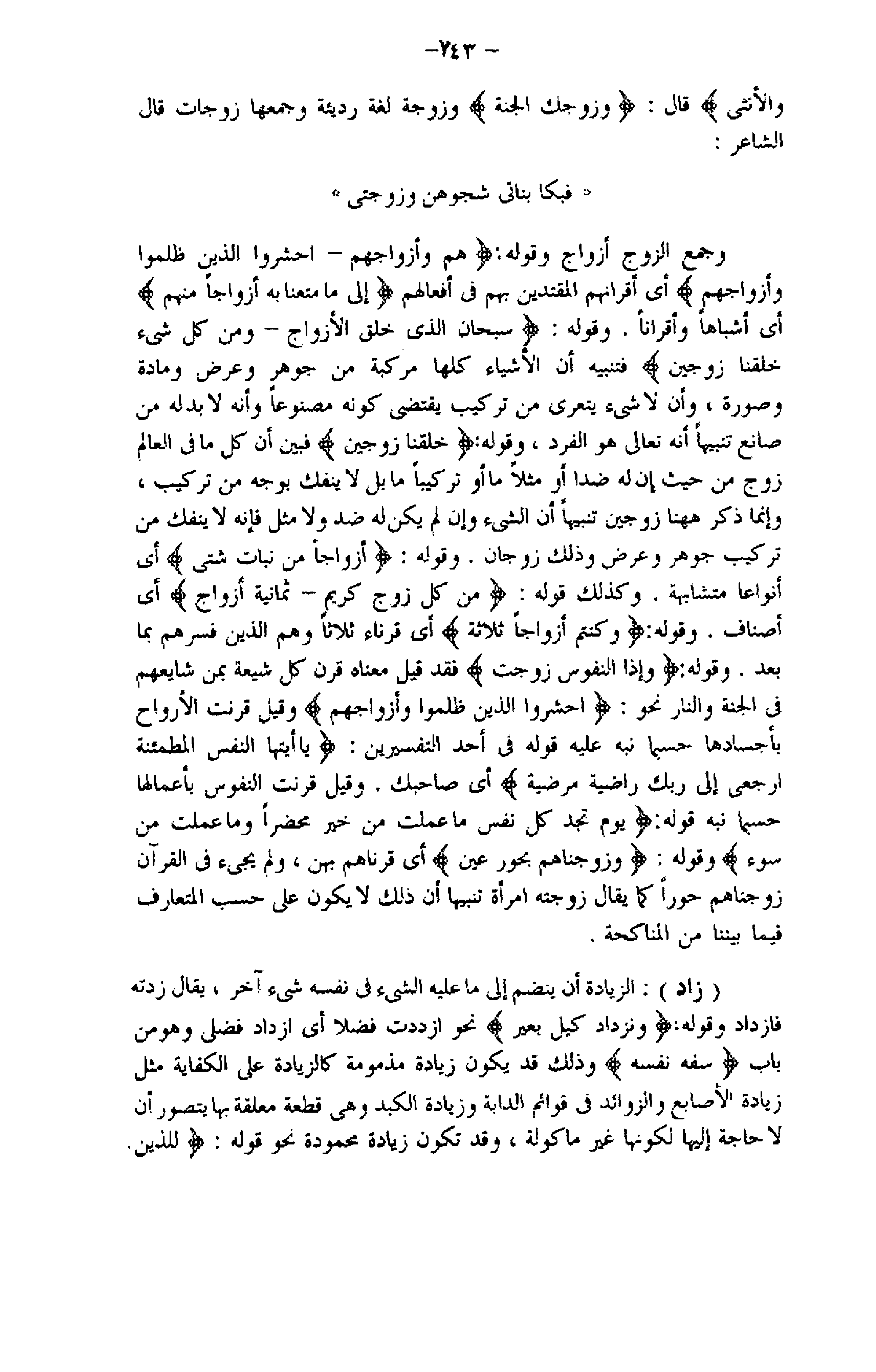 وجمع الزوج أزواج وقوله: هُمْ وَأَزْواجُهُمْ- احْشُرُوا الَّذِينَ ظَلَمُوا وَأَزْواجَهُمْ أي أقرانهم المقتدين بهم فى أفعالهم إِلى ما مَتَّعْنا بِهِ أَزْواجاً مِنْهُمْ أي أشباها وأقرانا. وقوله: سُبْحانَ الَّذِي خَلَقَ الْأَزْواجَ- وَمِنْ كُلِّ شَيْءٍ خَلَقْنا زَوْجَيْنِ فتنبيه أن الأشياء كلها مركبة من جوهر وعرض ومادة وصورة، وأن لا شىء يتعرى من تركيب يقتضى كونه مصنوعا وأنه لا بدله من صانع تنبيها أنه تعالى هو الفرد، وقوله: خَلَقْنا زَوْجَيْنِ فبين أن كل ما فى العالم زوج من حيث إن له ضدا أو مثلا ما أو تركيبا ما بل لا ينفك بوجه من تركيب، وإنما ذكر هاهنا زوجين تنبيها أن الشيء وإن لم يكن له ضد ولا مثل فإنه لا ينفك من تركيب جوهر وعرض وذلك زوجان. وقوله: أَزْواجاً مِنْ نَباتٍ شَتَّى أي أنواعا متشابهة. وكذلك قوله: مِنْ كُلِّ زَوْجٍ كَرِيمٍ- ثَمانِيَةَ أَزْواجٍ أي أصناف. وقوله: وَكُنْتُمْ أَزْواجاً ثَلاثَةً أي قرناء ثلاثا وهم الذين فسرهم بما بعد. وقوله: وَإِذَا النُّفُوسُ زُوِّجَتْ فقد قيل معناه قرن كل شيعة بمن شايعهم فى الجنة والنار نحو: احْشُرُوا الَّذِينَ ظَلَمُوا وَأَزْواجَهُمْ وقيل قرنت الأرواح بأجسادها حسبما نبه عليه قوله فى أحد التفسيرين: يا أَيَّتُهَا النَّفْسُ الْمُطْمَئِنَّةُ ارْجِعِي إِلى رَبِّكِ راضِيَةً مَرْضِيَّةً أي صاحبك. وقيل قرنت النفوس بأعمالها حسبما نبه قوله: يَوْمَ تَجِدُ كُلُّ نَفْسٍ ما عَمِلَتْ مِنْ خَيْرٍ مُحْضَراً وَما عَمِلَتْ مِنْ سُوءٍ وقوله: وَزَوَّجْناهُمْ بِحُورٍ عِينٍ أي قرناهم بهن، ولم يجىء فى القرآن زوجناهم حورا كما يقال زوجته امرأة تنبيها أن ذلك لا يكون على حسب المتعارف فيما بيننا من المناكحة.
