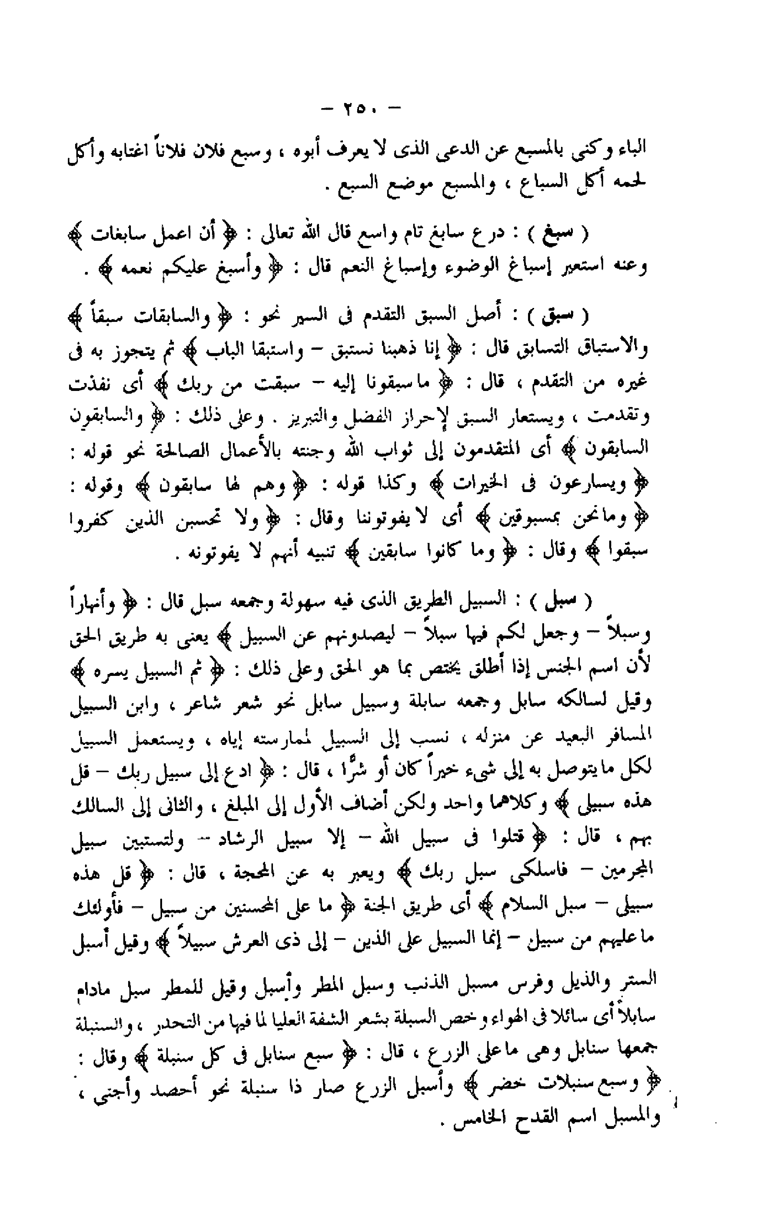 (سبل) : السبيل الطريق الذي فيه سهولة وجمعه سبل قال: وَأَنْهاراً وَسُبُلًا- وَجَعَلَ لَكُمْ فِيها سُبُلًا- لَيَصُدُّونَهُمْ عَنِ السَّبِيلِ يعنى به طريق الحق لأن اسم الجنس إذا أطلق يختص بما هو الحق وعلى ذلك: ثُمَّ السَّبِيلَ يَسَّرَهُ وقيل لسالكه سابل وجمعه سابلة وسبيل سابل نحو شعر شاعر، وابن السبيل المسافر البعيد عن منزله، نسب إلى السبيل لممارسته إياه، ويستعمل السبيل لكل ما يتوصل به إلى شىء خيرا كان أو شرّا، قال: ادْعُ إِلى سَبِيلِ رَبِّكَ- قُلْ هذِهِ سَبِيلِي وكلاهما واحد ولكن أضاف الأول إلى المبلغ، والثاني إلى السالك بهم، قال: قُتِلُوا فِي سَبِيلِ اللَّهِ- إِلَّا سَبِيلَ الرَّشادِ- وَلِتَسْتَبِينَ سَبِيلُ الْمُجْرِمِينَ- فَاسْلُكِي سُبُلَ رَبِّكِ ويعبر به عن المحجة، قال: قُلْ هذِهِ سَبِيلِي- سُبُلَ السَّلامِ أي طريق الجنة ما عَلَى الْمُحْسِنِينَ مِنْ سَبِيلٍ- فَأُولئِكَ ما عَلَيْهِمْ مِنْ سَبِيلٍ- إِنَّمَا السَّبِيلُ عَلَى الَّذِينَ- إِلى ذِي الْعَرْشِ سَبِيلًا وقيل أسبل الستر والذيل وفرس مسبل الذنب وسبل المطر وأسبل وقيل للمطر سبل مادام سابلا أي سائلا فى الهواء وخص السبلة بشعر الشفة العليا لما فيها من التحدر، والسنبلة جمعها سنابل وهى ما على الزرع، قال: سَبْعَ سَنابِلَ فِي كُلِّ سُنْبُلَةٍ وقال: