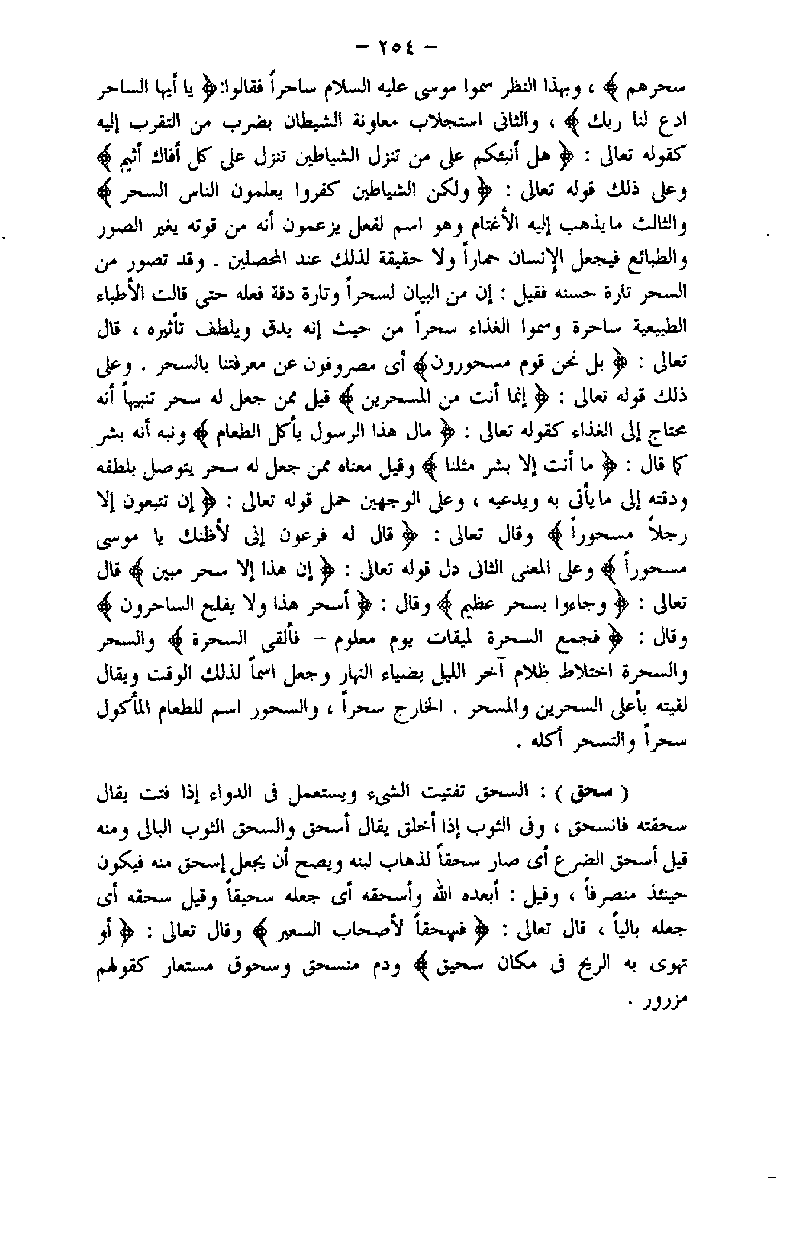 ، وبهذا النظر سموا موسى عليه السلام ساحرا فقالوا: يا أَيُّهَا السَّاحِرُ ادْعُ لَنا رَبَّكَ، والثاني استجلاب معاونة الشيطان بضرب من التقرب إليه كقوله تعالى: هَلْ أُنَبِّئُكُمْ عَلى مَنْ تَنَزَّلُ الشَّياطِينُ تَنَزَّلُ عَلى كُلِّ أَفَّاكٍ أَثِيمٍ وعلى ذلك قوله تعالى: وَلكِنَّ الشَّياطِينَ كَفَرُوا يُعَلِّمُونَ النَّاسَ السِّحْرَ والثالث ما يذهب إليه الأغتام وهو اسم لفعل يزعمون أنه من قوته يغير الصور والطبائع فيجعل الإنسان حمارا ولا حقيقة لذلك عند المحصلين. وقد تصور من السحر تارة حسنة فقيل: إن من البيان لسحرا وتارة دقة فعله حتى قالت الأطباء الطبيعية ساحرة وسموا الغذاء سحرا من حيث إنه يدق ويلطف تأثيره، قال تعالى: بَلْ نَحْنُ قَوْمٌ مَسْحُورُونَ أي مصروفون عن معرفتنا بالسحر. وعلى ذلك قوله تعالى: إِنَّما أَنْتَ مِنَ الْمُسَحَّرِينَ قيل ممن جعل له سحر تنبيها أنه محتاج إلى الغذاء كقوله تعالى: مالِ هذَا الرَّسُولِ يَأْكُلُ الطَّعامَ ونبه أنه بشر كما قال: ما أَنْتَ إِلَّا بَشَرٌ مِثْلُنا وقيل معناه ممن جعل له سحر يتوصل بلطفه ودقته إلى ما يأتى به ويدعيه، وعلى الوجهين حمل قوله تعالى: إِنْ تَتَّبِعُونَ إِلَّا رَجُلًا مَسْحُوراً وقال تعالى: فَقالَ لَهُ فِرْعَوْنُ إِنِّي لَأَظُنُّكَ يا مُوسى مَسْحُوراً وعلى المعنى الثاني دل قوله تعالى: إِنْ هذا إِلَّا سِحْرٌ مُبِينٌ قال تعالى: وَجاؤُ بِسِحْرٍ عَظِيمٍ وقال: أَسِحْرٌ هذا وَلا يُفْلِحُ السَّاحِرُونَ وقال: فَجُمِعَ السَّحَرَةُ لِمِيقاتِ يَوْمٍ مَعْلُومٍ- فَأُلْقِيَ السَّحَرَةُ والسحر والسحرة اختلاط ظلام آخر الليل بضياء النهار وجعل اسما لذلك الوقت ويقال لقيته بأعلى السحرين والمسحر. الخارج سحرا، والسحور اسم للطعام المأكول سحرا والتسحر أكله.
