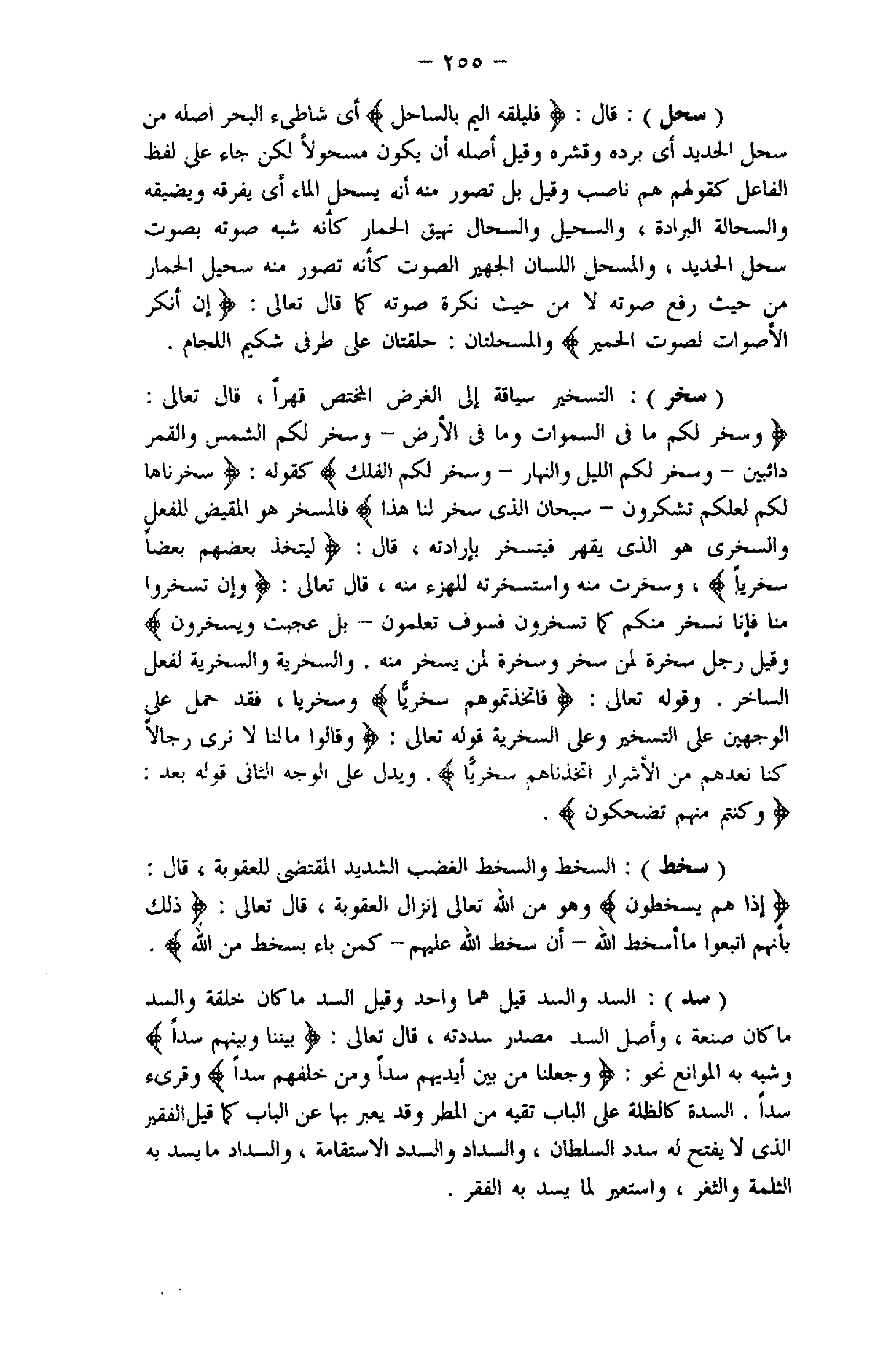 وَسَخَّرَ لَكُمْ ما فِي السَّماواتِ وَما فِي الْأَرْضِ- وَسَخَّرَ لَكُمُ الشَّمْسَ وَالْقَمَرَ دائِبَيْنِ- وَسَخَّرَ لَكُمُ اللَّيْلَ وَالنَّهارَ- وَسَخَّرَ لَكُمُ الْفُلْكَ كقوله: سَخَّرْناها لَكُمْ لَعَلَّكُمْ تَشْكُرُونَ- سُبْحانَ الَّذِي سَخَّرَ لَنا هذا فالمسخر هو المقيض للفعل والسخرى هو الذي يقهر فيتسخر بإرادته، قال: لِيَتَّخِذَ بَعْضُهُمْ بَعْضاً سُخْرِيًّا، وسخرت منه واستخرته للهزء منه، قال تعالى: إِنْ تَسْخَرُوا مِنَّا فَإِنَّا نَسْخَرُ مِنْكُمْ كَما تَسْخَرُونَ فَسَوْفَ تَعْلَمُونَ- بَلْ عَجِبْتَ وَيَسْخَرُونَ وقيل رجل سخرة لمن سخر وسخرة لمن يسخر منه. والسخرية والسخرية لفعل الساخر. وقوله تعالى: فَاتَّخَذْتُمُوهُمْ سِخْرِيًّا وسخريا، فقد حمل على الوجهين على التسخير وعلى السخرية قوله تعالى: وَقالُوا ما لَنا لا نَرى رِجالًا كُنَّا نَعُدُّهُمْ مِنَ الْأَشْرارِ أَتَّخَذْناهُمْ سِخْرِيًّا. ويدل على الوجه الثاني قوله بعد: