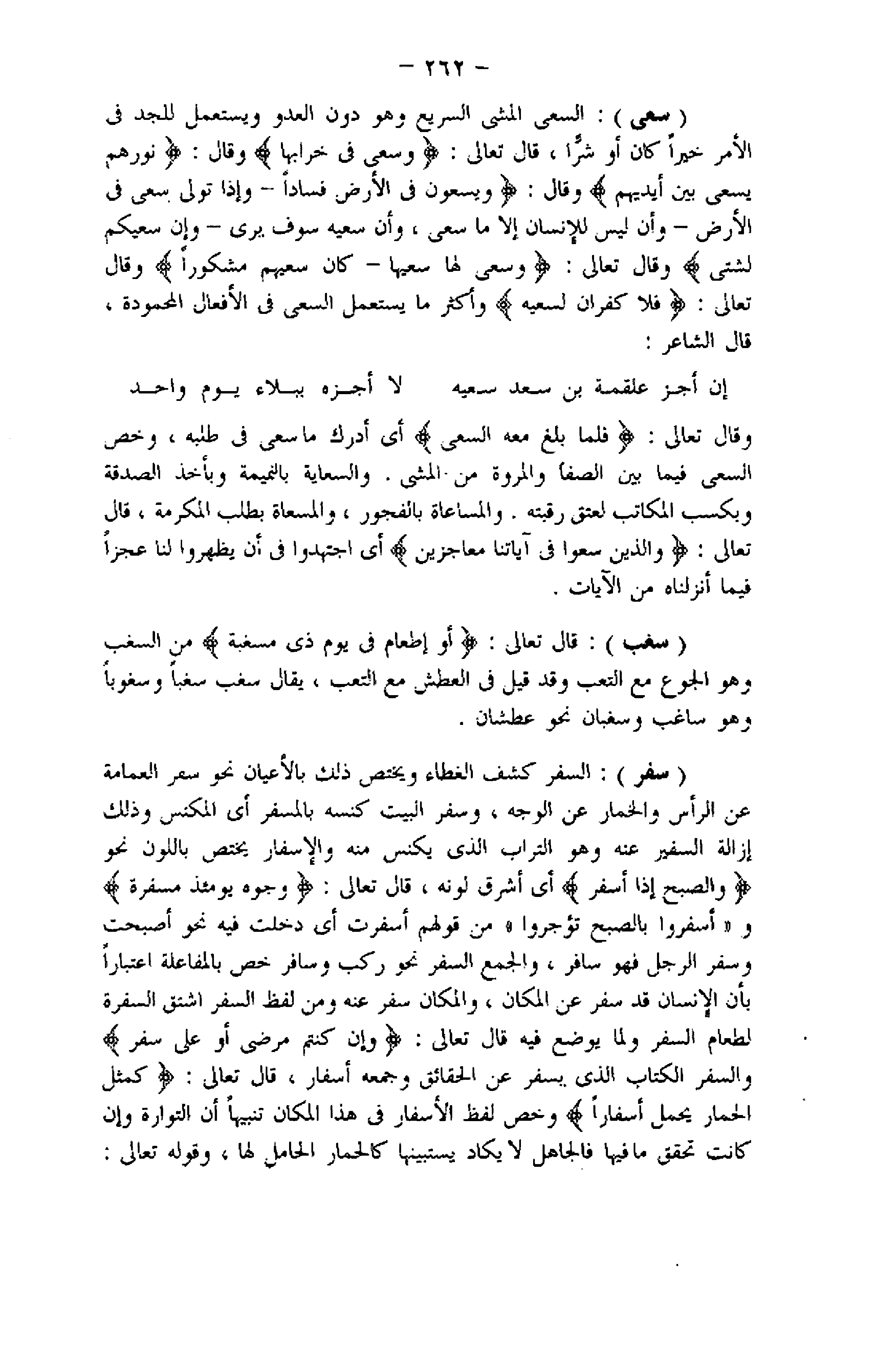 (سعى) : السعى المشي السريع وهو دون العدو ويستعمل للجد فى الأمر خيرا كان أو شرّا، قال تعالى: وَسَعى فِي خَرابِها وقال: نُورُهُمْ يَسْعى بَيْنَ أَيْدِيهِمْ وقال: وَيَسْعَوْنَ فِي الْأَرْضِ فَساداً- وَإِذا تَوَلَّى سَعى فِي الْأَرْضِ- وَأَنْ لَيْسَ لِلْإِنْسانِ إِلَّا ما سَعى، وَأَنَّ سَعْيَهُ سَوْفَ يُرى - إِنَّ سَعْيَكُمْ لَشَتَّى وقال تعالى: وَسَعى لَها سَعْيَها- كانَ سَعْيُهُمْ مَشْكُوراً وقال تعالى: فَلا كُفْرانَ لِسَعْيِهِ وأكثر ما يستعمل السعى فى الأفعال المحمودة، قال الشاعر: