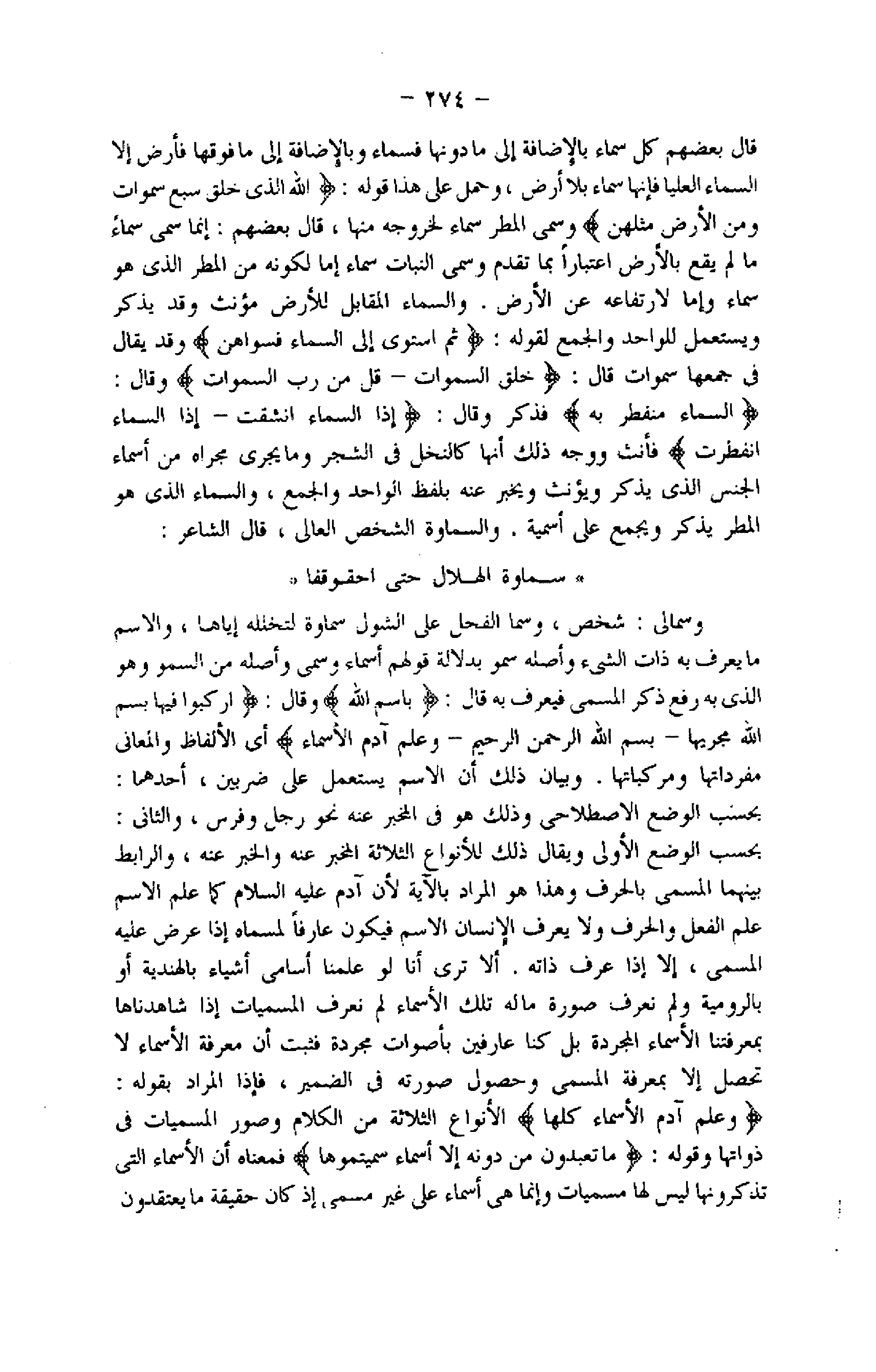وسمالى: شخص، وسما الفحل على الشول سماوة لتخلله إياها، والاسم ما يعرف به ذات الشيء وأصله سمو بدلالة قولهم أسماء وسمى وأصله من السمو وهو الذي به رفع ذكر المسمى فيعرف به قال: (باسم الله) وقال: ارْكَبُوا فِيها بِسْمِ اللَّهِ مَجْراها- بِسْمِ اللَّهِ الرَّحْمنِ الرَّحِيمِ- وَعَلَّمَ آدَمَ الْأَسْماءَ أي الألفاظ والمعاني مفرداتها ومركباتها. وبيان ذلك أن الاسم يستعمل على ضربين، أحدهما: