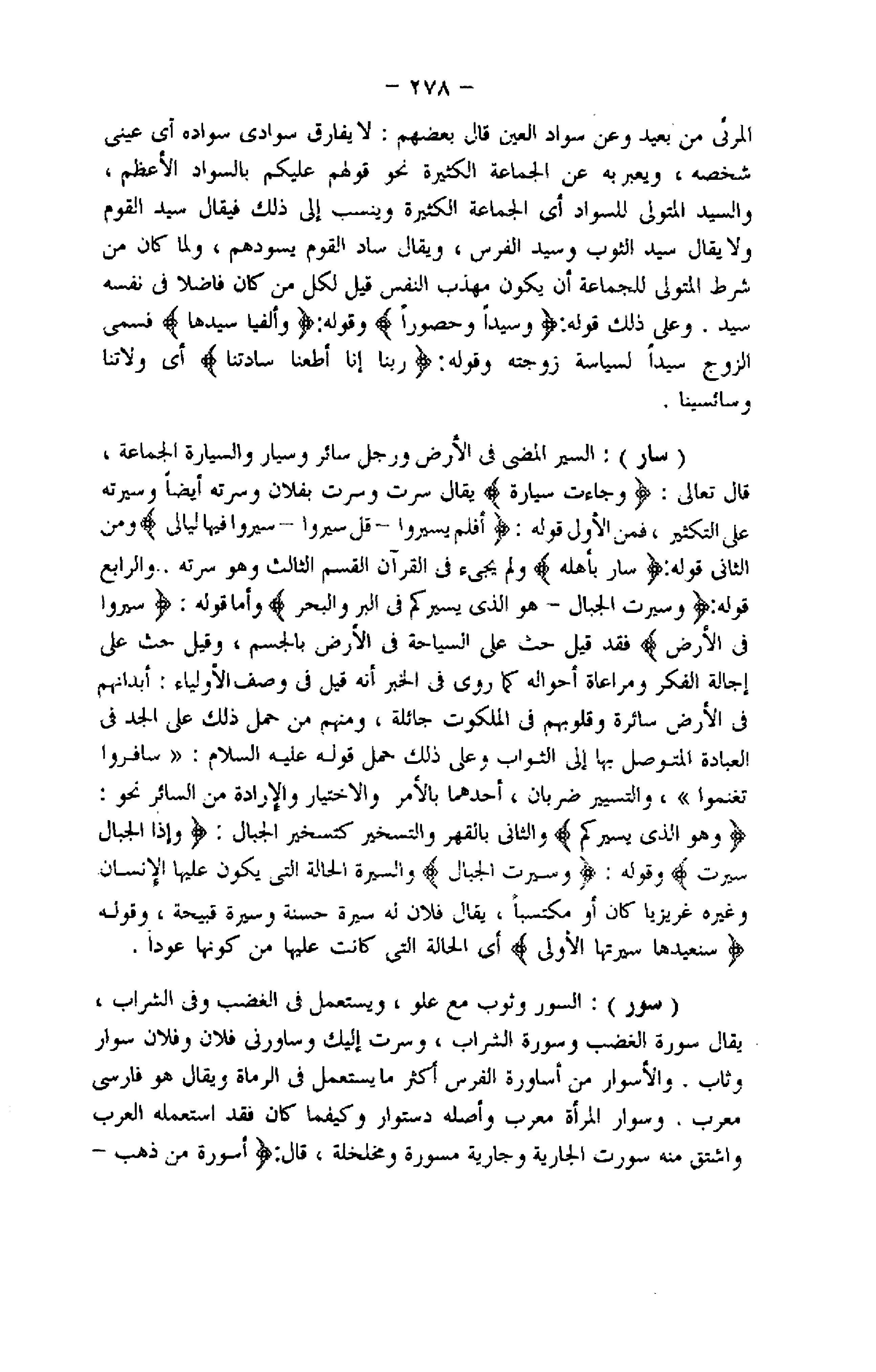 المرئي من بعيد وعن سواد العين قال بعضهم: لا يفارق سوادى سواده أي عينى شخصه، ويعبر به عن الجماعة الكثيرة نحو قولهم عليكم بالسواد الأعظم، والسيد المتولى للسواد أي الجماعة الكثيرة وينسب إلى ذلك فيقال سيد القوم ولا يقال سيد الثوب وسيد الفرس، ويقال ساد القوم يسودهم، ولما كان من شرط المتولى للجماعة أن يكون مهذب النفس قيل لكل من كان فاضلا فى نفسه سيد. وعلى ذلك قوله: وَسَيِّداً وَحَصُوراً وقوله: وَأَلْفَيا سَيِّدَها فسمى الزوج سيدا لسياسة زوجته وقوله: رَبَّنا إِنَّا أَطَعْنا سادَتَنا أي ولاتنا وسائسينا.