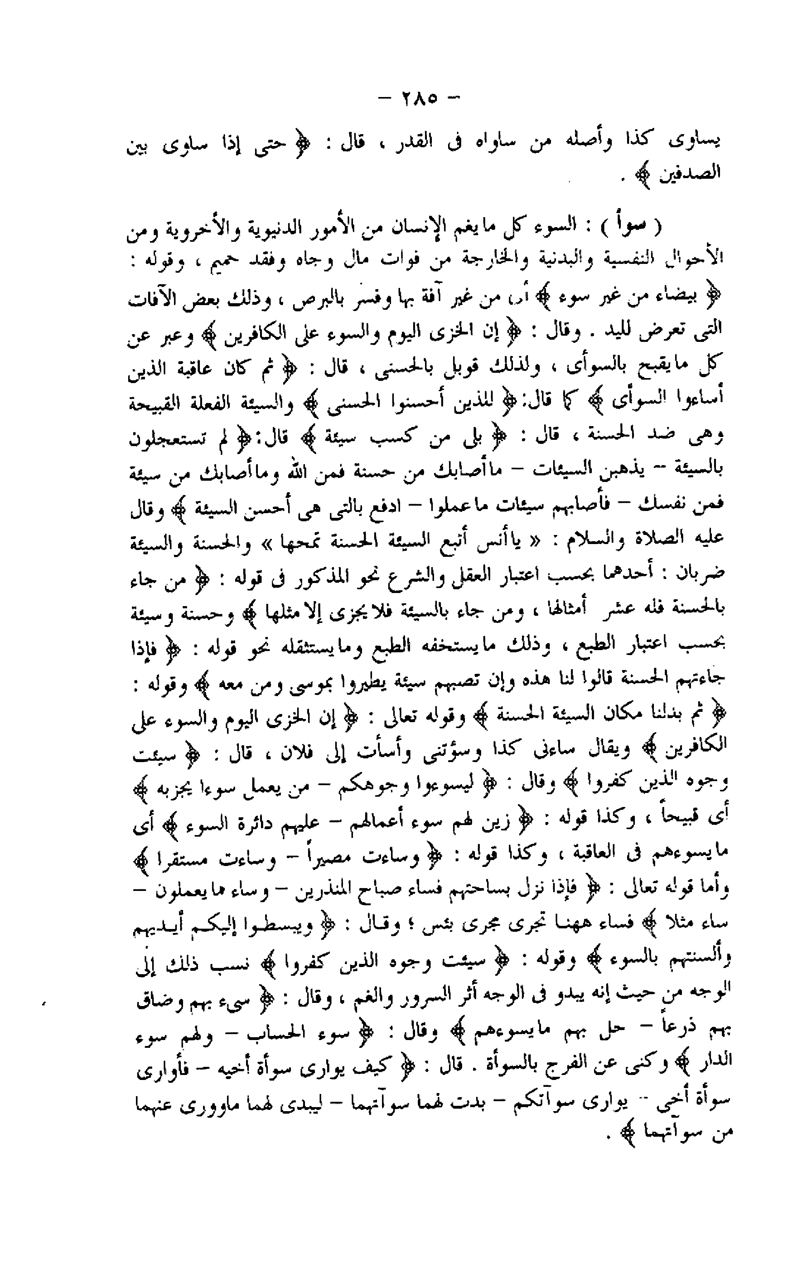 بَيْضاءَ مِنْ غَيْرِ سُوءٍ أي من غير آفة بها وفسر بالبرص، وذلك بعض الآفات التي تعرض لليد. وقال: إِنَّ الْخِزْيَ الْيَوْمَ وَالسُّوءَ عَلَى الْكافِرِينَ وعبر عن كل ما يقبح بالسوأى، ولذلك قوبل بالحسنى، قال: ثُمَّ كانَ عاقِبَةَ الَّذِينَ أَساؤُا السُّواى كما قال: لِلَّذِينَ أَحْسَنُوا الْحُسْنى والسيئة الفعلة القبيحة وهى ضد الحسنة، قال: بَلى مَنْ كَسَبَ سَيِّئَةً قال: لِمَ تَسْتَعْجِلُونَ بِالسَّيِّئَةِ- يُذْهِبْنَ السَّيِّئاتِ- ما أَصابَكَ مِنْ حَسَنَةٍ فَمِنَ اللَّهِ وَما أَصابَكَ مِنْ سَيِّئَةٍ فَمِنْ نَفْسِكَ- فَأَصابَهُمْ سَيِّئاتُ ما عَمِلُوا- ادْفَعْ بِالَّتِي هِيَ أَحْسَنُ السَّيِّئَةَ