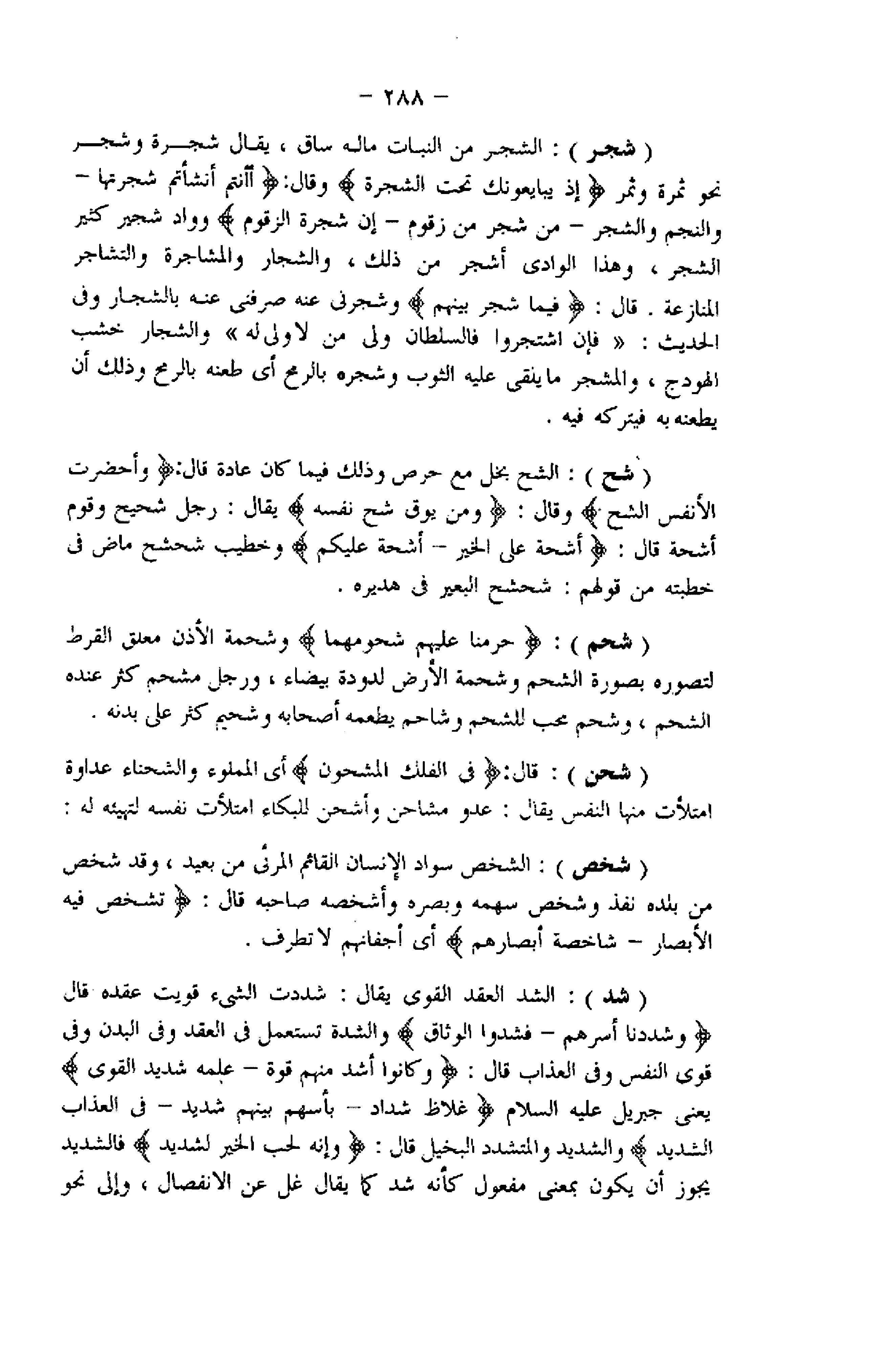 (شح) : الشح بخل مع حرص وذلك فيما كان عادة قال: وَأُحْضِرَتِ الْأَنْفُسُ الشُّحَّ وقال: وَمَنْ يُوقَ شُحَّ نَفْسِهِ يقال: رجل شحيح وقوم أشحة قال: أَشِحَّةً عَلَى الْخَيْرِ- أَشِحَّةً عَلَيْكُمْ وخطيب شحشح ماض فى خطبته من قولهم: شحشح البعير فى هديره.