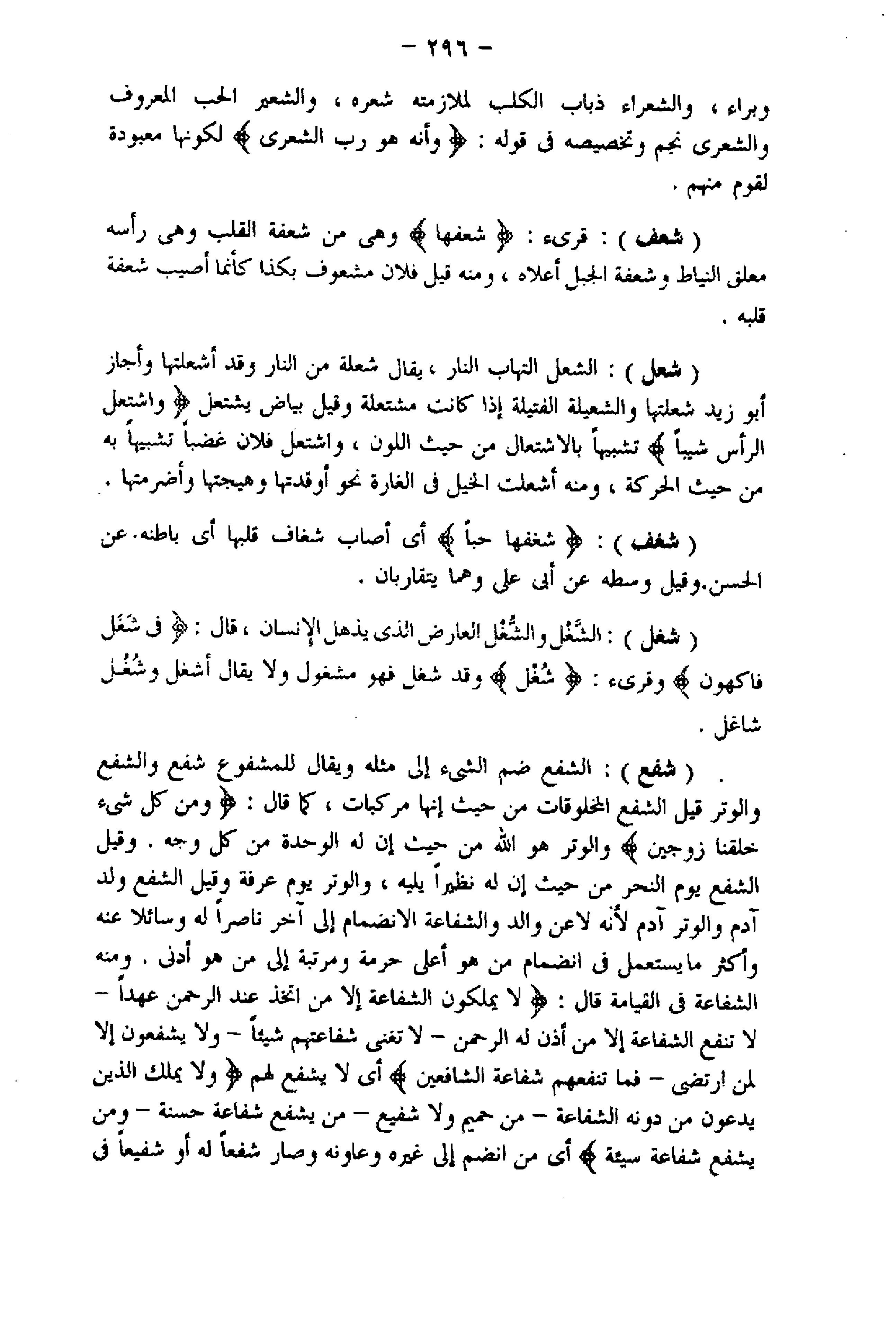 (شفع) : الشفع ضم الشيء إلى مثله ويقال للمشفوع شفع والشفع والوتر قيل الشفع المخلوقات من حيث إنها مركبات، كما قال: وَمِنْ كُلِّ شَيْءٍ خَلَقْنا زَوْجَيْنِ والوتر هو اللَّه من حيث إن له الوحدة من كل وجه. وقيل الشفع يوم النحر من حيث إن له نظيرا يليه، والوتر يوم عرفة وقيل الشفع ولد آدم والوتر آدم لأنه لا عن والد والشفاعة الانضمام إلى آخر ناصرا له وسائلا عنه وأكثر ما يستعمل فى انضمام من هو أعلى حرمة ومرتبة إلى من هو أدنى. ومنه الشفاعة فى القيامة قال: لا يَمْلِكُونَ الشَّفاعَةَ إِلَّا مَنِ اتَّخَذَ عِنْدَ الرَّحْمنِ عَهْداً- لا تَنْفَعُ الشَّفاعَةُ إِلَّا مَنْ أَذِنَ لَهُ الرَّحْمنُ- لا تُغْنِي شَفاعَتُهُمْ شَيْئاً- وَلا يَشْفَعُونَ إِلَّا لِمَنِ ارْتَضى - فَما تَنْفَعُهُمْ شَفاعَةُ الشَّافِعِينَ أي لا يشفع لهم وَلا يَمْلِكُ الَّذِينَ يَدْعُونَ مِنْ دُونِهِ الشَّفاعَةَ- مِنْ حَمِيمٍ وَلا شَفِيعٍ- مَنْ يَشْفَعْ شَفاعَةً حَسَنَةً- وَمَنْ يَشْفَعْ شَفاعَةً سَيِّئَةً أي من انضم إلى غيره وعاونه وصار شفعا له أو شفيعا فى