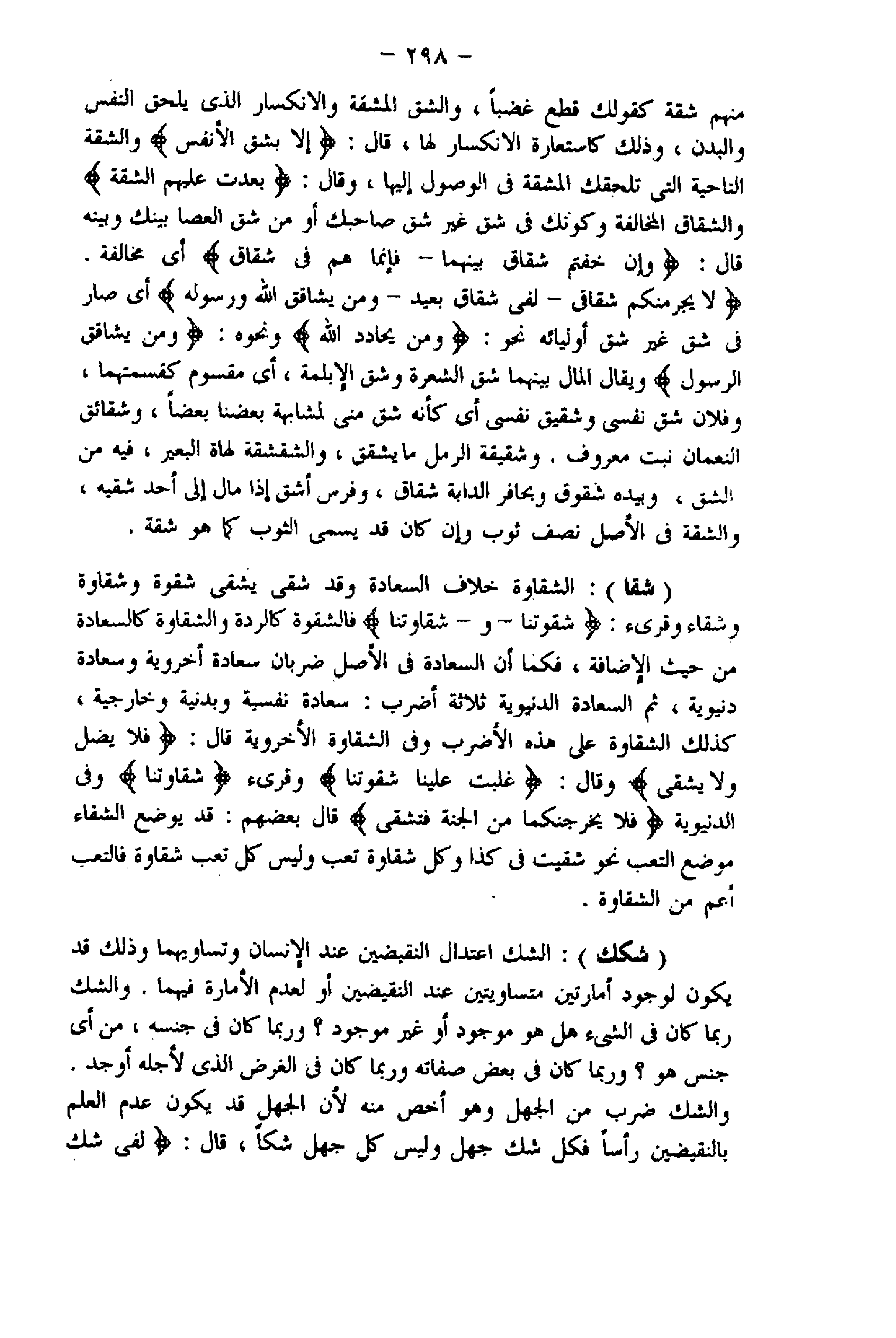 (شقا) : الشقاوة خلاف السعادة وقد شقى يشقى شقوة وشقاوة وشقاء وقرىء: شِقْوَتُنا- و (شقاوتنا) فالشقوة كالردة والشقاوة كالسعادة من حيث الإضافة، فكما أن السعادة فى الأصل ضربان سعادة أخروية وسعادة دنيوية، ثم السعادة الدنيوية ثلاثة أضرب: سعادة نفسية وبدنية وخارجية، كذلك الشقاوة على هذه الأضرب وفى الشقاوة الأخروية قال: فَلا يَضِلُّ وَلا يَشْقى وقال: غَلَبَتْ عَلَيْنا شِقْوَتُنا وقرىء (شقاوتنا) وفى الدنيوية فَلا يُخْرِجَنَّكُما مِنَ الْجَنَّةِ فَتَشْقى قال بعضهم: قد يوضع الشقاء موضع التعب نحو شقيت فى كذا وكل شقاوة تعب وليس كل تعب شقاوة فالتعب أعم من الشقاوة.