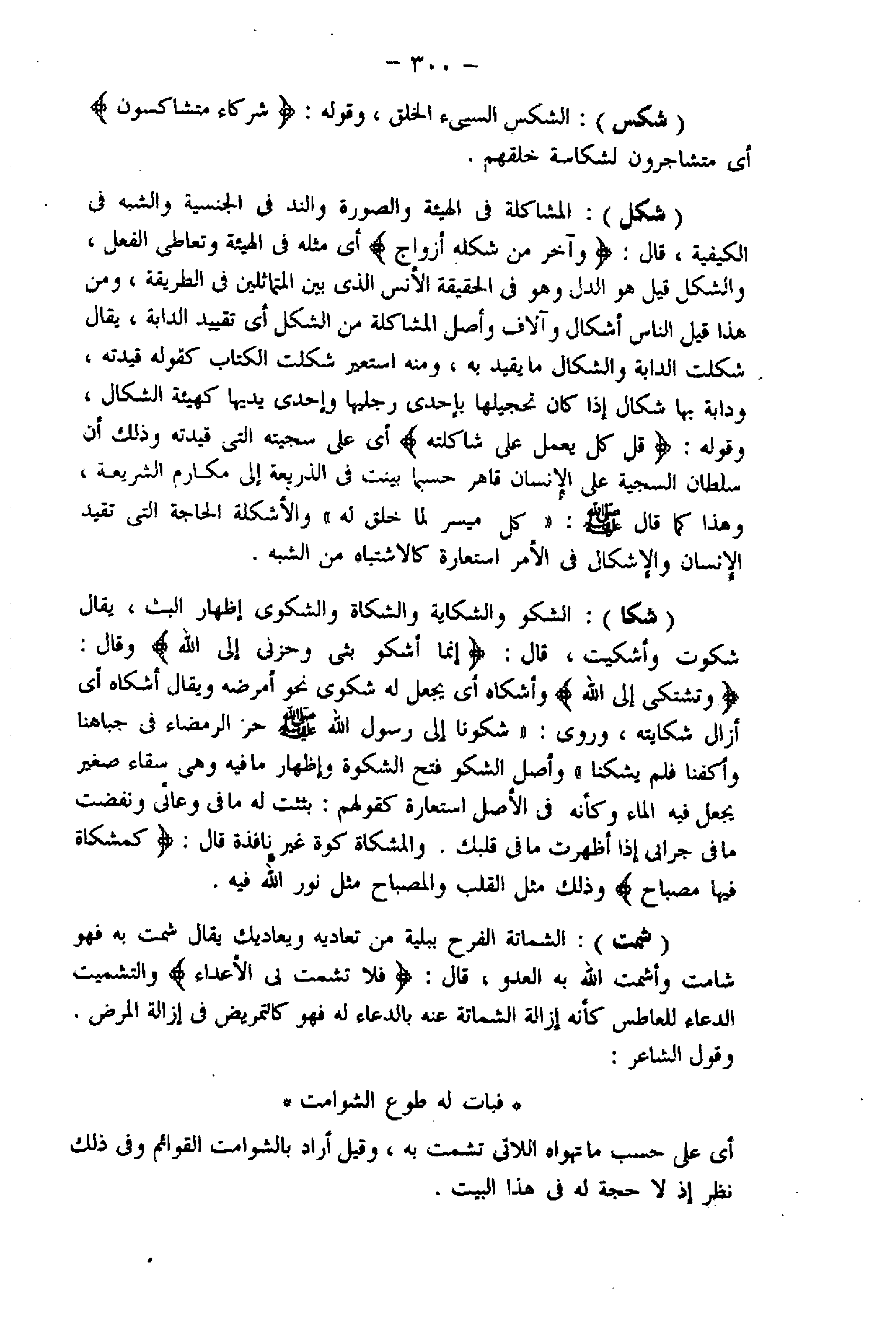 (شكل) : المشاكلة فى الهيئة والصورة والند فى الجنسية والشبه فى الكيفية، قال: وَآخَرُ مِنْ شَكْلِهِ أَزْواجٌ أي مثله فى الهيئة وتعاطى الفعل، والشكل قيل هو الدل وهو الحقيقة الأنس الذي بين المتماثلين فى الطريقة، ومن هذا قيل الناس أشكال وآلاف وأصل المشاكلة من الشكل أي تقييد الدابة، يقال شكلت الدابة والشكال ما يقيد به، ومنه استعير شكلت الكتاب كقوله قيدته، ودابة بها شكال إذا كان تحجيلها بإحدى رجليها وإحدى يديها كهيئة الشكال، وقوله: قُلْ كُلٌّ يَعْمَلُ عَلى شاكِلَتِهِ أي على سجيته التي قيدته وذلك أن سلطان السجية على الإنسان قاهر حسبما بينت فى الذريعة إلى مكارم الشريعة، وهذا كما