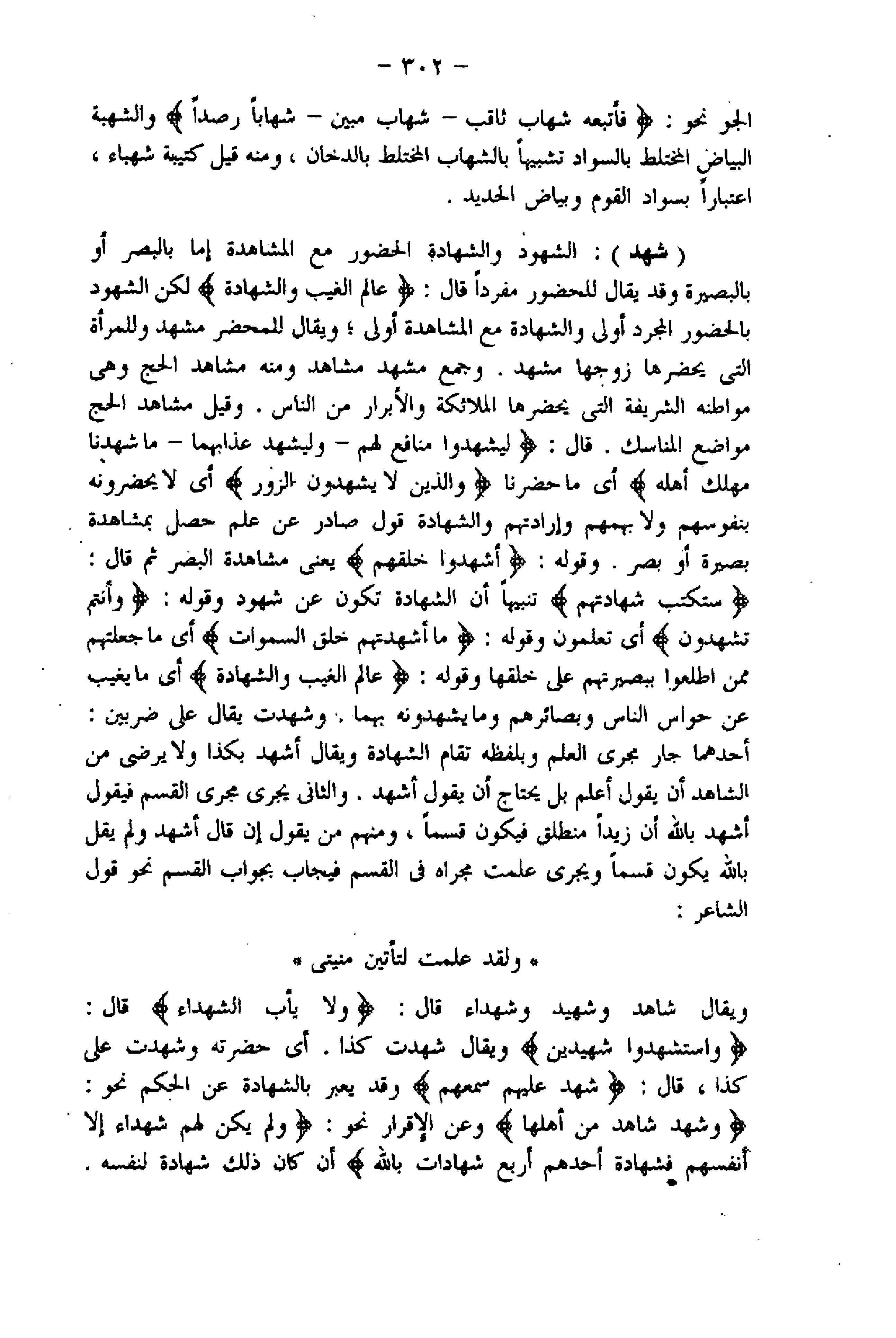 (شهد) : الشهود والشهادة الحضور مع المشاهدة إما بالبصر أو بالبصيرة وقد يقال للحضور مفردا قال: عالِمُ الْغَيْبِ وَالشَّهادَةِ لكن الشهود بالحضور المجرد أولى والشهادة مع المشاهدة أولى ويقال للمحضر مشهد وللمرأة التي يحضرها زوجها مشهد. وجمع مشهد مشاهد ومنه مشاهد الحج وهى مواطنه الشريفة التي يحضرها الملائكة والأبرار من الناس. وقيل مشاهد الحج مواضع المناسك. قال: لِيَشْهَدُوا مَنافِعَ لَهُمْ- وَلْيَشْهَدْ عَذابَهُما- ما شَهِدْنا مَهْلِكَ أَهْلِهِ أي ما حضرنا وَالَّذِينَ لا يَشْهَدُونَ الزُّورَ أي لا يحضرونه بنفوسهم ولا بهمهم وإرادتهم والشهادة قول صادر عن علم حصل بمشاهدة بصيرة أو بصر. وقوله: أَشَهِدُوا خَلْقَهُمْ يعنى مشاهدة البصر ثم قال:
