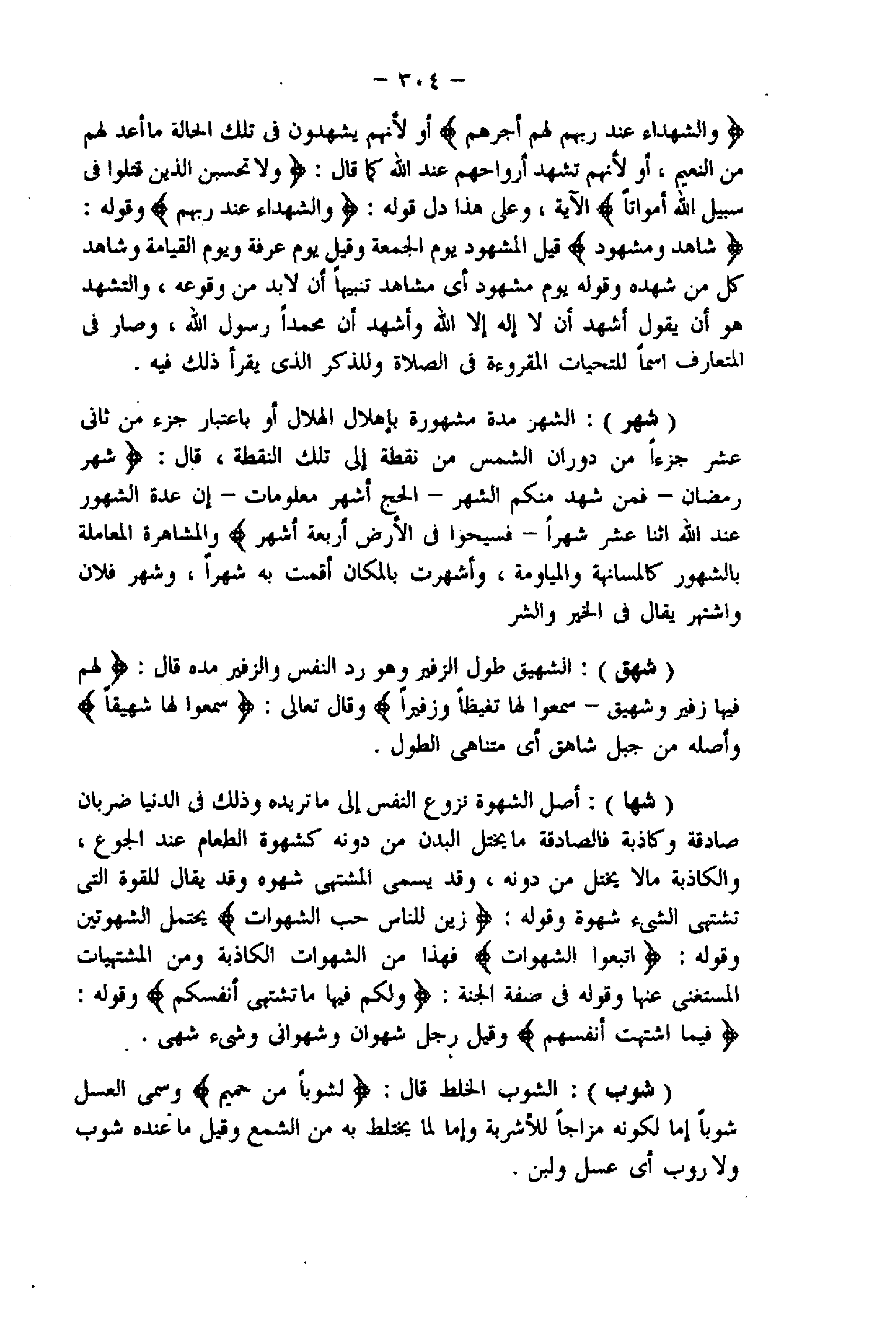 (شهر) : الشهر مدة مشهورة بإهلال الهلال أو باعتبار جزء من ثانى عشر جزءا من دوران الشمس من نقطة إلى تلك النقطة، قال: شَهْرُ رَمَضانَ- فَمَنْ شَهِدَ مِنْكُمُ الشَّهْرَ- الْحَجُّ أَشْهُرٌ مَعْلُوماتٌ- إِنَّ عِدَّةَ الشُّهُورِ عِنْدَ اللَّهِ اثْنا عَشَرَ شَهْراً- فَسِيحُوا فِي الْأَرْضِ أَرْبَعَةَ أَشْهُرٍ والمشاهرة المعاملة بالشهور كالمسانهة والمياومة، وأشهرت بالمكان أقمت به شهرا، وشهر فلان واشتهر يقال فى الخير والشر (شهق) : الشهيق طول الزفير وهو رد النفس والزفير مده قال: لَهُمْ فِيها زَفِيرٌ وَشَهِيقٌ- سَمِعُوا لَها تَغَيُّظاً وَزَفِيراً وقال تعالى: سَمِعُوا لَها شَهِيقاً وأصله من جبل شاهق أي متناهى الطول.