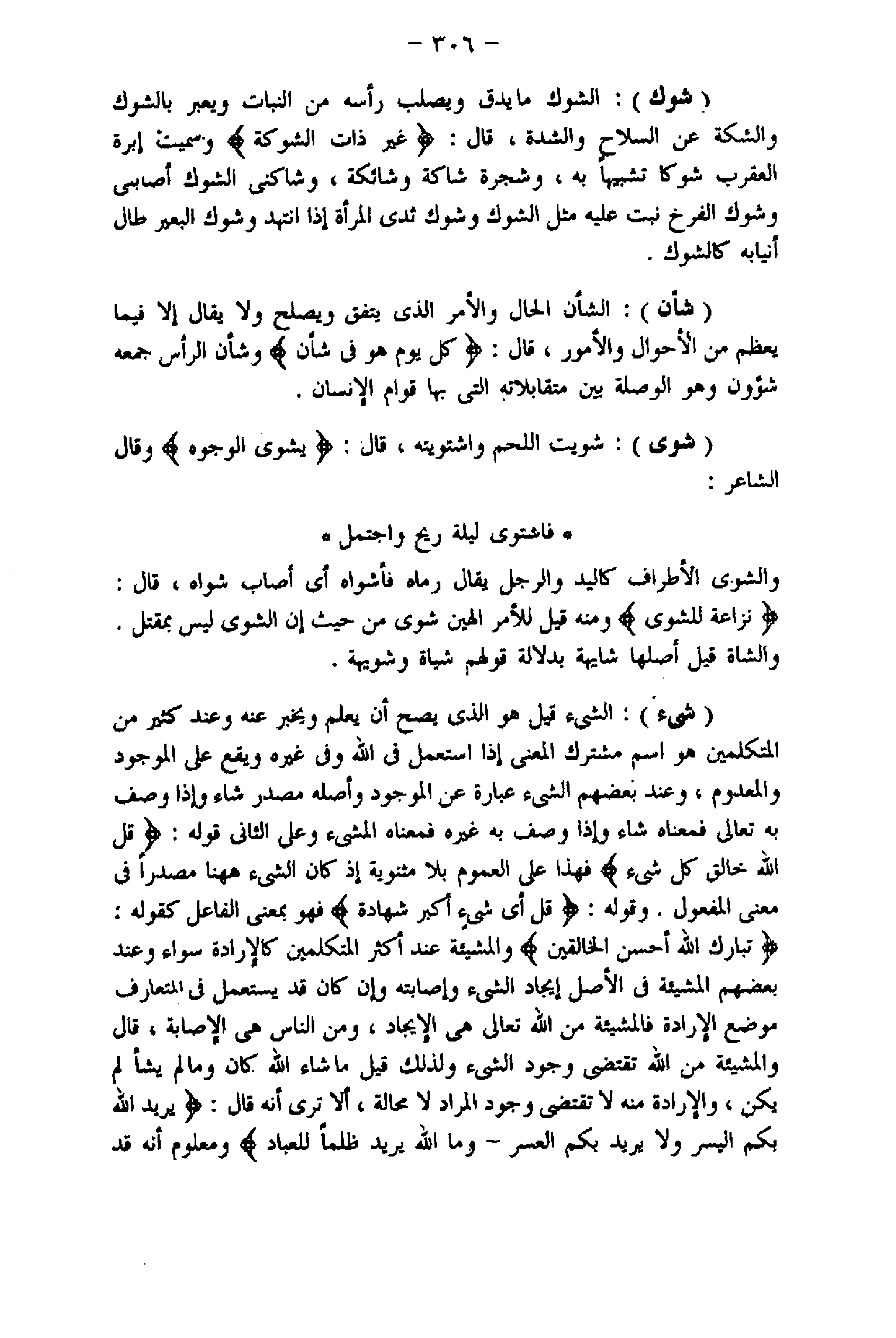 (شىء) : الشيء قيل هو الذي يصح أن يعلم ويخبر عنه وعند كثير من المتكلمين هو اسم مشترك المعنى إذا استعمل فى اللَّه وفى غيره ويقع على الموجود والمعدوم، وعند بعضهم الشيء عبارة عن الموجود وأصله مصدر شاء وإذا وصف به تعالى فمعناه شاء وإذا وصف به غيره فمعناه المشيء وعلى الثاني قوله: قُلِ اللَّهُ خالِقُ كُلِّ شَيْءٍ فهذا على العموم بلا مثنوية إذا كان الشيء هاهنا مصدرا فى معنى المفعول. وقوله: قُلْ أَيُّ شَيْءٍ أَكْبَرُ شَهادَةً فهو بمعنى الفاعل كقوله: