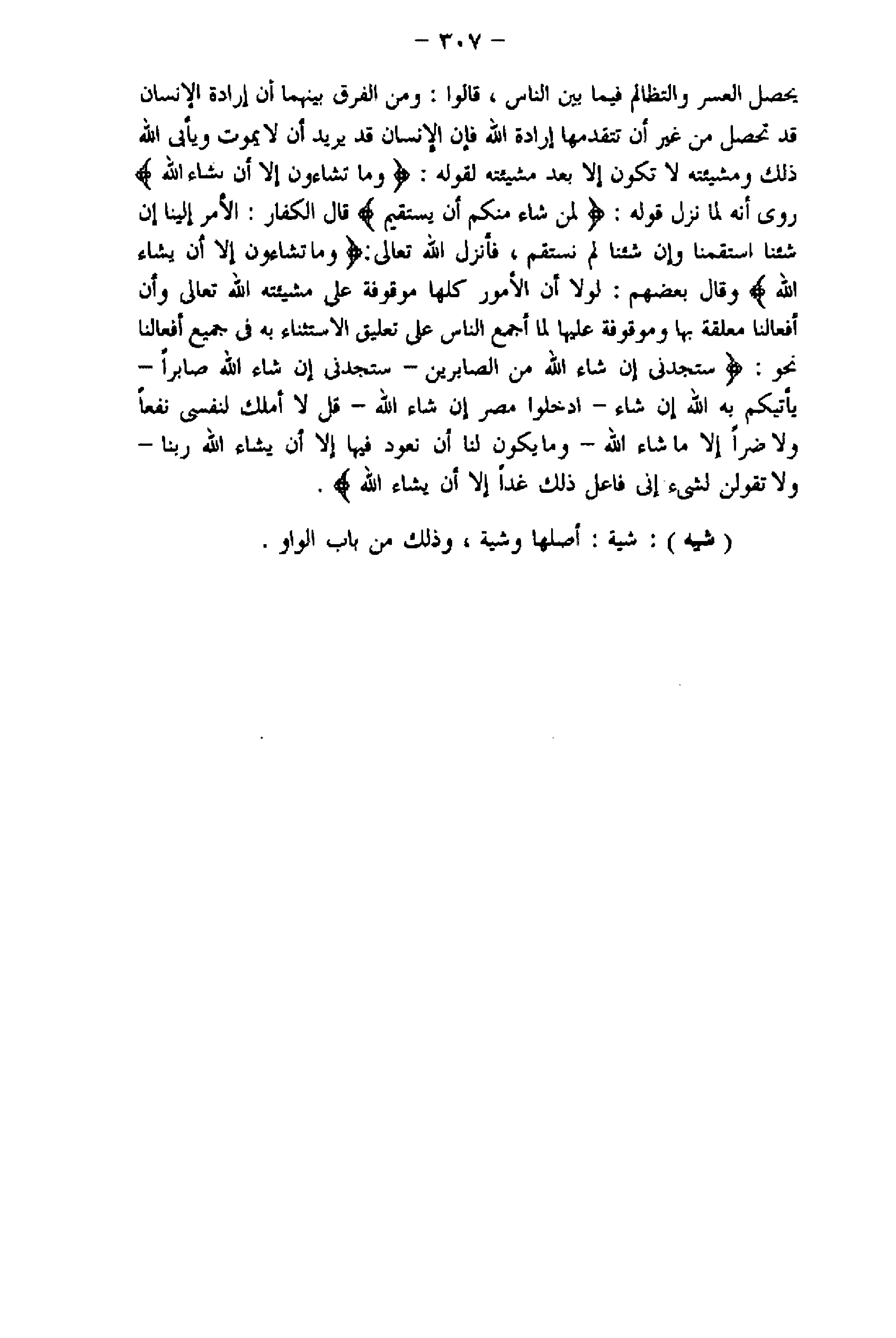 يحصل العسر والتظالم فيما بين الناس، قالوا: ومن الفرق بينهما أن الإرادة الإنسان قد تحصل من غير أن تتقدمها إرادة اللَّه فإن الإنسان قد يريد أن لا يموت ويأبى اللَّه ذلك ومشيئته لا يتكون إلا بعد مشيئته لقوله: وَما تَشاؤُنَ إِلَّا أَنْ يَشاءَ اللَّهُ روى أنه لما نزل قوله: لِمَنْ شاءَ مِنْكُمْ أَنْ يَسْتَقِيمَ قال الكفار: الأمر إلينا إن شئنا استقمنا وإن شئنا لم نستقم، فأنزل اللَّه تعالى: وَما تَشاؤُنَ إِلَّا أَنْ يَشاءَ اللَّهُ وقال بعضهم: لولا أن الأمور كلها موقوفة على مشيئته اللَّه تعالى وأن أفعالنا معلقة بها وموقوفة عليها لما أجمع الناس على تعليق الاستثناء به فى جميع أفعالنا نحو: سَتَجِدُنِي إِنْ شاءَ اللَّهُ مِنَ الصَّابِرِينَ- سَتَجِدُنِي إِنْ شاءَ اللَّهُ صابِراً- يَأْتِيكُمْ بِهِ اللَّهُ إِنْ شاءَ- ادْخُلُوا مِصْرَ إِنْ شاءَ اللَّهُ- قُلْ لا أَمْلِكُ لِنَفْسِي نَفْعاً وَلا ضَرًّا إِلَّا ما شاءَ اللَّهُ- وَما يَكُونُ لَنا أَنْ نَعُودَ فِيها إِلَّا أَنْ يَشاءَ اللَّهُ رَبُّنا- وَلا تَقُولَنَّ لِشَيْءٍ إِنِّي فاعِلٌ ذلِكَ غَداً إِلَّا أَنْ يَشاءَ اللَّهُ.