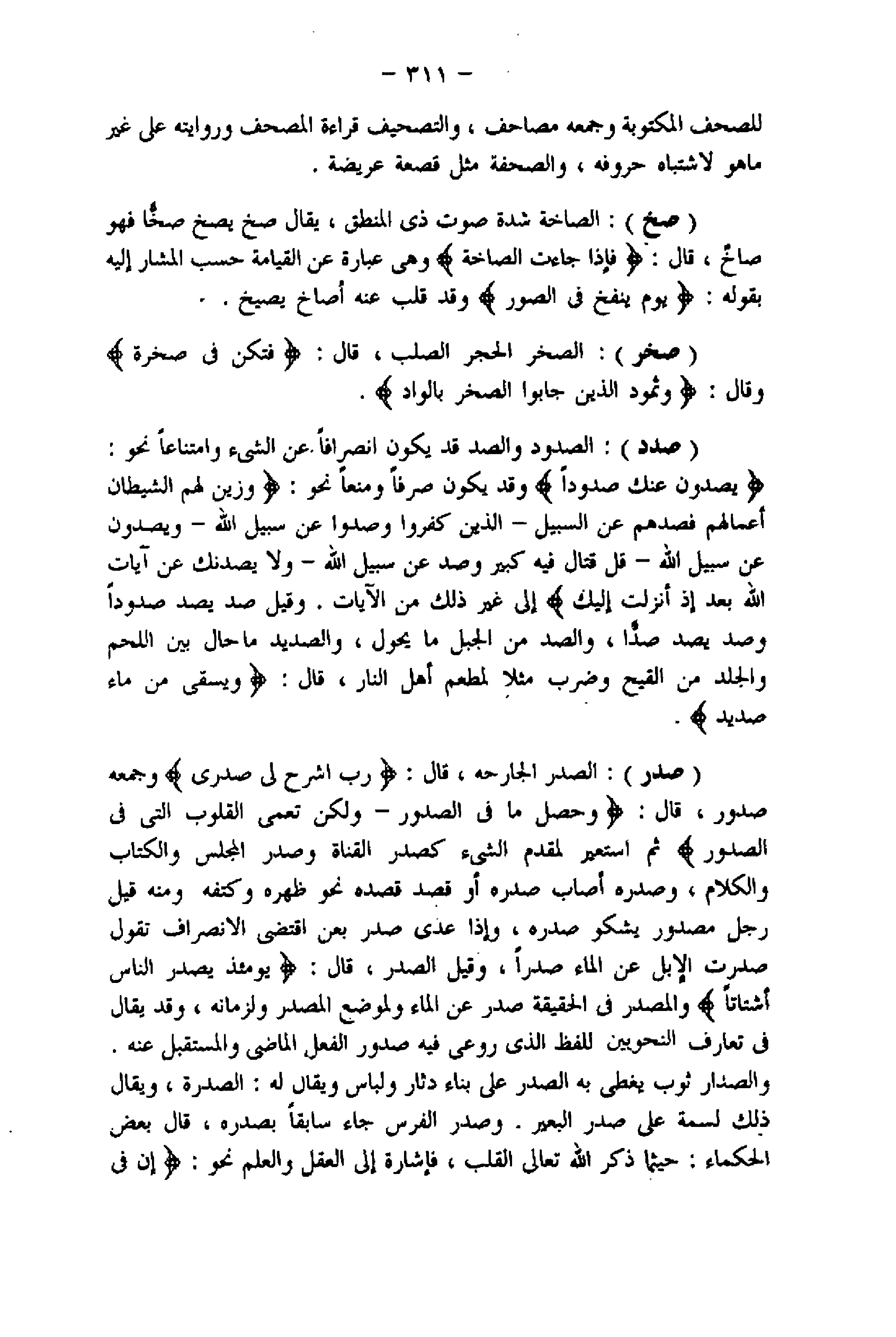 (صدر) : الصدر الجارحه، قال: رَبِّ اشْرَحْ لِي صَدْرِي وجمعه صدور، قال: وَحُصِّلَ ما فِي الصُّدُورِ- وَلكِنْ تَعْمَى الْقُلُوبُ الَّتِي فِي الصُّدُورِ ثم استعير لمقدم الشيء كصدر القناة وصدر المجلس والكتاب والكلام، وصدره أصاب صدره أو قصد قصده نحو ظهره وكتفه ومنه قيل رجل مصدور يشكو صدره، وإذا عدى صدر بعن اقتضى الانصراف تقول صدرت الإبل عن الماء صدرا، وقيل الصدر، قال: يَوْمَئِذٍ يَصْدُرُ النَّاسُ أَشْتاتاً والمصدر فى الحقيقة صدر عن الماء ولموضع المصدر ولزمانه، وقد يقال فى تعارف النحويين للفظ الذي روعى فيه صدور الفعل الماضي والمستقبل عنه.