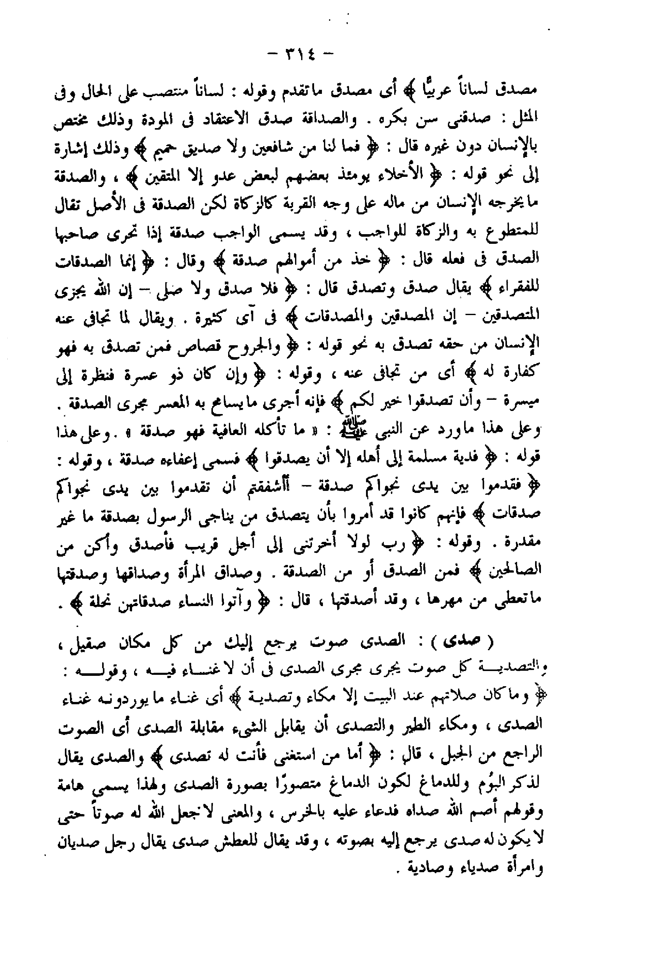 فَقَدِّمُوا بَيْنَ يَدَيْ نَجْواكُمْ صَدَقَةً- أَأَشْفَقْتُمْ أَنْ تُقَدِّمُوا بَيْنَ يَدَيْ نَجْواكُمْ صَدَقاتٍ فإنهم كانوا قد أمروا بأن يتصدق من يناجى الرسول بصدقة ما غير مقدرة. وقوله: رَبِّ لَوْلا أَخَّرْتَنِي إِلى أَجَلٍ قَرِيبٍ فَأَصَّدَّقَ وَأَكُنْ مِنَ الصَّالِحِينَ فمن الصدق أو من الصدقة. وصداق المرأة وصداقها وصدقتها ما تعطى من مهرها، وقد أصدقتها، قال: وَآتُوا النِّساءَ صَدُقاتِهِنَّ نِحْلَةً.