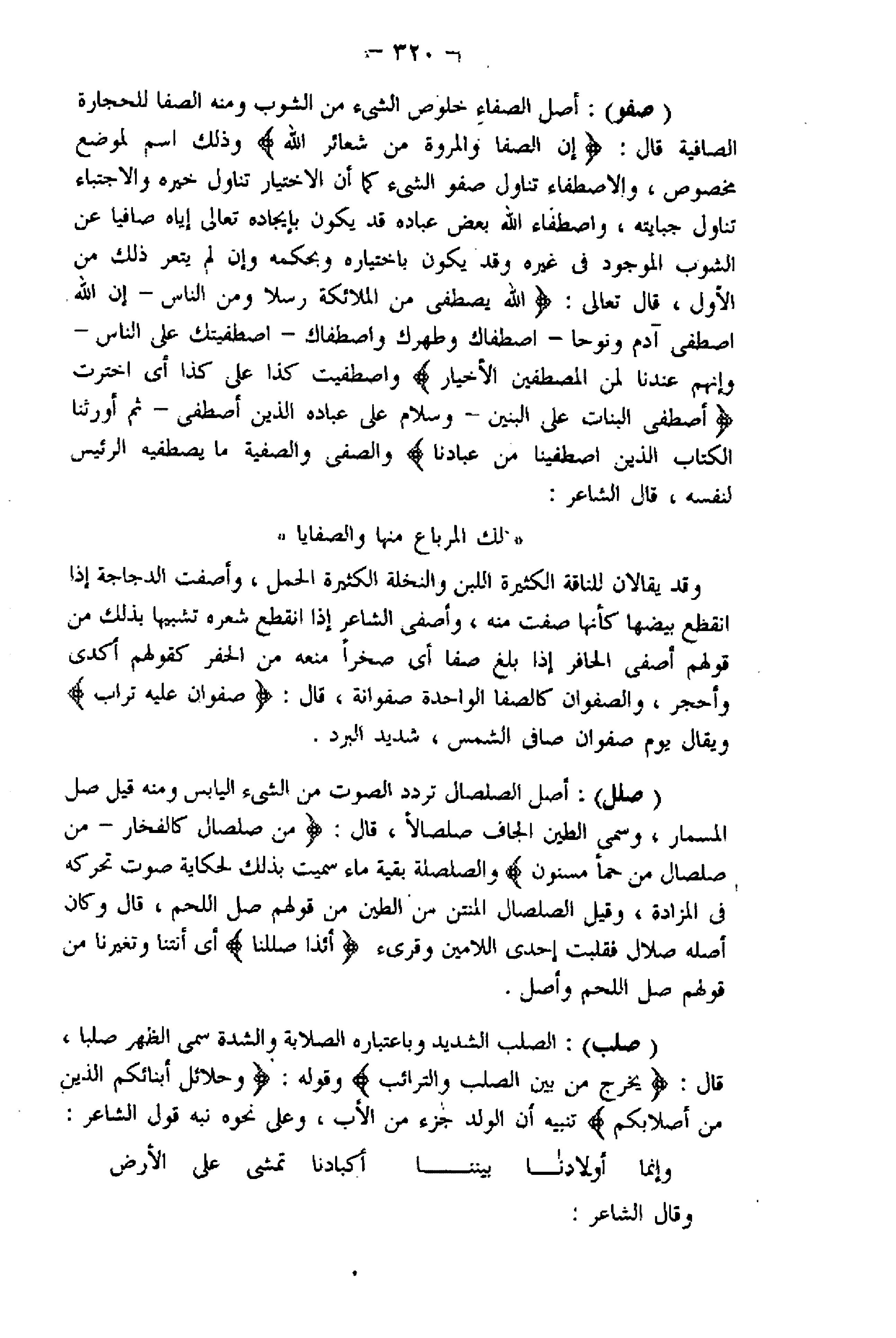 (صفو) : أصل الصفاء خلوص الشيء من الشوب ومنه الصفا للحجارة الصافية قال: إِنَّ الصَّفا وَالْمَرْوَةَ مِنْ شَعائِرِ اللَّهِ وذلك اسم لموضع مخصوص، والاصطفاء تناول صفو الشيء كما أن الاختيار تناول خيره والاجتباء تناول جبايته، واصطفاء اللَّه بعض عباده قد يكون بإيجاده تعالى إياه صافيا عن الشوب الموجود فى غيره وقد يكون باختياره وبحكمه وإن لم يتعر ذلك من الأول، قال تعالى: اللَّهُ يَصْطَفِي مِنَ الْمَلائِكَةِ رُسُلًا وَمِنَ النَّاسِ- إِنَّ اللَّهَ اصْطَفى آدَمَ وَنُوحاً اصْطَفاكِ وَطَهَّرَكِ وَاصْطَفاكِ- اصْطَفَيْتُكَ عَلَى النَّاسِ- وَإِنَّهُمْ عِنْدَنا لَمِنَ الْمُصْطَفَيْنَ الْأَخْيارِ واصطفيت كذا على كذا أي اخترت أَصْطَفَى الْبَناتِ عَلَى الْبَنِينَ- وَسَلامٌ عَلى عِبادِهِ الَّذِينَ اصْطَفى - ثُمَّ أَوْرَثْنَا الْكِتابَ الَّذِينَ اصْطَفَيْنا مِنْ عِبادِنا