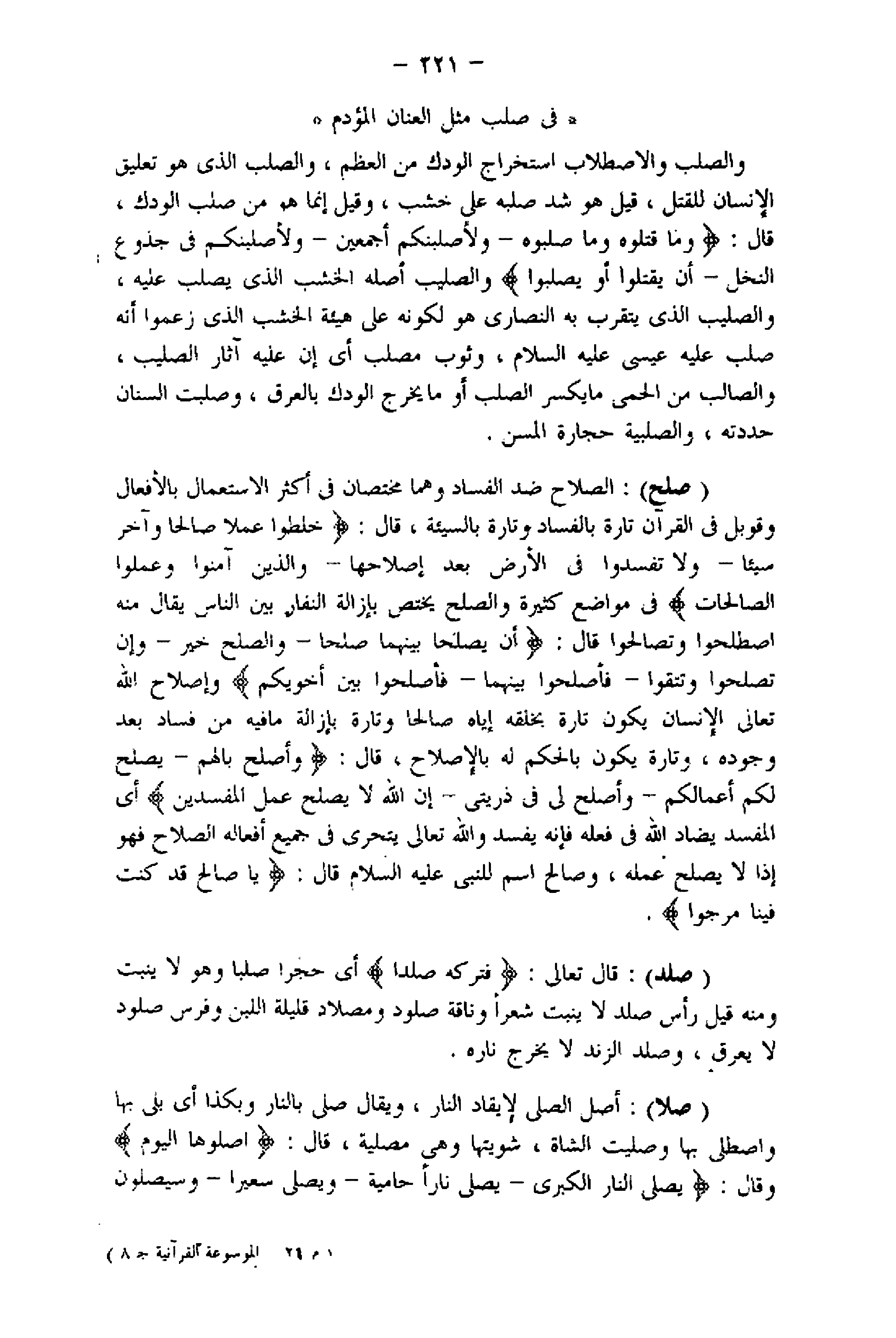 (صلح) : الصلاح ضد الفساد وهما مختصان فى أكثر الاستعمال بالأفعال وقوبل فى القرآن تارة بالفساد وتارة بالسيئة، قال: خَلَطُوا عَمَلًا صالِحاً وَآخَرَ سَيِّئاً- وَلا تُفْسِدُوا فِي الْأَرْضِ بَعْدَ إِصْلاحِها- وَالَّذِينَ آمَنُوا وَعَمِلُوا الصَّالِحاتِ فى مواضع كثيرة والصلح يختص بإزالة النفار بين الناس يقال منه اصطلحوا وتصالحوا قال: أَنْ يُصْلِحا بَيْنَهُما صُلْحاً- وَالصُّلْحُ خَيْرٌ- وَإِنْ تُصْلِحُوا وَتَتَّقُوا- فَأَصْلِحُوا بَيْنَهُما- فَأَصْلِحُوا بَيْنَ أَخَوَيْكُمْ وإصلاح اللَّه تعالى الإنسان يكون تارة بخلقه إياه صالحا وتارة بإزالة ما فيه من فساد بعد وجوده، وتارة يكون بالحكم له بالإصلاح، قال: وَأَصْلَحَ بالَهُمْ- يُصْلِحْ لَكُمْ أَعْمالَكُمْ- وَأَصْلِحْ لِي فِي ذُرِّيَّتِي- إِنَّ اللَّهَ لا يُصْلِحُ عَمَلَ الْمُفْسِدِينَ أي المفسد يضاد اللَّه فى فعله فإنه يفسد واللَّه تعالى يتحرى فى جميع أفعاله الصلاح فهو إذا لا يصلح عمله، وصالح اسم للنبى عليه السلام قال: يا صالِحُ قَدْ كُنْتَ فِينا مَرْجُوًّا.