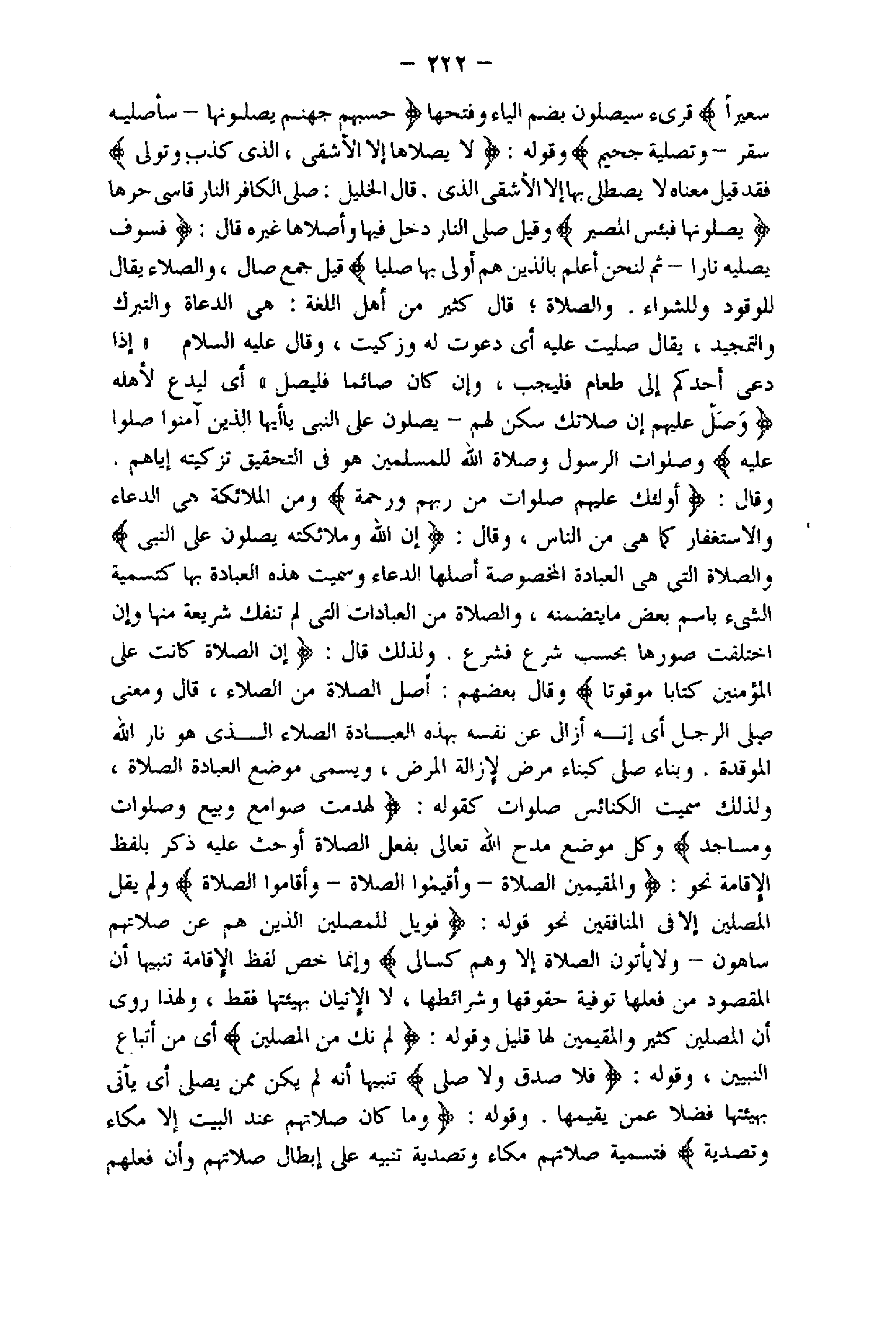 وقال: أُولئِكَ عَلَيْهِمْ صَلَواتٌ مِنْ رَبِّهِمْ وَرَحْمَةٌ ومن الملائكة هى الدعاء والاستغفار كما هى من الناس، وقال: إِنَّ اللَّهَ وَمَلائِكَتَهُ يُصَلُّونَ عَلَى النَّبِيِّ والصلاة التي هى العبادة المخصوصة أصلها الدعاء وسميت هذه العبادة بها كتسمية الشيء باسم بعض ما يتضمنه، والصلاة من العبادات التي لم تنفك شريعة منها وإن اختلفت صورها بحسب شرع فشرع. ولذلك قال: إِنَّ الصَّلاةَ كانَتْ عَلَى الْمُؤْمِنِينَ كِتاباً مَوْقُوتاً وقال بعضهم: أصل الصلاة من الصلاء، قال ومعنى صلى الرجل أي إنه أزال عن نفسه بهذه العبادة الصلاء الذي هو نار اللَّه الموقدة. وبناء صلى كبناء مرض لإزالة المرض، ويسمى موضع العبادة الصلاة، ولذلك سميت الكنائس صلوات كقوله: لَهُدِّمَتْ صَوامِعُ وَبِيَعٌ وَصَلَواتٌ وَمَساجِدُ وكل موضع مدح اللَّه تعالى بفعل الصلاة أو حث عليه ذكر بلفظ الإقامة نحو: وَالْمُقِيمِينَ الصَّلاةَ- وَأَقِيمُوا الصَّلاةَ- وَأَقامُوا الصَّلاةَ ولم يقل المصلين إلا فى المنافقين نحو قوله: فَوَيْلٌ لِلْمُصَلِّينَ الَّذِينَ هُمْ عَنْ صَلاتِهِمْ ساهُونَ وَلا يَأْتُونَ الصَّلاةَ إِلَّا وَهُمْ كُسالى وإنما خص لفظ الإقامة تنبيها أن المقصود من فعلها توفية حقوقها وشرائطها، لا الإتيان بهيئتها فقط، ولهذا روى أن المصلين كثير والمقيمين لها قليل وقوله: لَمْ نَكُ مِنَ الْمُصَلِّينَ أي من أتباع النبيين، وقوله: فَلا صَدَّقَ وَلا صَلَّى تنبيها أنه لم يكن ممن يصلى أي يأتى بهيئتها فضلا عمن يقيمها. وقوله: وَما كانَ صَلاتُهُمْ عِنْدَ الْبَيْتِ إِلَّا مُكاءً وَتَصْدِيَةً فتسمية صلاتهم مكاء وتصدية تنبيه على إبطال صلاتهم وأن فعلهم