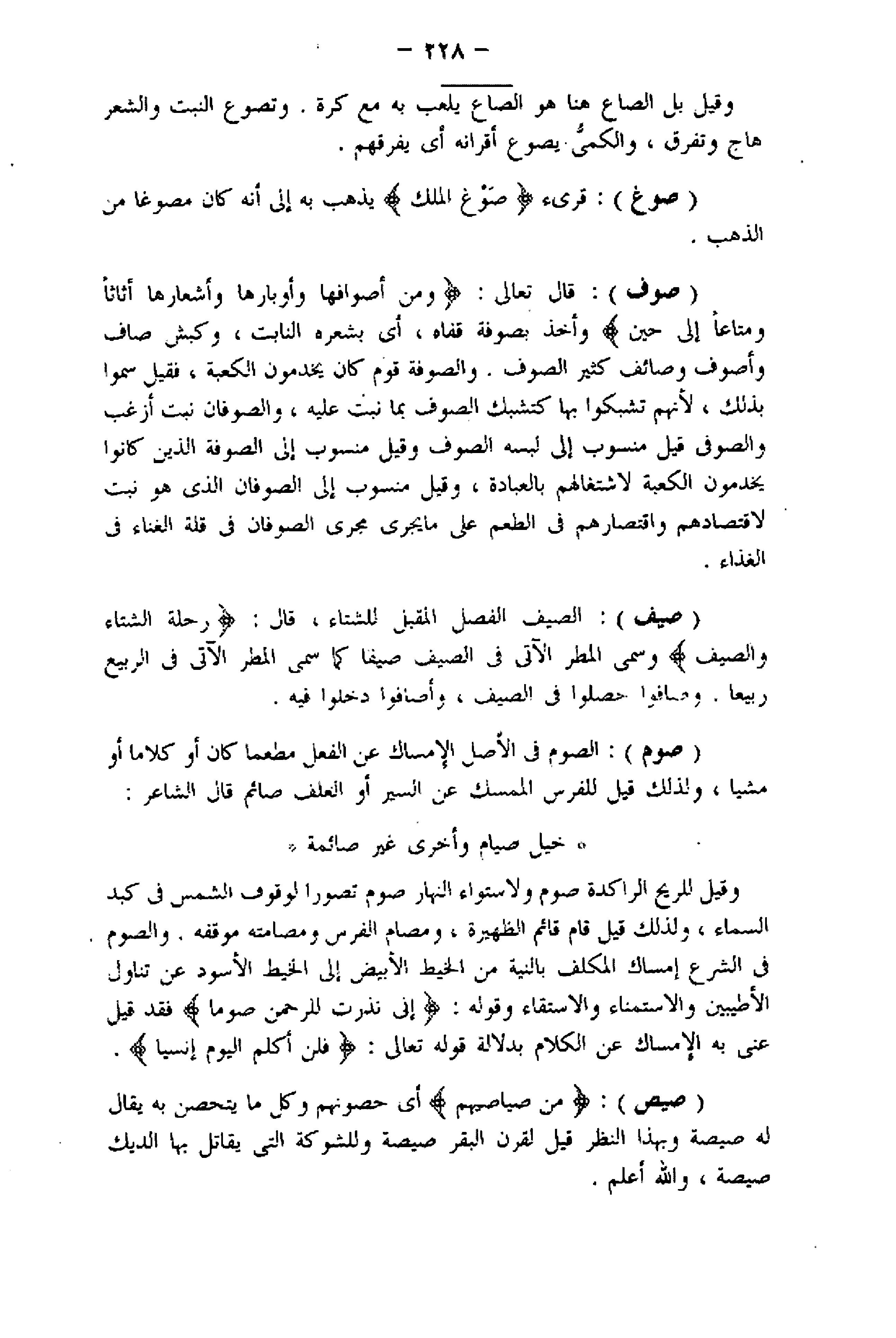 (صيف) : الصيف الفصل المقبل للشتاء، قال: رِحْلَةَ الشِّتاءِ وَالصَّيْفِ وسمى المطر الآتي فى الصيف صيفا كما سمى المطر الآتي فى الربيع ربيعا. وصافوا حصلوا فى الصيف، وأصافوا دخلوا فيه.