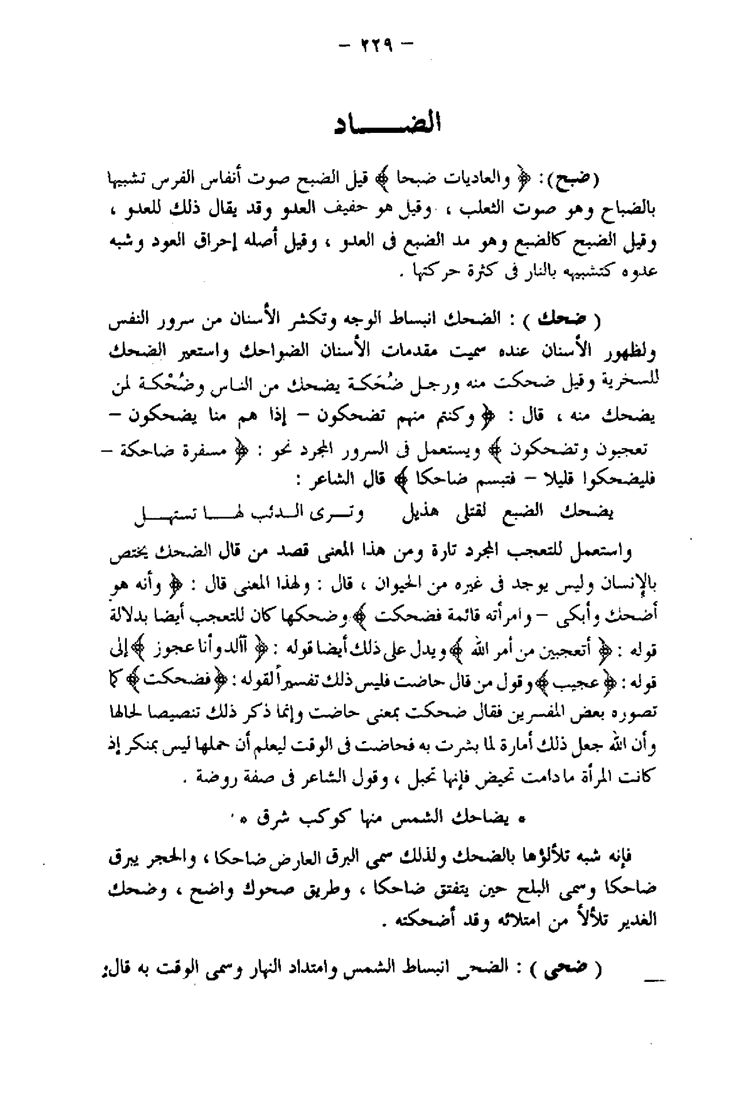 واستعمل للتعجب المجرد تارة ومن هذا المعنى قصد من قال الضحك يختص بالإنسان وليس يوجد فى غيره من الحيوان، قال: ولهذا المعنى قال: وَأَنَّهُ هُوَ أَضْحَكَ وَأَبْكى - وَامْرَأَتُهُ قائِمَةٌ فَضَحِكَتْ وضحكها كان للتعجب أيضا بدلالة قوله: أَتَعْجَبِينَ مِنْ أَمْرِ اللَّهِ ويدل على ذلك أيضا قوله: أَأَلِدُ وَأَنَا عَجُوزٌ إلى قوله: عَجِيبٌ وقول من قال حاضت فليس ذلك تفسير لقوله: فَضَحِكَتْ كما تصوره بعض المفسرين فقال ضحكت بمعنى حاضت وإنما ذكر ذلك تنصيصا لحالها وأن اللَّه جعل ذلك أمارة لما بشرت به فحاضت فى الوقت ليعلم أن حملها ليس بمنكر إذ كانت المرأة ما دامت تحيض فإنها تحبل، وقول الشاعر فى صفة روضة.