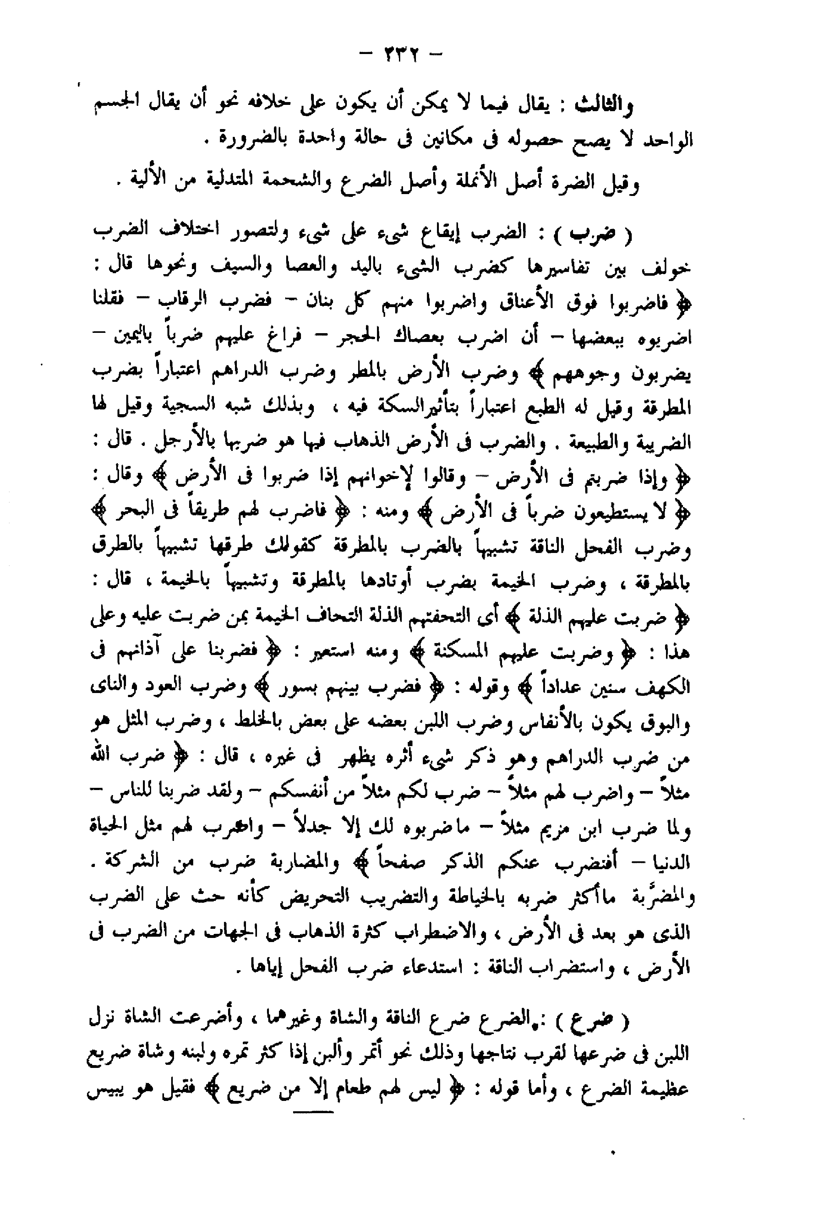 - أَنِ اضْرِبْ بِعَصاكَ الْحَجَرَ- فَراغَ عَلَيْهِمْ ضَرْباً بِالْيَمِينِ- يَضْرِبُونَ وُجُوهَهُمْ وضرب الأرض بالمطر وضرب الدراهم اعتبارا بضرب المطرقة وقيل له الطبع اعتبارا بتأثير السكة فيه، وبذلك شبه السجية وقيل لها الضريبة والطبيعة. والضرب فى الأرض الذهاب فيها هو ضربها بالأرجل. قال: