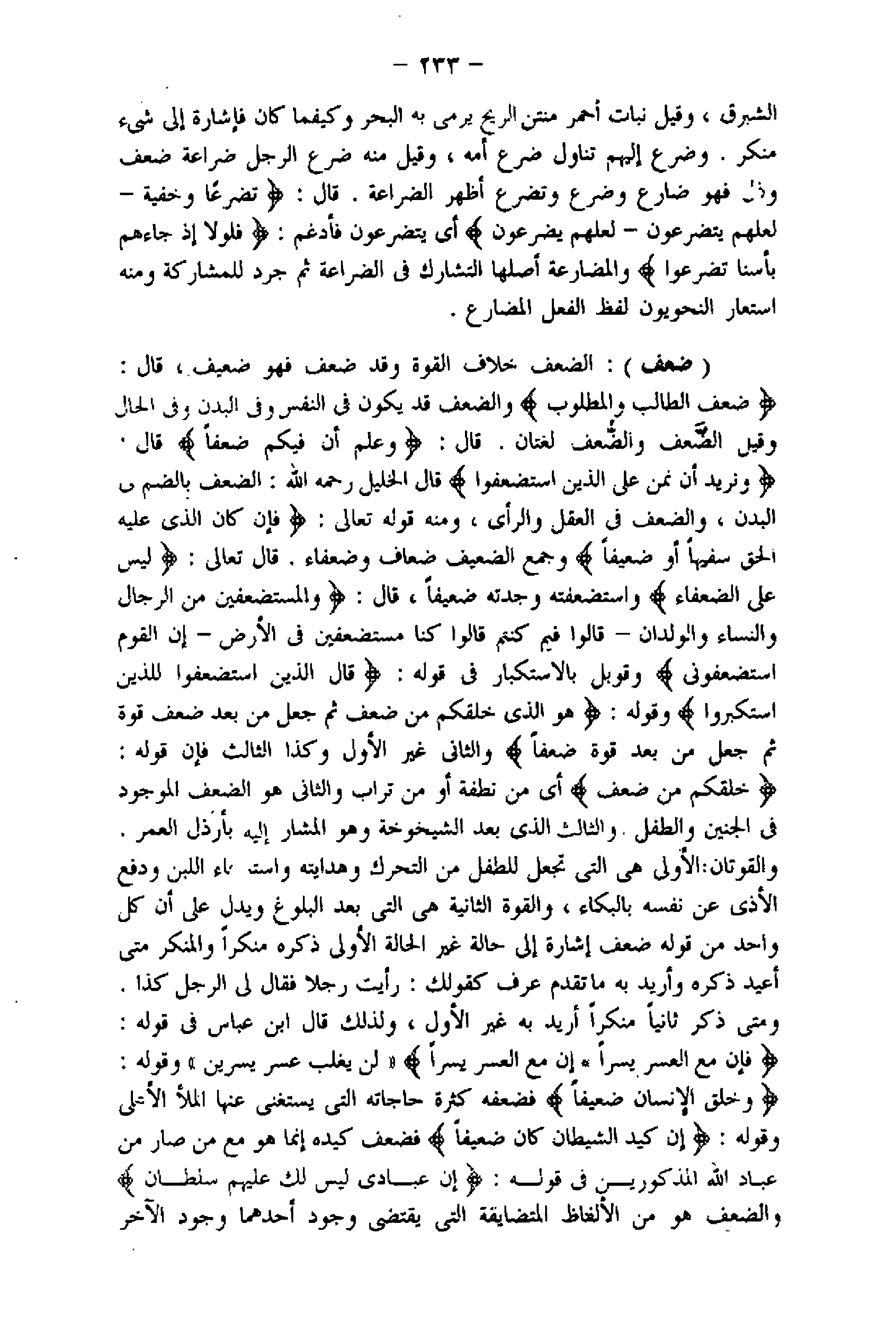 الشبرق، وقيل نبات أحمر منتن الريح يرمى به البحر وكيفما كان فإشارة إلى شىء منكر. وضرع إليهم تناول ضرع أمه، وقيل منه ضرع الرجل ضراعة ضعف وذل فهو ضارع وضرع وتضرع أظهر الضراعة. قال: تَضَرُّعاً وَخُفْيَةً- لَعَلَّهُمْ يَتَضَرَّعُونَ- لَعَلَّهُمْ يَضَّرَّعُونَ أي يتضرعون فأدغم: فَلَوْلا إِذْ جاءَهُمْ بَأْسُنا تَضَرَّعُوا والمضارعة أصلها التشارك فى الضراعة ثم جرد للمشاركة ومنه استعار النحويون لفظ الفعل المضارع.