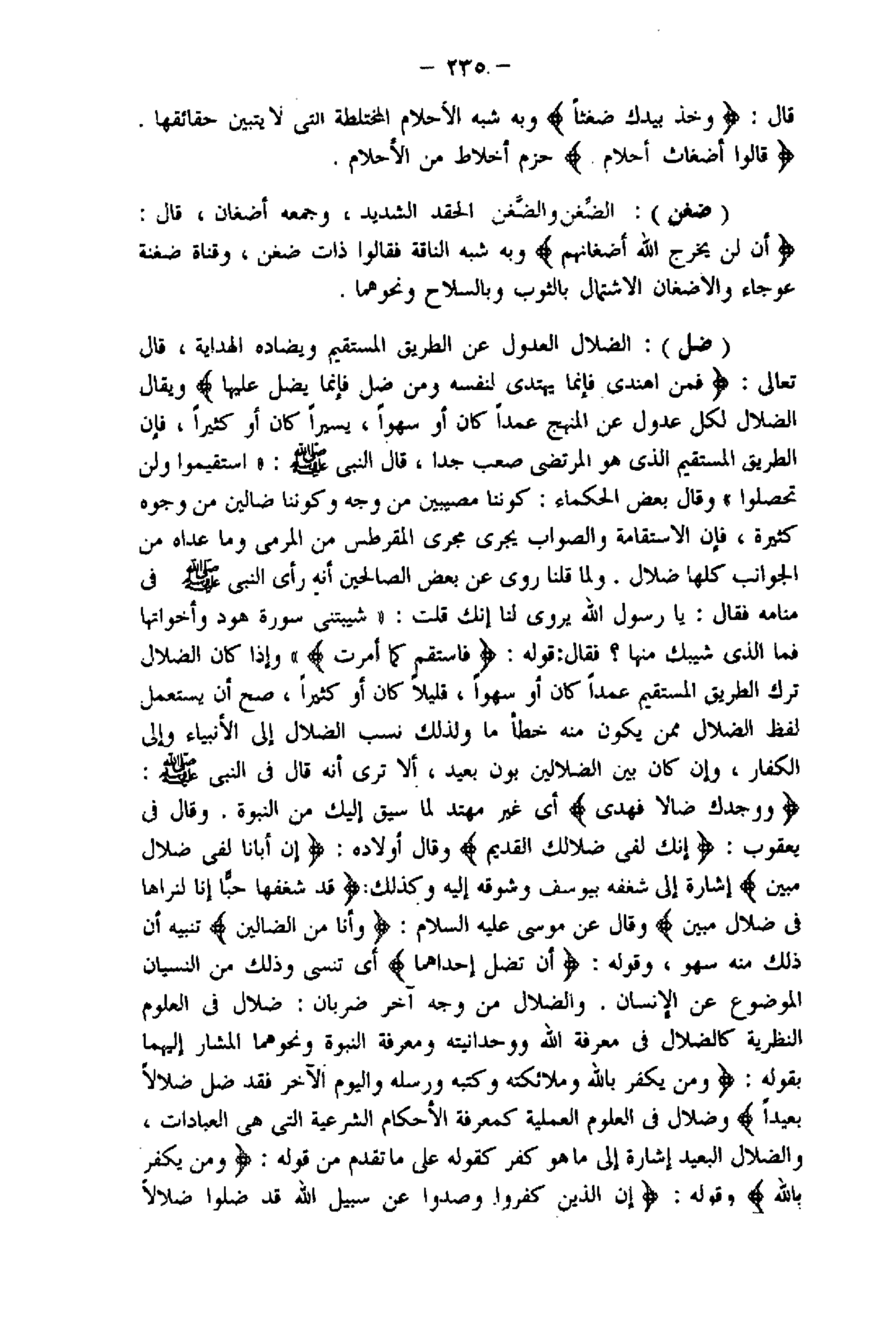 (ضل) : الضلال العدول عن الطريق المستقيم ويضاده الهداية، قال تعالى: فَمَنِ اهْتَدى فَإِنَّما يَهْتَدِي لِنَفْسِهِ وَمَنْ ضَلَّ فَإِنَّما يَضِلُّ عَلَيْها ويقال الضلال لكل عدول عن المنهج عمدا كان أو سهوا، يسيرا كان أو كثيرا، فإن الطريق المستقيم الذي هو المرتضى صعب جدا،