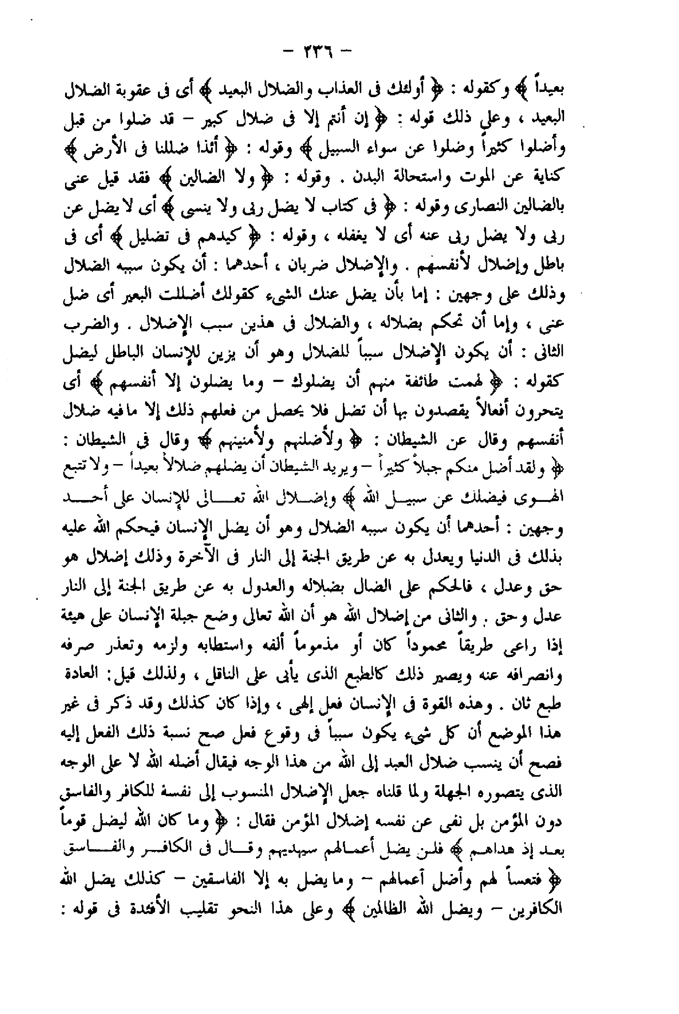 وكقوله: أولئك فِي الْعَذابِ وَالضَّلالِ الْبَعِيدِ أي فى عقوبة الضلال البعيد، وعلى ذلك قوله: إِنْ أَنْتُمْ إِلَّا فِي ضَلالٍ كَبِيرٍ- قَدْ ضَلُّوا مِنْ قَبْلُ وَأَضَلُّوا كَثِيراً وَضَلُّوا عَنْ سَواءِ السَّبِيلِ وقوله: أَإِذا ضَلَلْنا فِي الْأَرْضِ كناية عن الموت واستحالة البدن. وقوله: وَلَا الضَّالِّينَ فقد قيل عنى بالضالين النصارى وقوله: فِي كِتابٍ لا يَضِلُّ رَبِّي وَلا يَنْسى أي لا يضل عن ربى ولا يضل ربى عنه أي لا يغفله، وقوله: كَيْدَهُمْ فِي تَضْلِيلٍ أي فى باطل وإضلال لأنفسهم. والإضلال ضربان، أحدهما: أن يكون سببه الضلال وذلك على وجهين: إما بأن يضل عنك الشيء كقولك أضللت البعير أي ضل عنى، وإما أن تحكم بضلاله، والضلال فى هذين سبب الإضلال. والضرب الثاني: أن يكون الإضلال سببا للضلال وهو أن يزين للإنسان الباطل ليضل كقوله: لَهَمَّتْ طائِفَةٌ مِنْهُمْ أَنْ يُضِلُّوكَ
