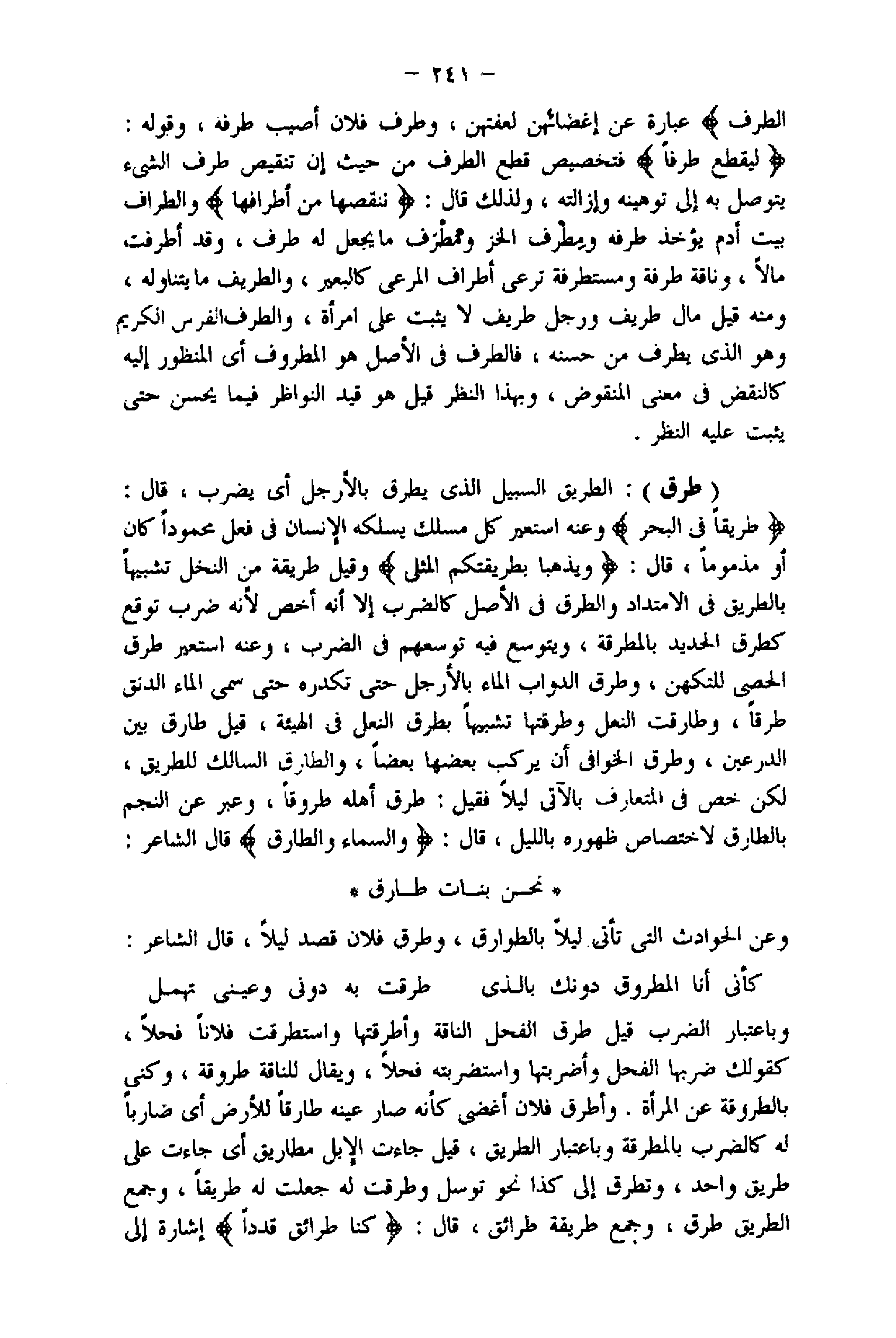 طَرِيقاً فِي الْبَحْرِ وعنه استعير كل مسلك يسلكه الإنسان فى فعل محمودا كان أو مذموما، قال: وَيَذْهَبا بِطَرِيقَتِكُمُ الْمُثْلى وقيل طريقة من النخل تشبيها بالطريق فى الامتداد والطرق فى الأصل كالضرب إلا أنه أخص لأنه ضرب توقع كطرق الحديد بالمطرقة، ويتوسع فيه توسعهم فى الضرب، وعنه استعير طرق الحصى للتكهن، وطرق الدواب الماء بالأرجل حتى تكدره حتى سمى الماء الدنق طرقا، وطارقت النعل وطرقتها تشبيها بطرق النعل فى الهيئة، قيل طارق بين الدرعين، وطرق الخوافي أن يركب بعضها بعضا، والطارق السالك للطريق، لكن خص فى المتعارف بالآتى ليلا فقيل: طرق أهله طروقا، وعبر عن النجم بالطارق لاختصاص ظهوره بالليل، قال: وَالسَّماءِ وَالطَّارِقِ قال الشاعر: