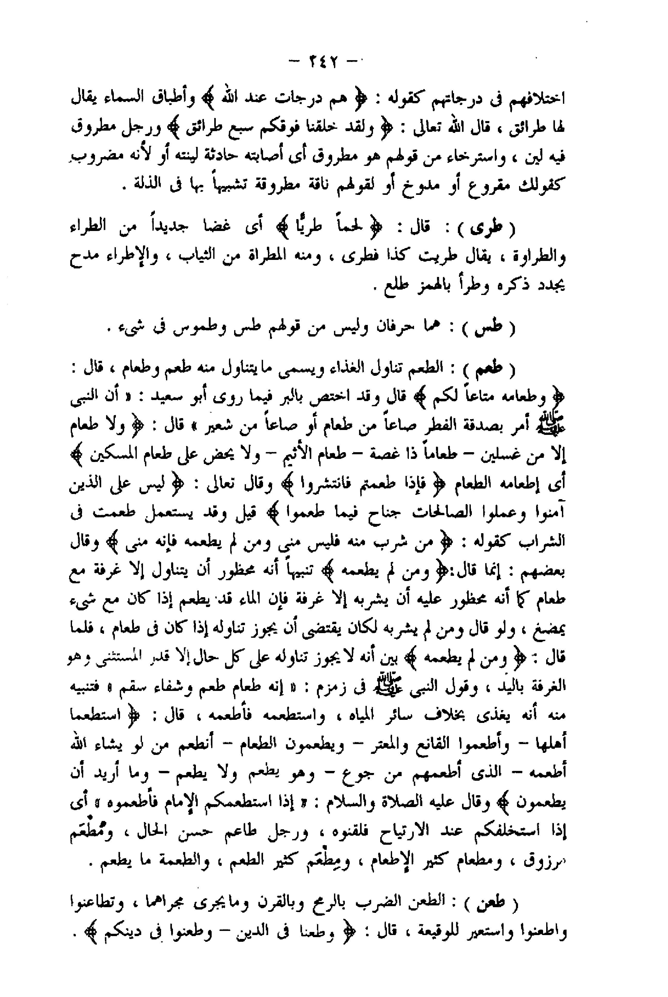 قال: وَلا طَعامٌ إِلَّا مِنْ غِسْلِينٍ- طَعاماً ذا غُصَّةٍ- طَعامُ الْأَثِيمِ- وَلا يَحُضُّ عَلى طَعامِ الْمِسْكِينِ أي إطعامه الطعام فَإِذا طَعِمْتُمْ فَانْتَشِرُوا وقال تعالى: لَيْسَ عَلَى الَّذِينَ آمَنُوا وَعَمِلُوا الصَّالِحاتِ جُناحٌ فِيما طَعِمُوا قيل وقد يستعمل طعمت فى الشراب كقوله: فَمَنْ شَرِبَ مِنْهُ فَلَيْسَ مِنِّي وَمَنْ لَمْ يَطْعَمْهُ فَإِنَّهُ مِنِّي وقال بعضهم: إنما قال: وَمَنْ لَمْ يَطْعَمْهُ تنبيها أنه محظور أن يتناول إلا غرفة مع طعام كما أنه محظور عليه أن يشربه إلا غرفة فإن الماء قد يطعم إذا كان مع شىء يمضغ، ولو قال ومن لم يشربه لكان يقتضى أن يجوز تناوله إذا كان فى طعام، فلما قال: وَمَنْ لَمْ يَطْعَمْهُ بين أنه لا يجوز تناوله على كل حال إلا قدر المستثنى وهو الغرفة باليد،