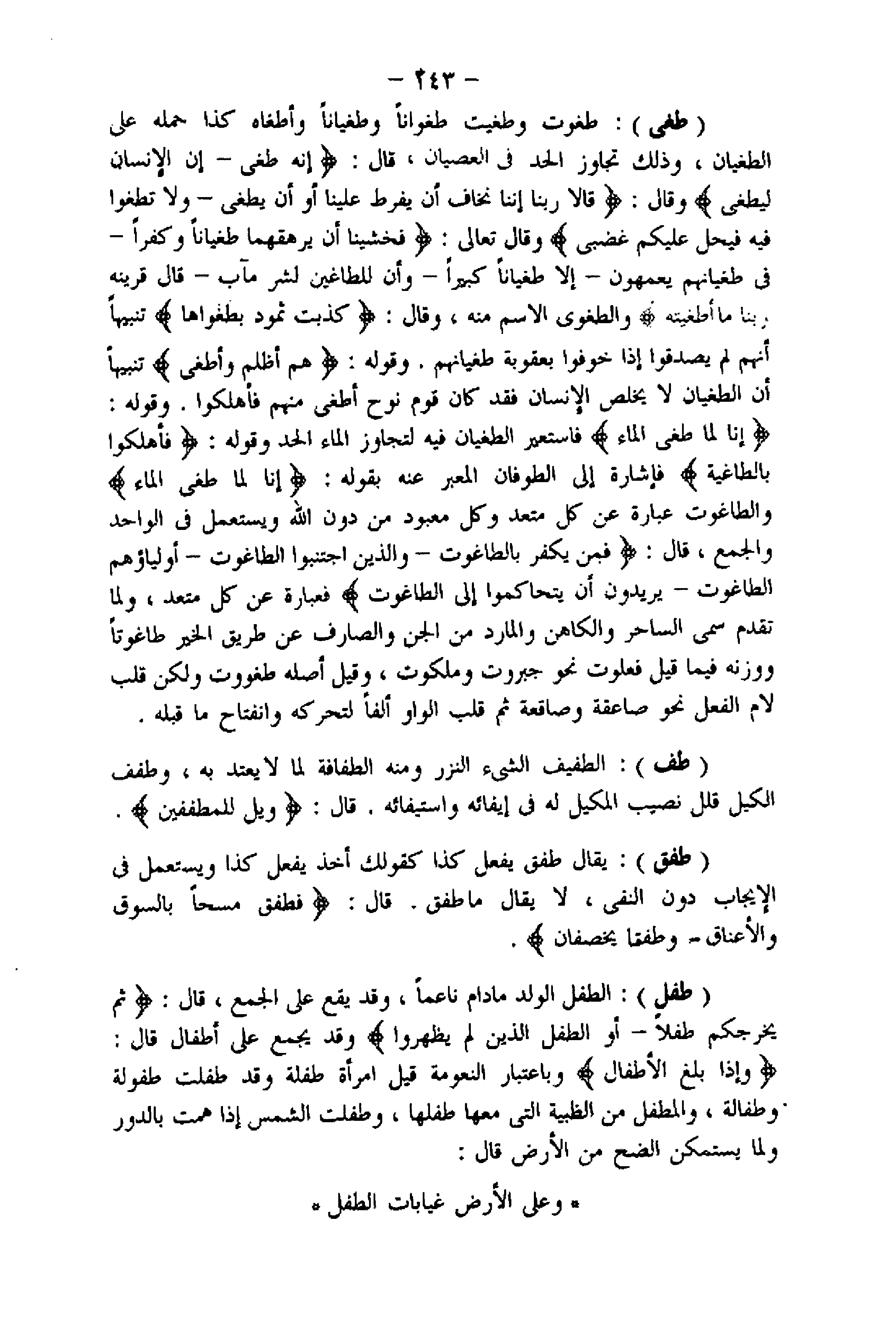 (طفق) : يقال طفق يفعل كذا كقولك أخذ يفعل كذا ويستعمل فى الإيجاب دون النفي، لا يقال ما طفق. قال: فَطَفِقَ مَسْحاً بِالسُّوقِ وَالْأَعْناقِ- وَطَفِقا يَخْصِفانِ.