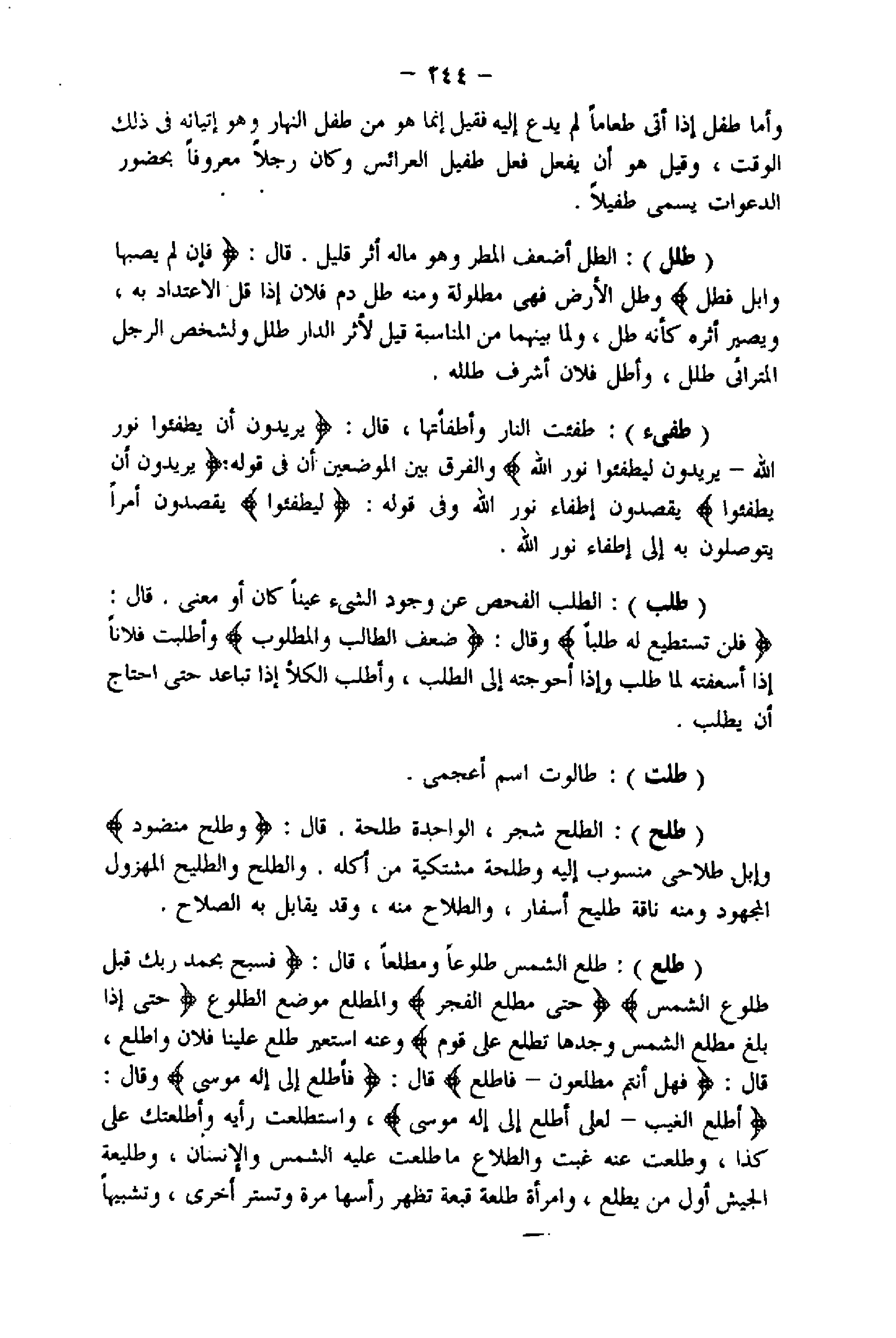 (طلع) : طلع الشمس طلوعا ومطلعا، قال: وَسَبِّحْ بِحَمْدِ رَبِّكَ قَبْلَ طُلُوعِ الشَّمْسِ حَتَّى مَطْلَعِ الْفَجْرِ والمطلع موضع الطلوع حَتَّى إِذا بَلَغَ مَطْلِعَ الشَّمْسِ وَجَدَها تَطْلُعُ عَلى قَوْمٍ وعنه استعير طلع علينا فلان واطلع، قال: هَلْ أَنْتُمْ مُطَّلِعُونَ- فَاطَّلَعَ قال: فَأَطَّلِعَ إِلى إِلهِ مُوسى وقال: