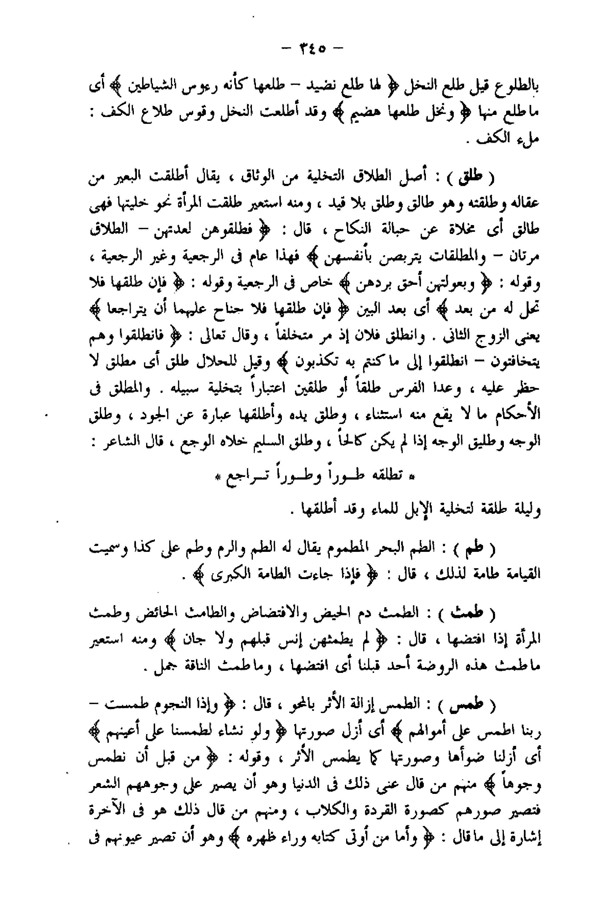 (طلق) : أصل الطلاق التخلية من الوثاق، يقال أطلقت البعير من عقاله وطلقته، وهو طالق وطلق بلا قيد، ومنه استعير طلقت المرأة نحو خليتها فهى طالق أي مخلاة عن حبالة النكاح، قال: فَطَلِّقُوهُنَّ لِعِدَّتِهِنَّ- الطَّلاقُ مَرَّتانِ- وَالْمُطَلَّقاتُ يَتَرَبَّصْنَ بِأَنْفُسِهِنَّ فهذا عام فى الرجعية وغير الرجعية، وقوله: وَبُعُولَتُهُنَّ أَحَقُّ بِرَدِّهِنَّ خاص فى الرجعية وقوله: فَإِنْ طَلَّقَها فَلا تَحِلُّ لَهُ مِنْ بَعْدُ أي بعد البين فَإِنْ طَلَّقَها فَلا جُناحَ عَلَيْهِما أَنْ يَتَراجَعا يعنى الزوج الثاني. وانطلق فلان إذ مر متخلفا، وقال تعالى: فَانْطَلَقُوا وَهُمْ يَتَخافَتُونَ- انْطَلِقُوا إِلى ما كُنْتُمْ بِهِ تُكَذِّبُونَ وقيل للحلال طلق أي مطلق لا حظر عليه، وعدا الفرس طلقا أو طلقين اعتبارا بتخلية سبيله. والمطلق فى الأحكام ما لا يقع منه استثناء، وطلق يده وأطلقها عبارة عن الجود، وطلق الوجه وطليق الوجه إذا لم يكن كالحا، وطلق السليم خلاه الوجع، قال الشاعر: