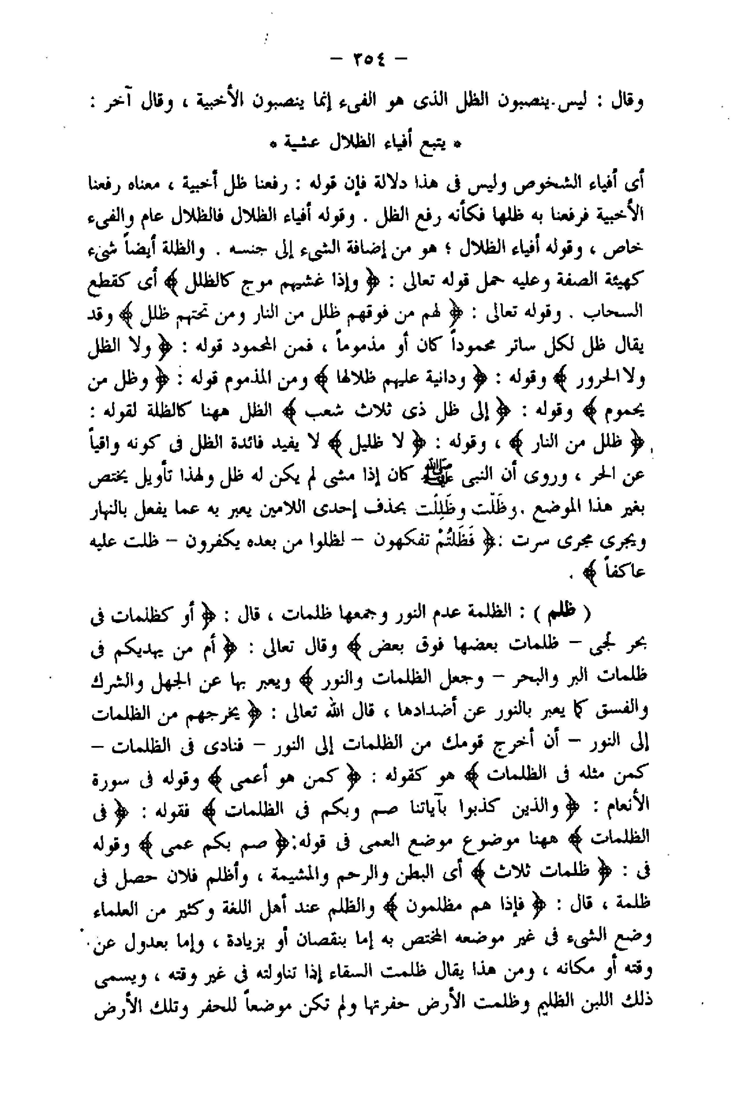 أي أفياء الشخوص وليس فى هذا دلالة فإن قوله: رفعنا ظل أخبية، معناه رفعنا الأخبية فرفعنا به ظلها فكأنه رفع الظل. وقوله أفياء الظلال فالظلال عام والفيء خاص، وقوله أفياء الظلال هو من إضافة الشيء إلى جنسه. والظلة أيضا شىء كهيئة الصفة وعليه حمل قوله تعالى: وَإِذا غَشِيَهُمْ مَوْجٌ كَالظُّلَلِ أي كقطع السحاب. وقوله تعالى: لَهُمْ مِنْ فَوْقِهِمْ ظُلَلٌ مِنَ النَّارِ وَمِنْ تَحْتِهِمْ ظُلَلٌ وقد يقال ظل لكل ساتر محمودا كان أو مذموما، فمن المحمود قوله: وَلَا الظِّلُّ وَلَا الْحَرُورُ وقوله: وَدانِيَةً عَلَيْهِمْ ظِلالُها ومن المذموم قوله: وَظِلٍّ مِنْ يَحْمُومٍ وقوله: إِلى ظِلٍّ ذِي ثَلاثِ شُعَبٍ الظلل هاهنا كالظلة لقوله: