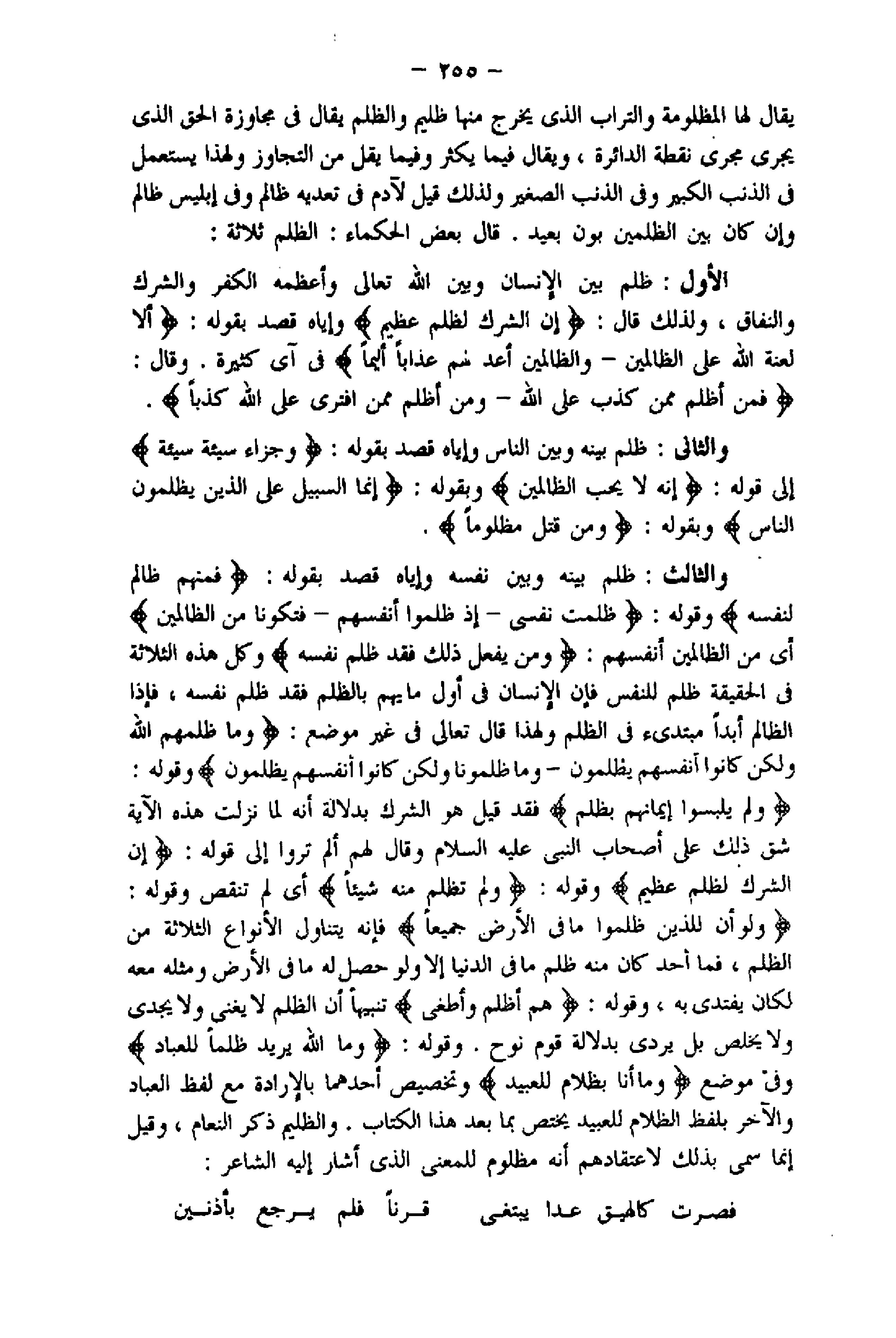 وَلَوْ أَنَّ لِلَّذِينَ ظَلَمُوا ما فِي الْأَرْضِ جَمِيعاً فإنه يتناول الأنواع الثلاثة من الظلم، فما أحد كان منه ظلم ما فى الدنيا إلا ولو حصل له ما فى الأرض ومثله معه لكان يفتدى به، وقوله: هُمْ أَظْلَمَ وَأَطْغى تنبيها أن الظلم لا يغنى ولا يجدى ولا يخلص بل يردى بدلالة قوم نوح. وقوله: وَمَا اللَّهُ يُرِيدُ ظُلْماً لِلْعِبادِ وفى موضع وَما أَنَا بِظَلَّامٍ لِلْعَبِيدِ وتخصيص أحدهما بالإرادة مع لفظ العباد والآخر بلفظ الظلام للعبيد يختص بما بعد هذا الكتاب. والظليم ذكر النعام، وقيل إنما سمى بذلك لاعتقادهم أنه مظلوم للمعنى الذي أشار إليه الشاعر: