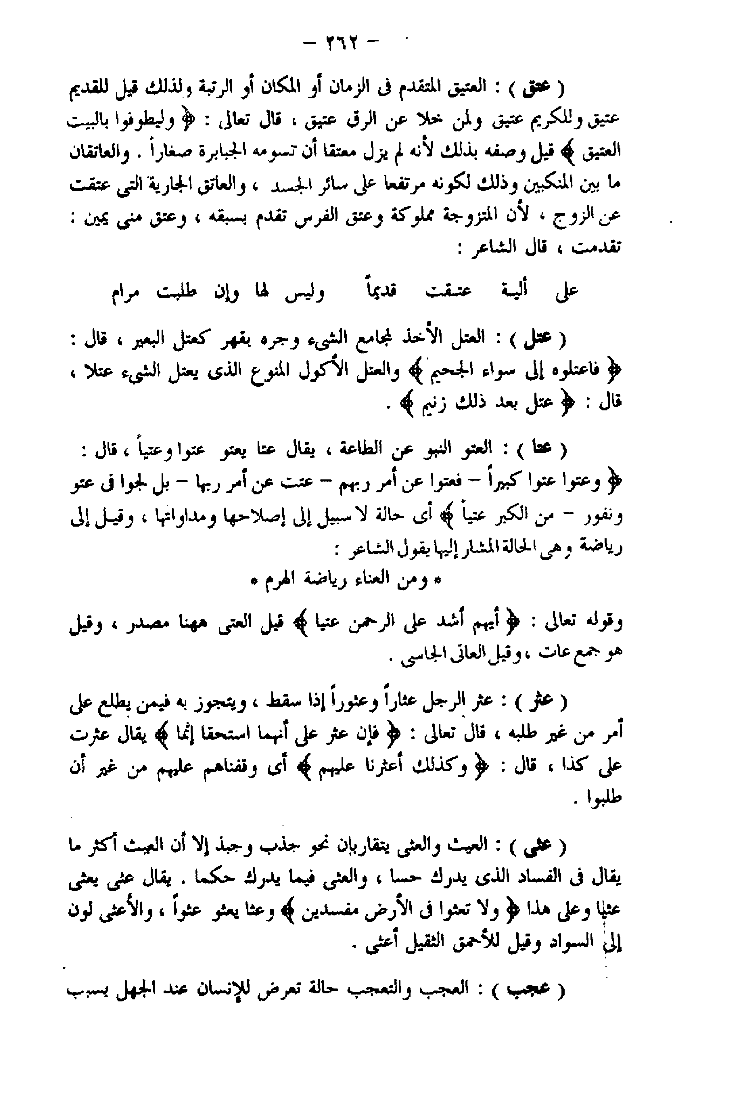(عتق) : العتيق المتقدم فى الزمان أو المكان أو الرتبة ولذلك قيل للقديم عتيق وللكريم عتيق ولمن خلا عن الرق عتيق، قال تعالى: وَلْيَطَّوَّفُوا بِالْبَيْتِ الْعَتِيقِ قيل وصفه بذلك لأنه لم يزل معتقا أن تسومه الجبابرة صغارا. والعاتقان ما بين المنكبين وذلك لكونه مرتفعا على سائر الجسد، والعاتق الجارية التي عتقت عن الزوج، لأن المتزوجة مملوكة وعتق الفرس تقدم بسبقه، وعتق منى يمين: