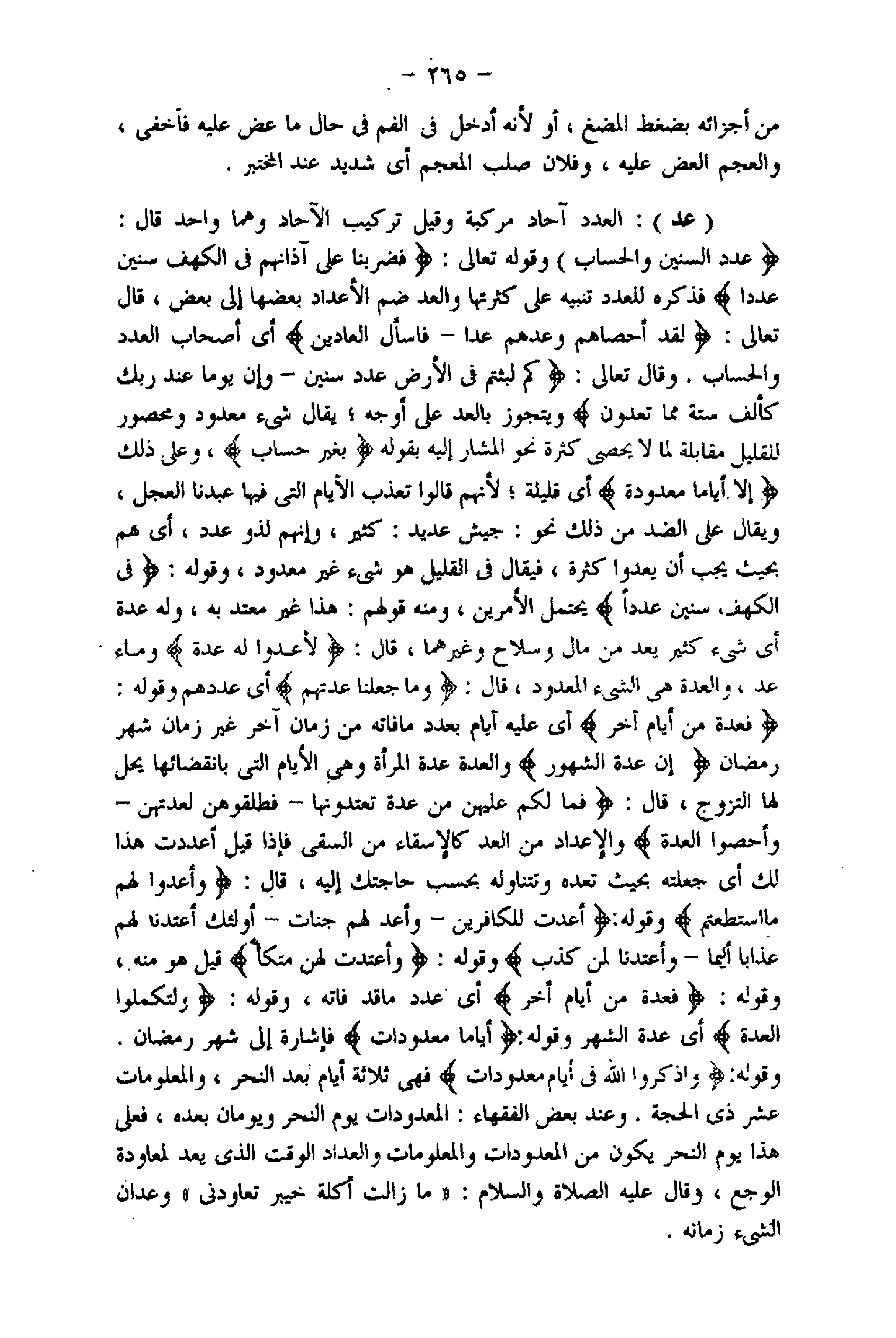 عَدَدَ السِّنِينَ وَالْحِسابَ وقوله تعالى: فَضَرَبْنا عَلَى آذانِهِمْ فِي الْكَهْفِ سِنِينَ عَدَداً فذكره للعدد تنبيه على كثرتها والعد ضم الأعداد بعضها إلى بعض، قال تعالى: لَقَدْ أَحْصاهُمْ وَعَدَّهُمْ عَدًّا- فَسْئَلِ الْعادِّينَ أي أصحاب العدد والحساب. وقال تعالى: كَمْ لَبِثْتُمْ فِي الْأَرْضِ عَدَدَ سِنِينَ- وَإِنَّ يَوْماً عِنْدَ رَبِّكَ كَأَلْفِ سَنَةٍ مِمَّا تَعُدُّونَ ويتجوز بالعد على أوجه يقال شىء معدود ومحصور للقليل مقابلة لما لا يحصى كثرة نحو المشار إليه بقوله: بِغَيْرِ حِسابٍ، وعلى ذلك إِلَّا أَيَّاماً مَعْدُودَةً أي قليلة لأنهم قالوا تعذب الأيام التي فيها عبدنا العجل، ويقال على الضد من ذلك نحو: جيش عديد: كثير، وإنهم لذو عدد، أي هم بحيث يجب أن يعدوا كثرة، فيقال فى القليل هو شىء غير معدود، وقوله: فِي الْكَهْفِ سِنِينَ عَدَداً يحتمل الأمرين، ومنه قولهم: هذا غير معتد به، وله عدة أي شىء كثير يعد من مال وسلاح وغيرهما، قال: لَأَعَدُّوا لَهُ عُدَّةً وماء عد، والعدة هى الشيء المعدود، قال: وَما جَعَلْنا عِدَّتَهُمْ أي عددهم وقوله: