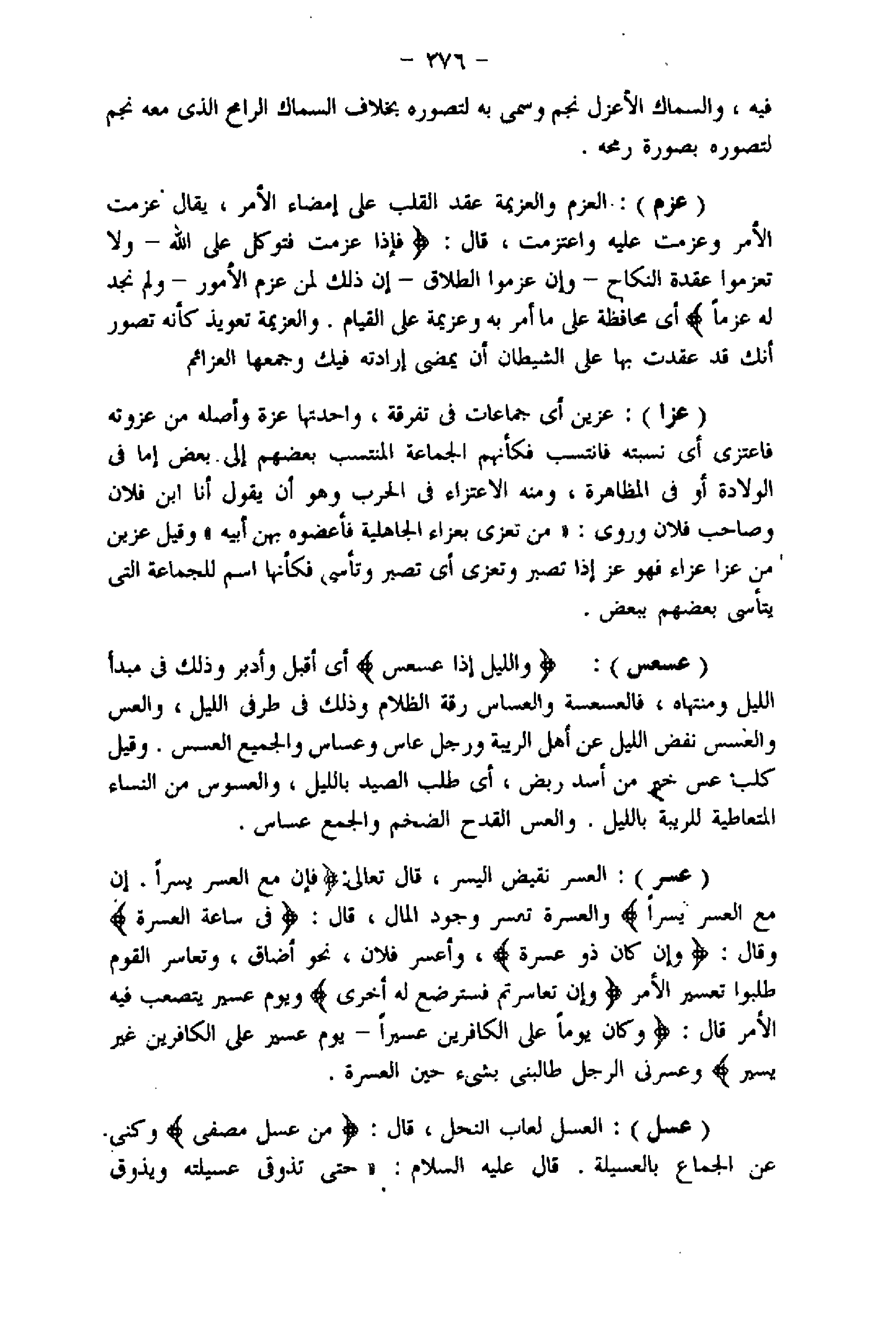 (عزم) : العزم والعزيمة عقد القلب على إمضاء الأمر، يقال عزمت الأمر وعزمت عليه واعتزمت، قال: فَإِذا عَزَمْتَ فَتَوَكَّلْ عَلَى اللَّهِ- وَلا تَعْزِمُوا عُقْدَةَ النِّكاحِ- وَإِنْ عَزَمُوا الطَّلاقَ- إِنَّ ذلِكَ لَمِنْ عَزْمِ الْأُمُورِ- وَلَمْ نَجِدْ لَهُ عَزْماً أي محافظة على ما أمر به وعزيمة على القيام. والعزيمة تعويذ كأنه تصور أنك قد عقدت بها على الشيطان أن يمضى إرادته فيك وجمعها العزائم (عزا) : عزين أي جماعات فى تفرقة، واحدتها عزة وأصله من عزوته فاعتزى أي نسبته فانتسب فكأنهم الجماعة المنتسب بعضهم إلى بعض إما فى الولادة أو فى المظاهرة، ومنه الاعتزاء فى الحرب وهو أن يقول أنا ابن فلان وصاحب فلان